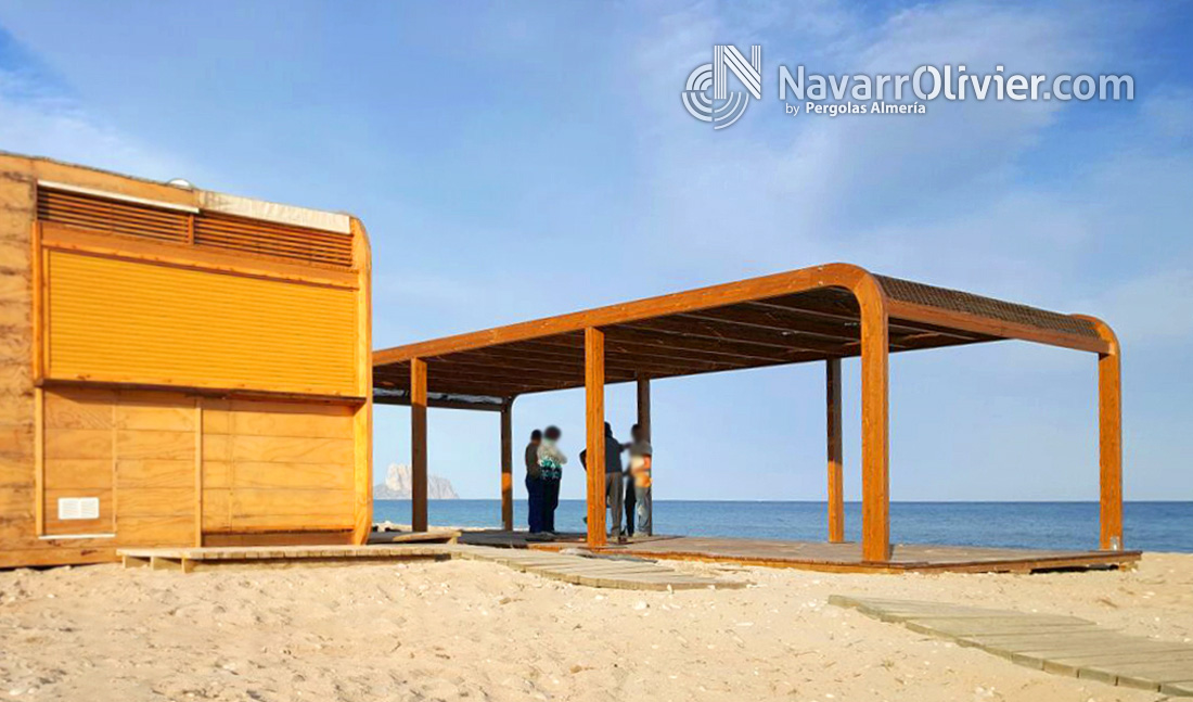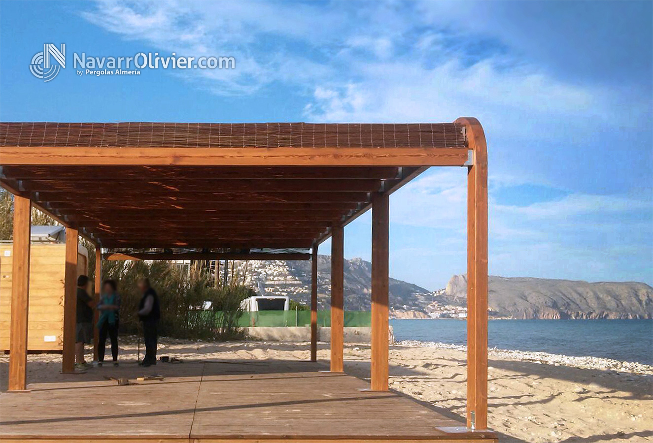 Construcción compuesta por suelo en módulos de madera ranurada tratada en autoclave. Pérgola de sombraje de diseño singular fabricada en madera laminar unida mediante anclajes y estribos metálicos galvanizados, siguiendo el estilo del chiringuito, cubierta en cañizo natural.