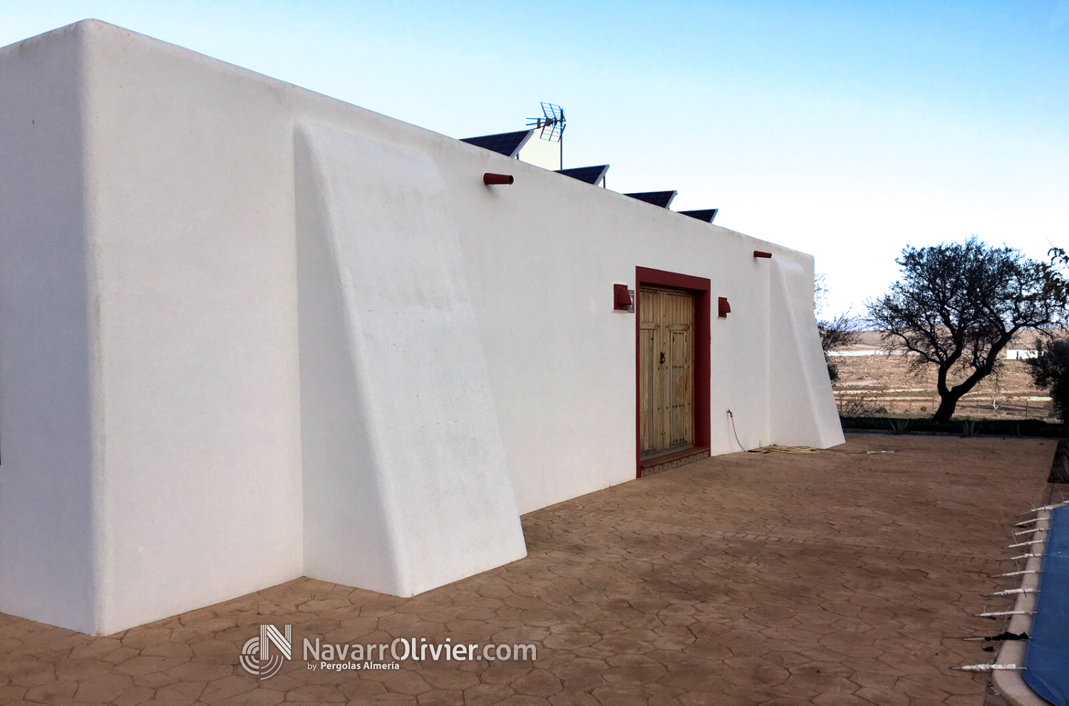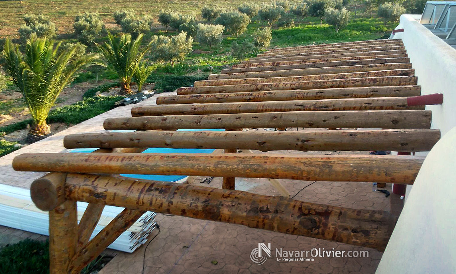 Pérgola adosada en tronco natural con cubierta en madera aserrada machihembrada impermeabilizada con exterior en brezo natural.