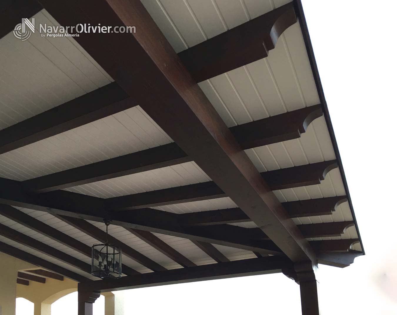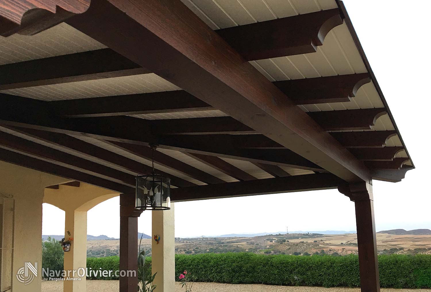 Pérgola para casa familiar en Los Gallardos, Almería. Por su ubicación geográfica este enclave andaluz goza de la cálida luz del sol mas de 300 días al año lo que permite disfrutar todo el año de estas estancias exteriores. La pérgola construida en vigas de madera laminada cuentan con capiteles de remate, la estructura principal acabada en negro contrasta con el friso construido en tablero blanco.