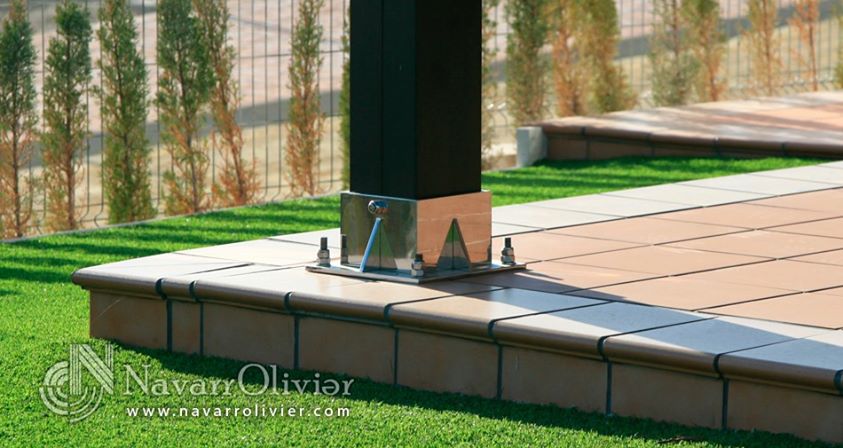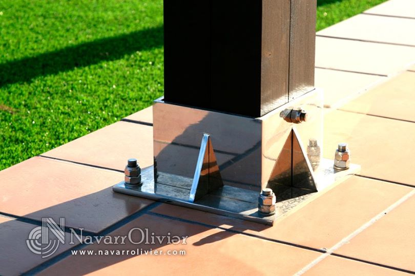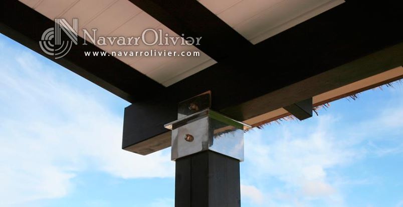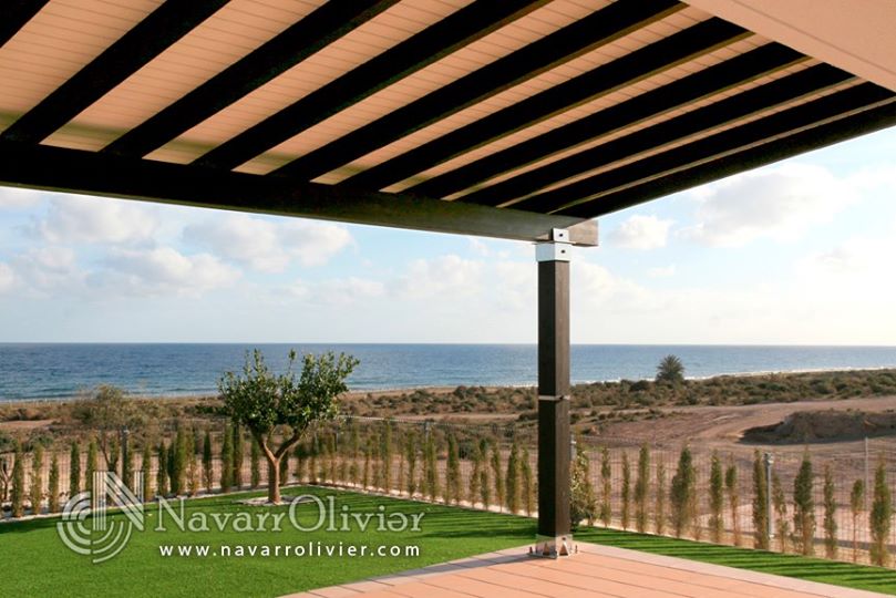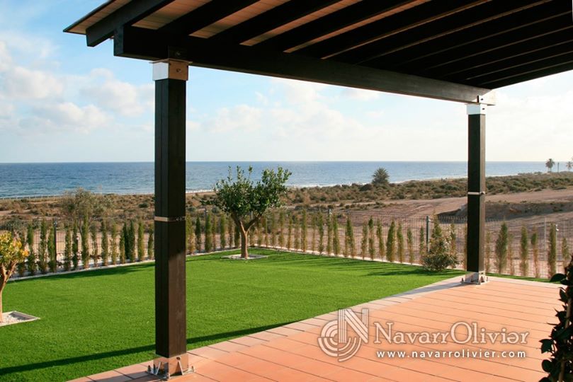 Pérgola para duplex en primera linea de playa construida en madera para exterior. Estructura adosada con pendiente a 1 agua construida en madera laminada encolada GL 24 y maciza C24 con herrajes en acero inoxidable de inspiración marina. Construcción minimalista acabada en barnices de base acuosa y poro abierto en color wengue para la estructura y blanco para el friso de la cubierta. Impermeabilización en tela asfáltica con acabado decorativo exterior en brezo natural nacional. Porche en madera y acero para vivienda particular en urbanización Mar de Pulpí, San Juan de los Terreros, Pulpí, Almería.