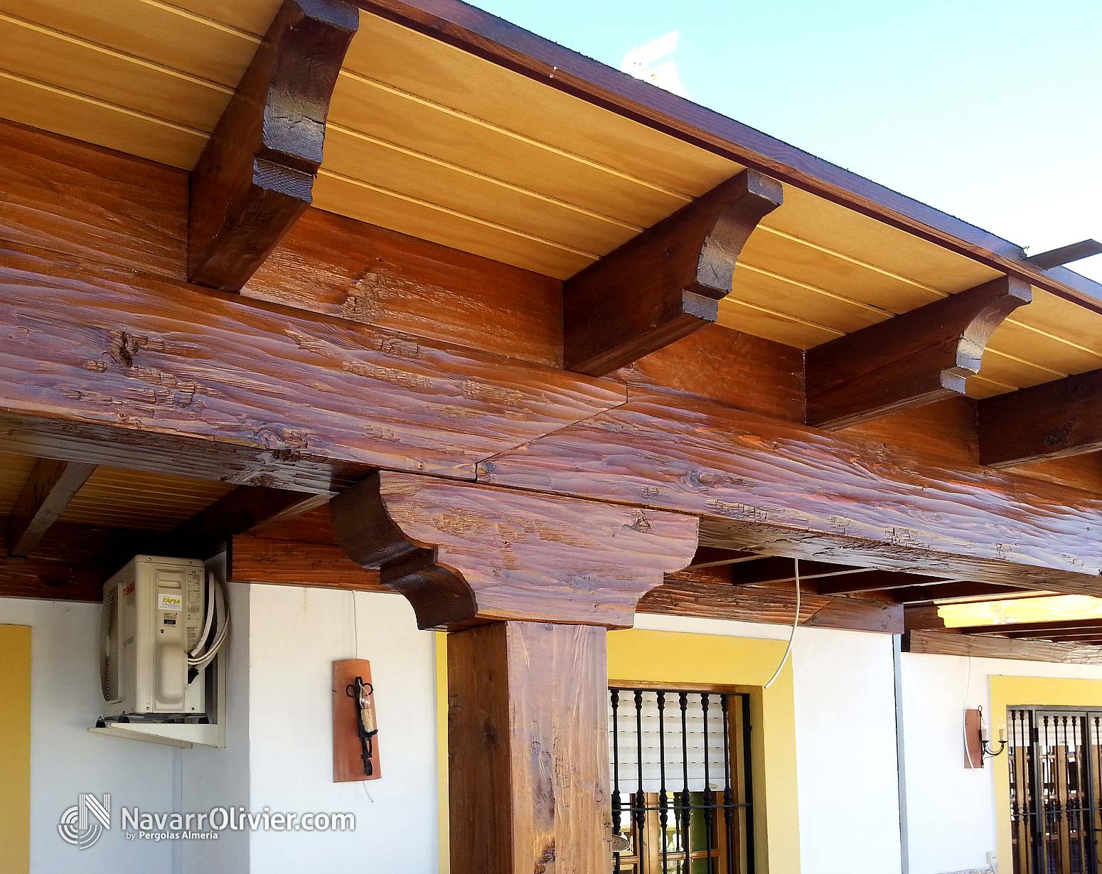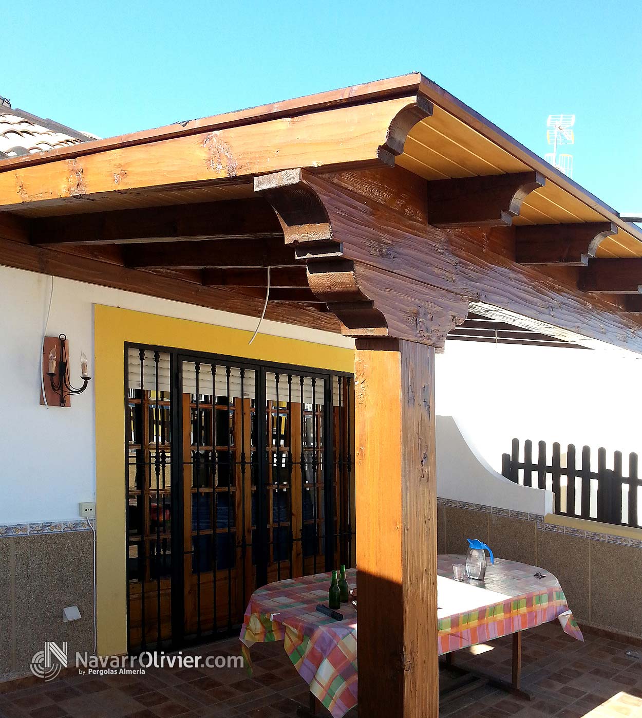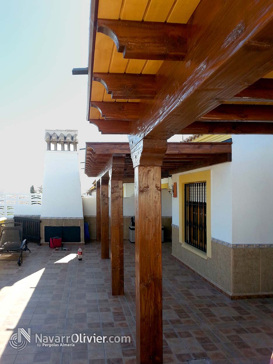 Construcción de 2 pérgolas de madera para exterior. Fabricación y montaje de porches en vigas de madera laminada y madera maciza cepillada estilo rústico acabada en barniz satinado. Estructura con pilares rematados por capitel, friso en tablero fenólico ranurado, las construcciones tienen por finalidad reducir las horas de exposición solar de las habitaciones de la vivienda de uso vacacional. Reforma de vivienda con estructuras de madera en Palomares, Almería.