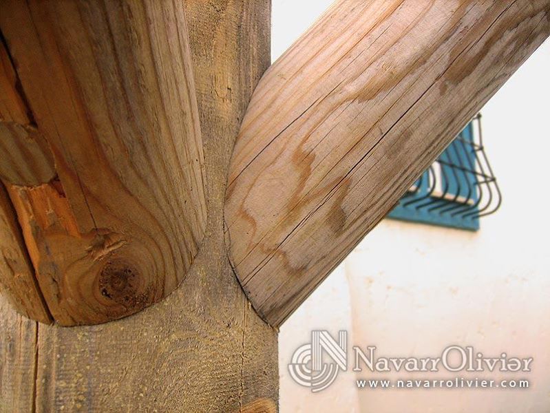Pérgola adosada para vivienda de segunda residencia, construida en tronco de madera calibrado.