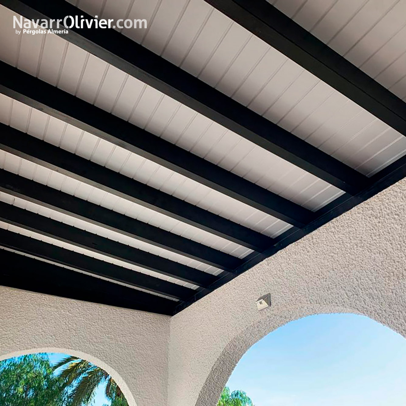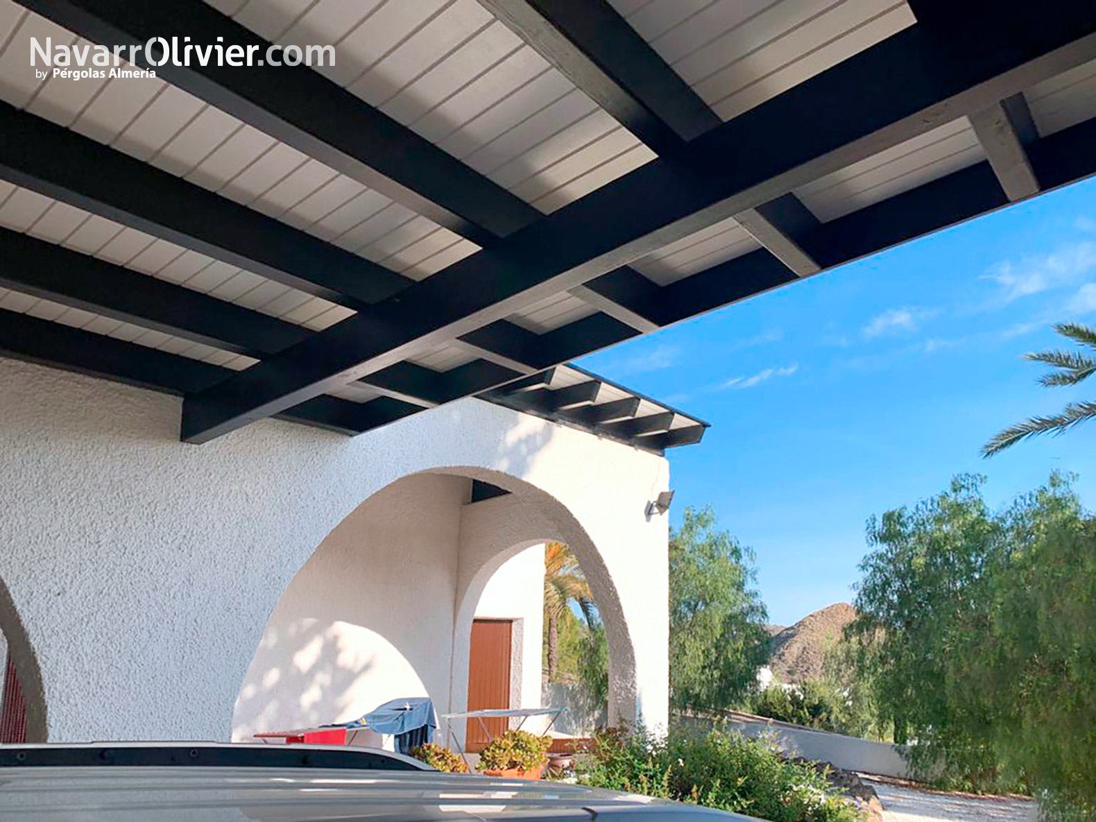 La construcción fabricada en madera laminada descansa sobre pilares de madera laminada de 20 x 20 cm, con cubierta, al igual que la del porche, acabado en blanco para aportar luminosidad.