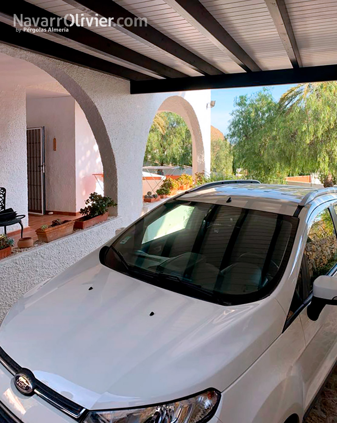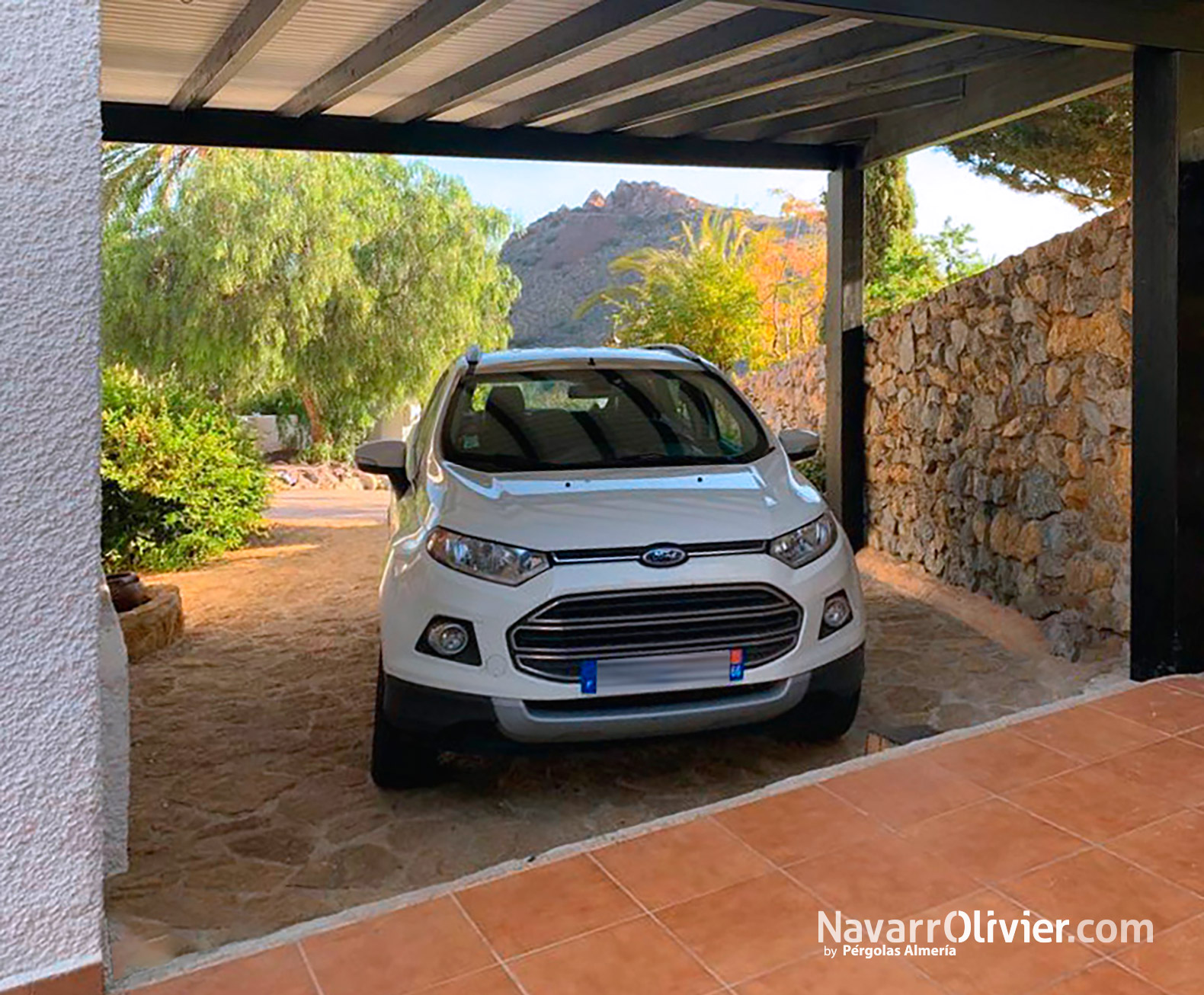 En la zona lateral de la casa se construyo una cubierta adosada trapezoidal, siguiendo la forma del terreno, que sirve de refugio o aparcamiento para vehículos.