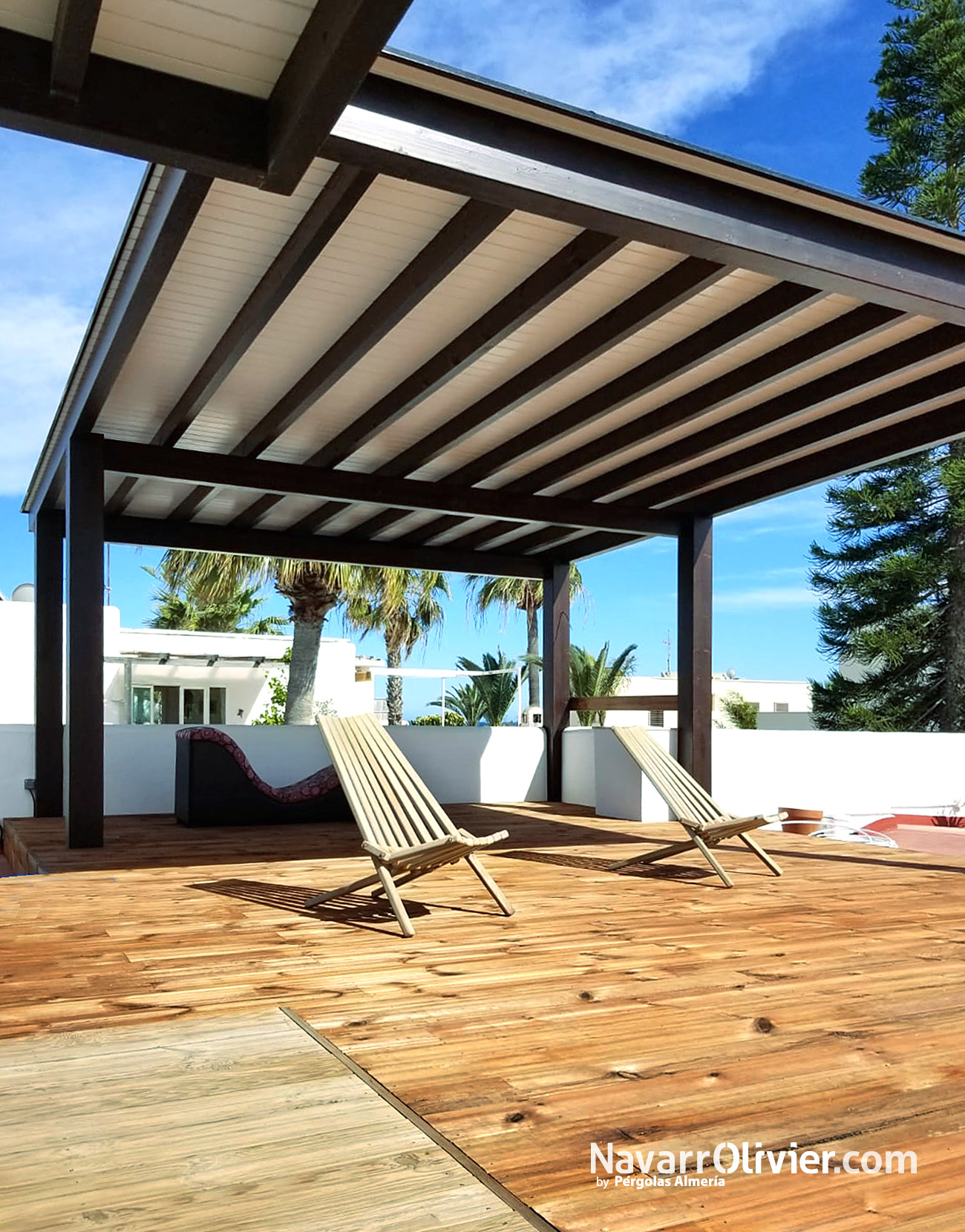 Para poner en valor el espacio irregular de la azotea se construyeron 2 pérgolas de madera cuya estructura principal y pilares se fabricaron en madera laminada GL24 que les aportan la solidez estructural que, en conjunto con los cabios de madera maciza y la cubierta de tablero fenólico ranurado crean un espacio estético, durable y de bajo mantenimiento.