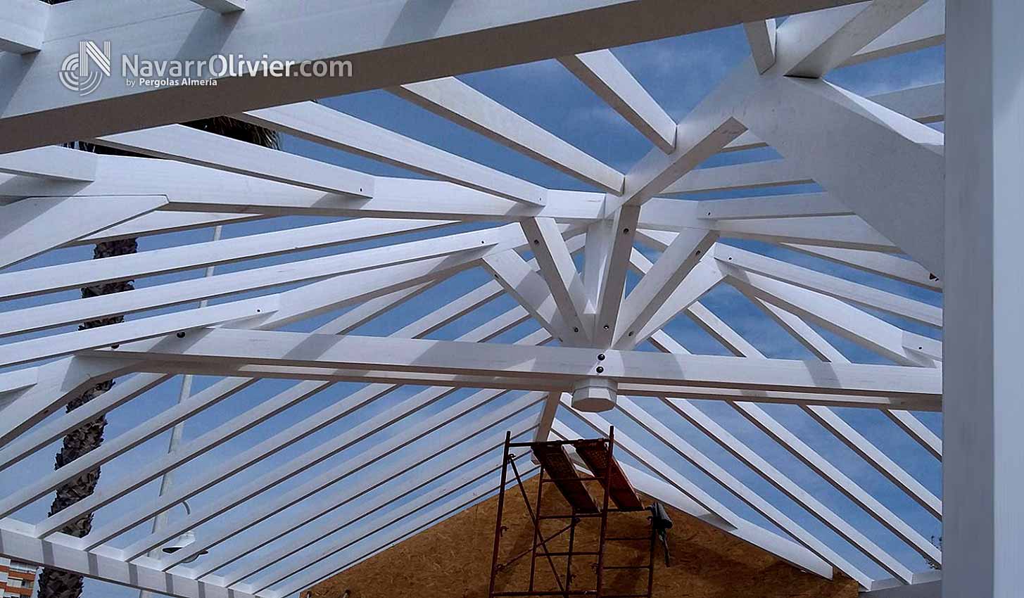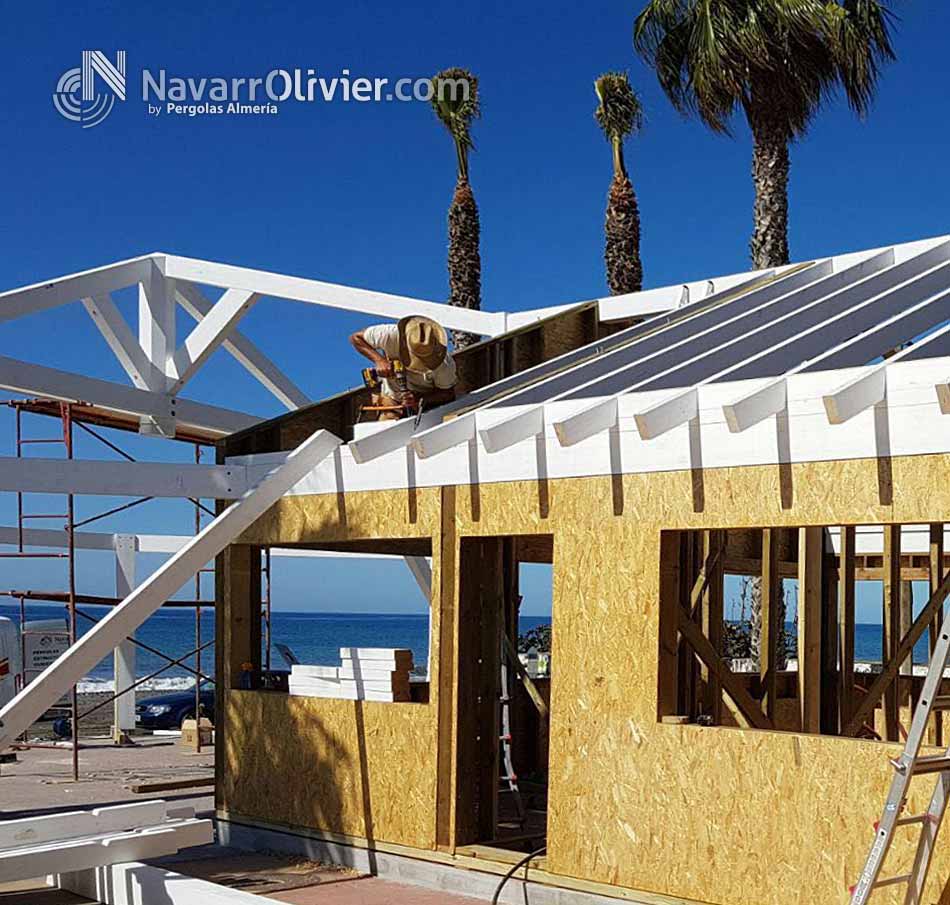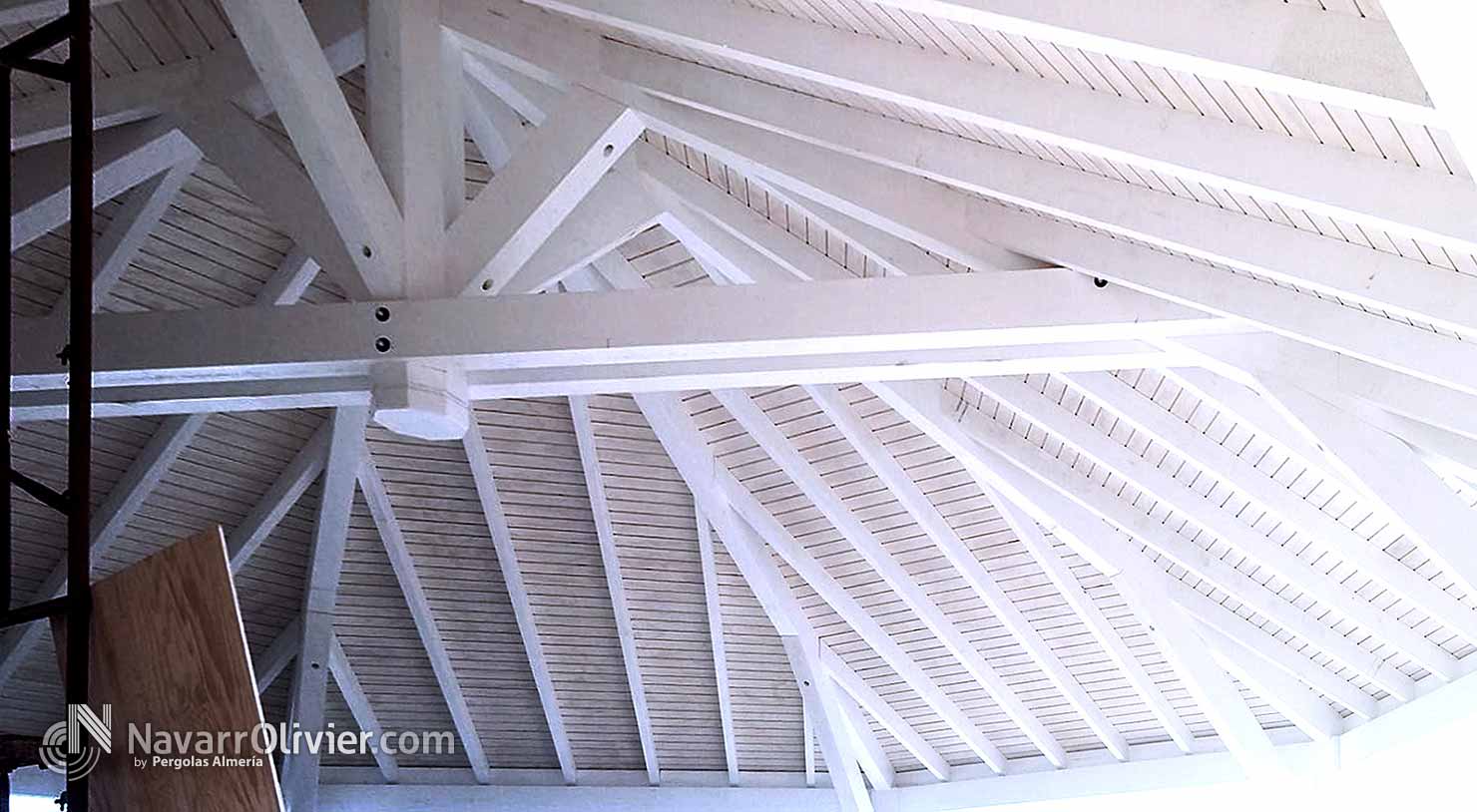 Estructura principal de cubierta y zona de terraza en vigas de madera laminar con correas en madera maciza, friso en tablero fenólico ranurado.