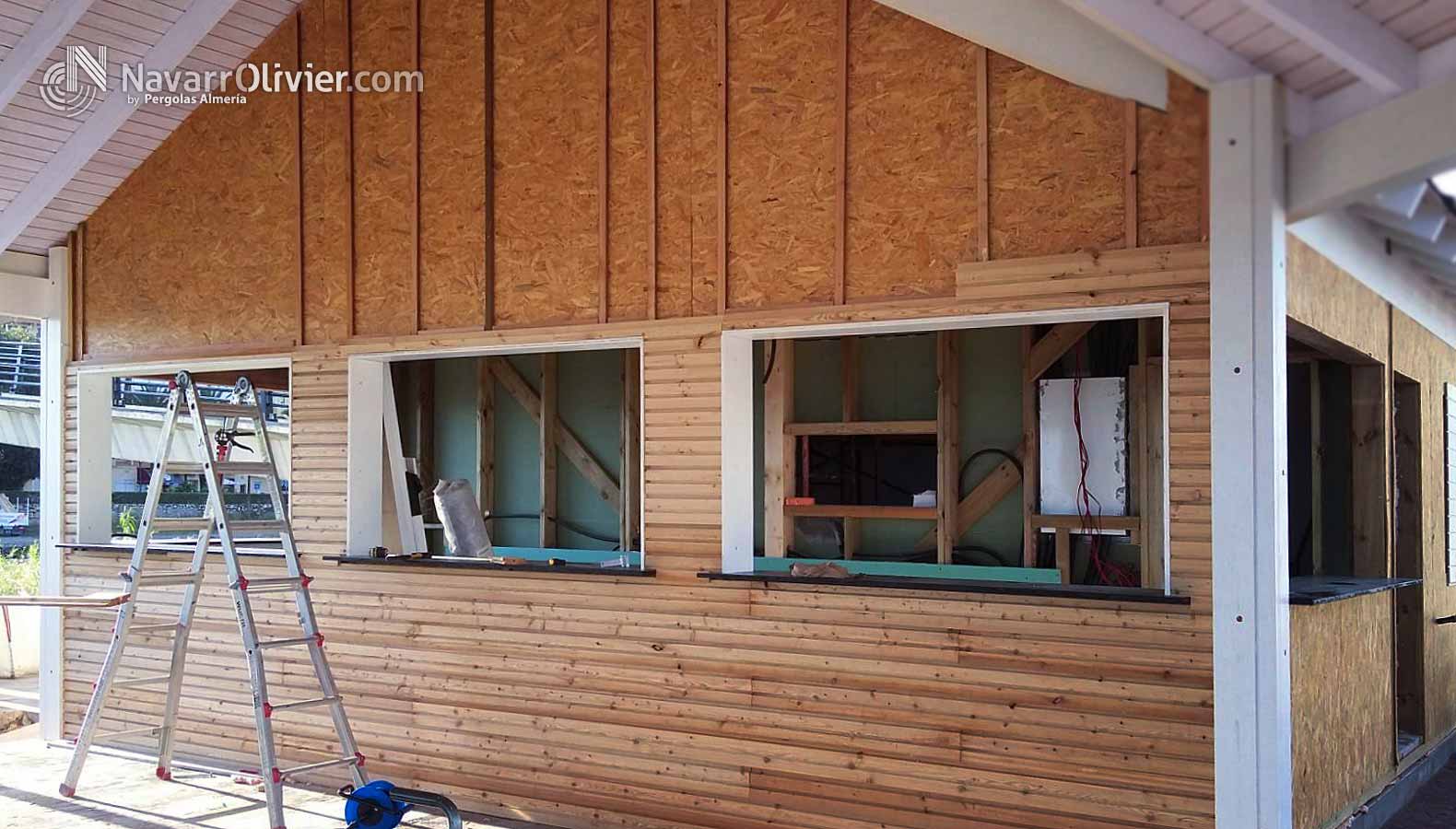 Construcción en entramado ligero con fachada ventilada acabado exterior en bardage de alerce, aislamiento en lana de roca piel interior en pladur hidrófugo, alicatado en sector de cocina.