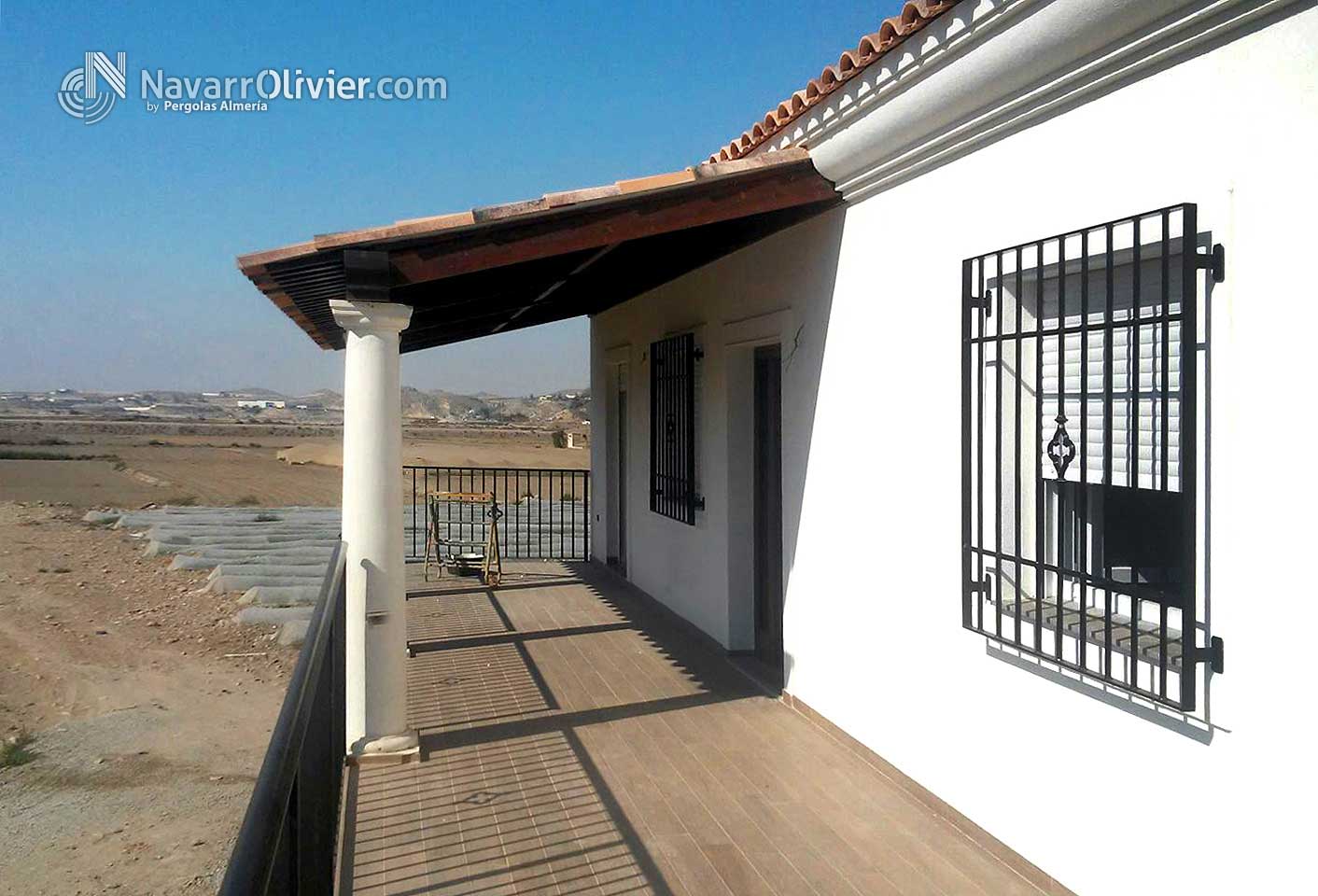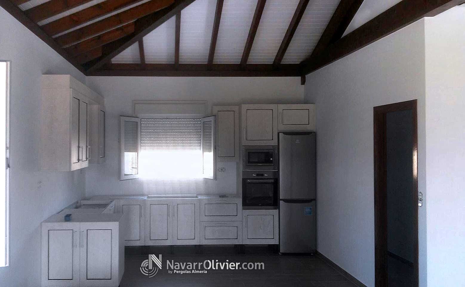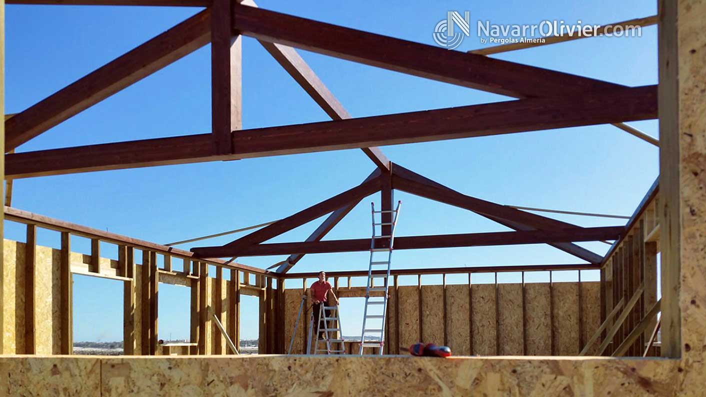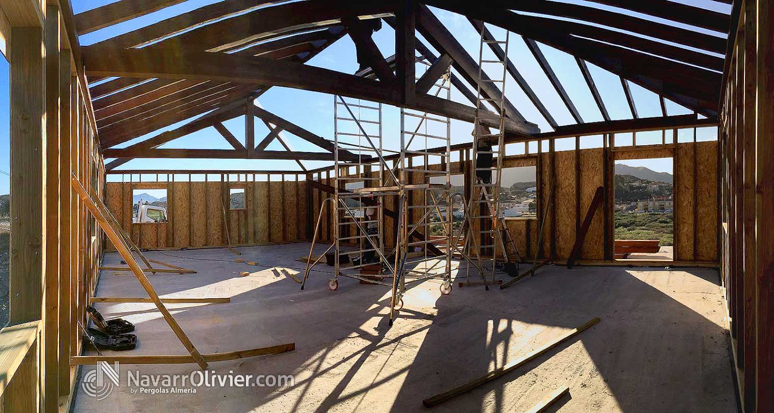 La estructura principal de la cubierta está construida en vigas de madera laminar GL 24 con correas en madera maciza C24, panel sandwich con machihembrado visto, tela Tyvek y teja envejecida ventilada.
