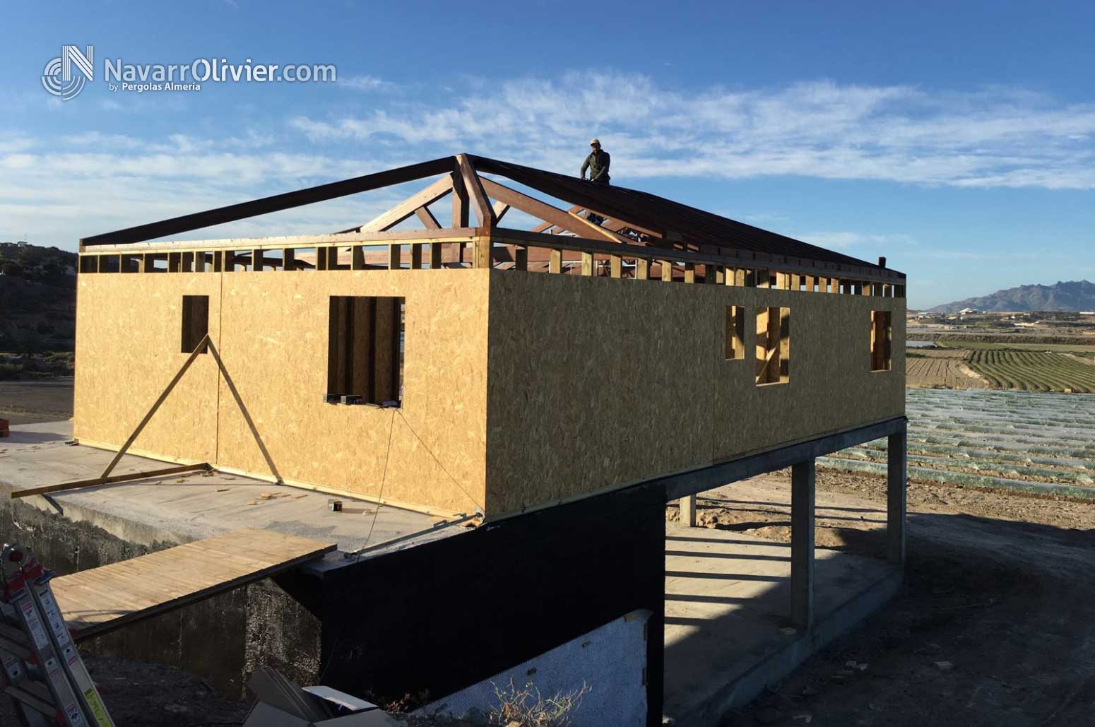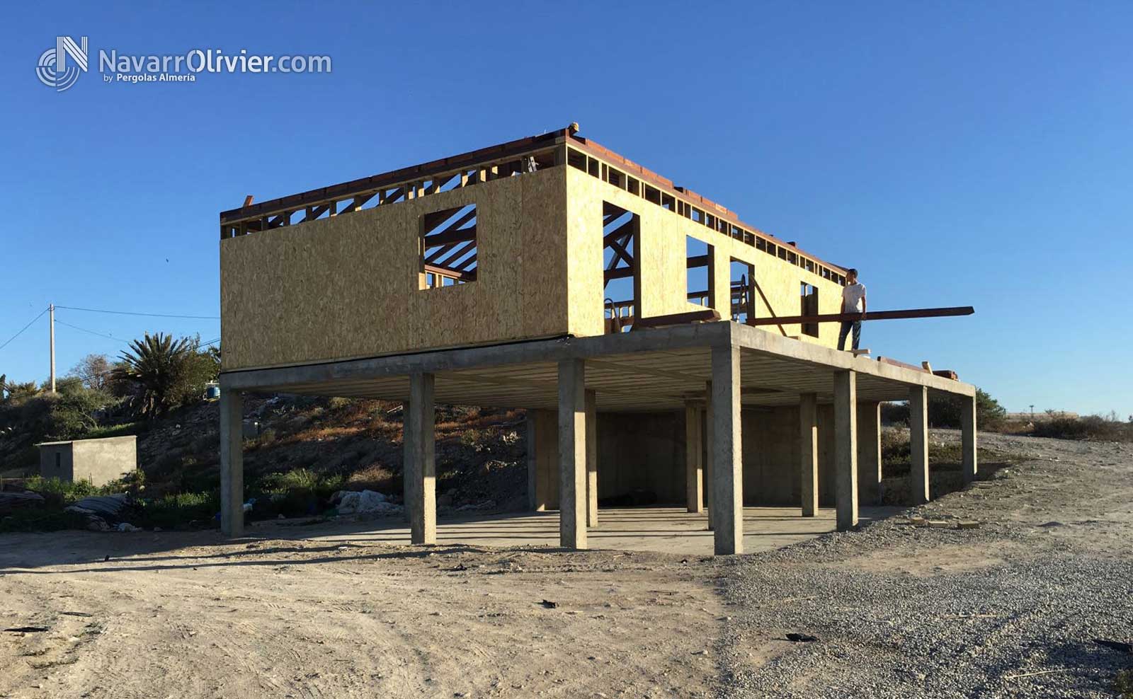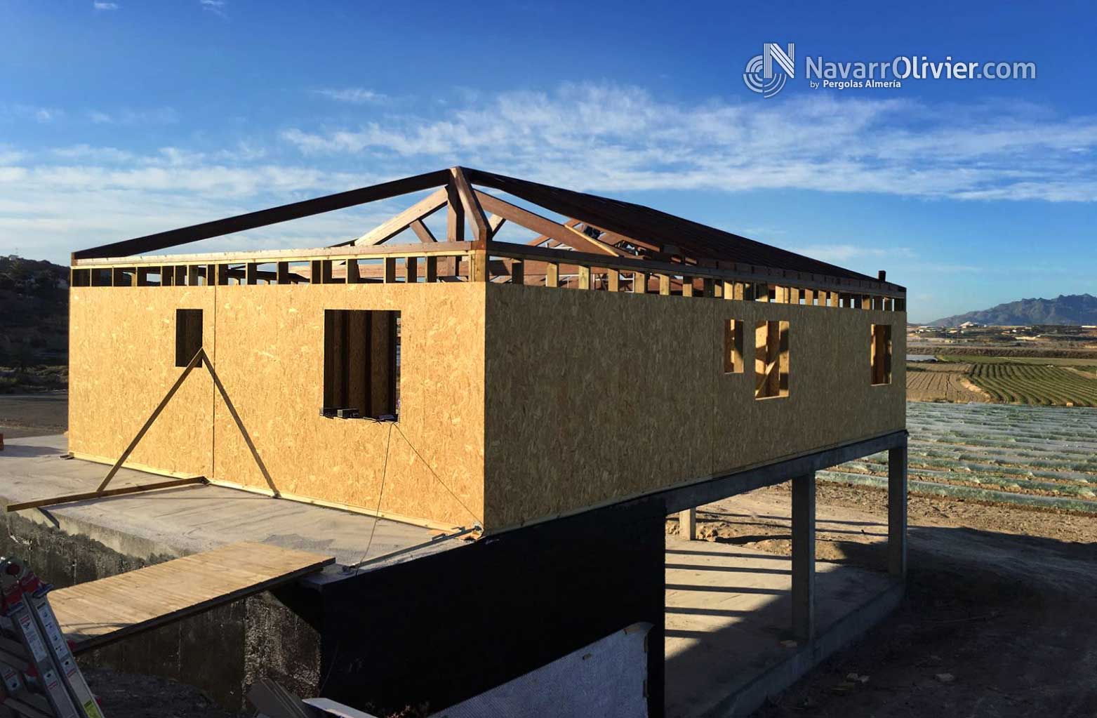 Construcción de vivienda unifamiliar de 180 m2 sobre forjado de obra. La edificación construida en entramado ligero con muros en panel osb con 14 cm de aislación en lana de roca barrera de vapor, para evitar la condensación, vacio técnico para cañerías e instalación eléctrica acabado en al interior en pladur. El exterior de los muros lleva un recubrimiento aislante de paneles de poliuretano, con malla de armadura en fibra de vidrio y mortero acrílico de acabado: SATE (Sistema de Aislamiento Térmico para Exterior).