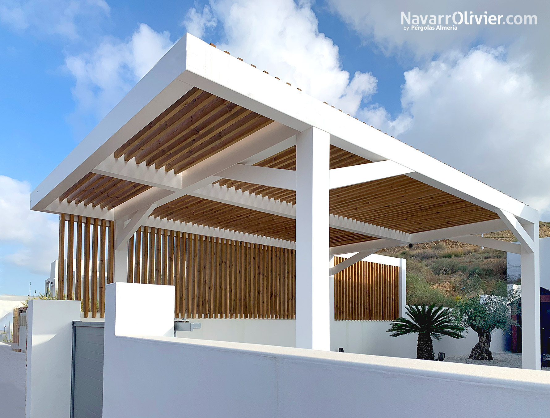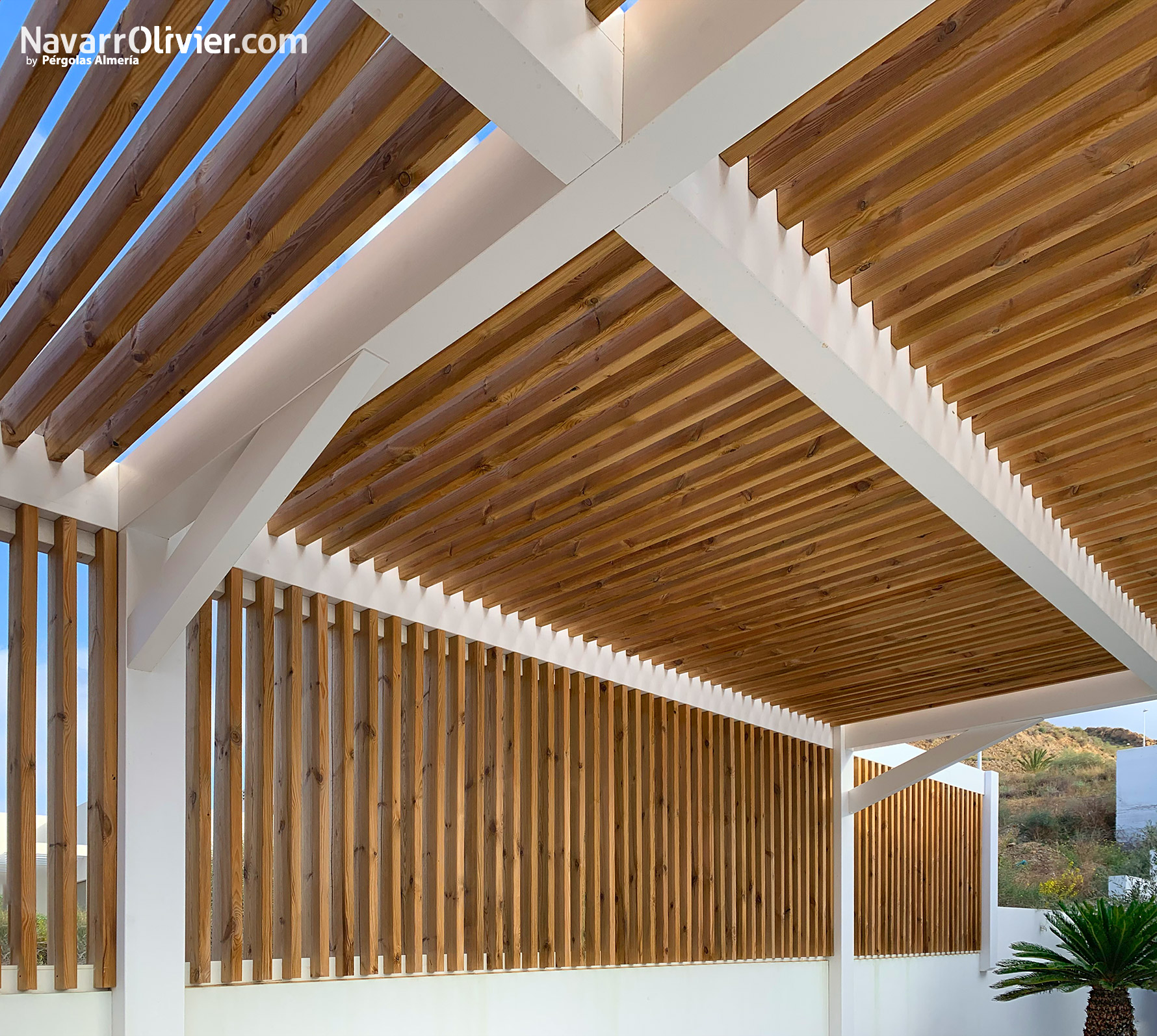 Para este proyecto utilizamos vigas de madera laminada estructural con un tratamiento para exterior acabado en blanco.