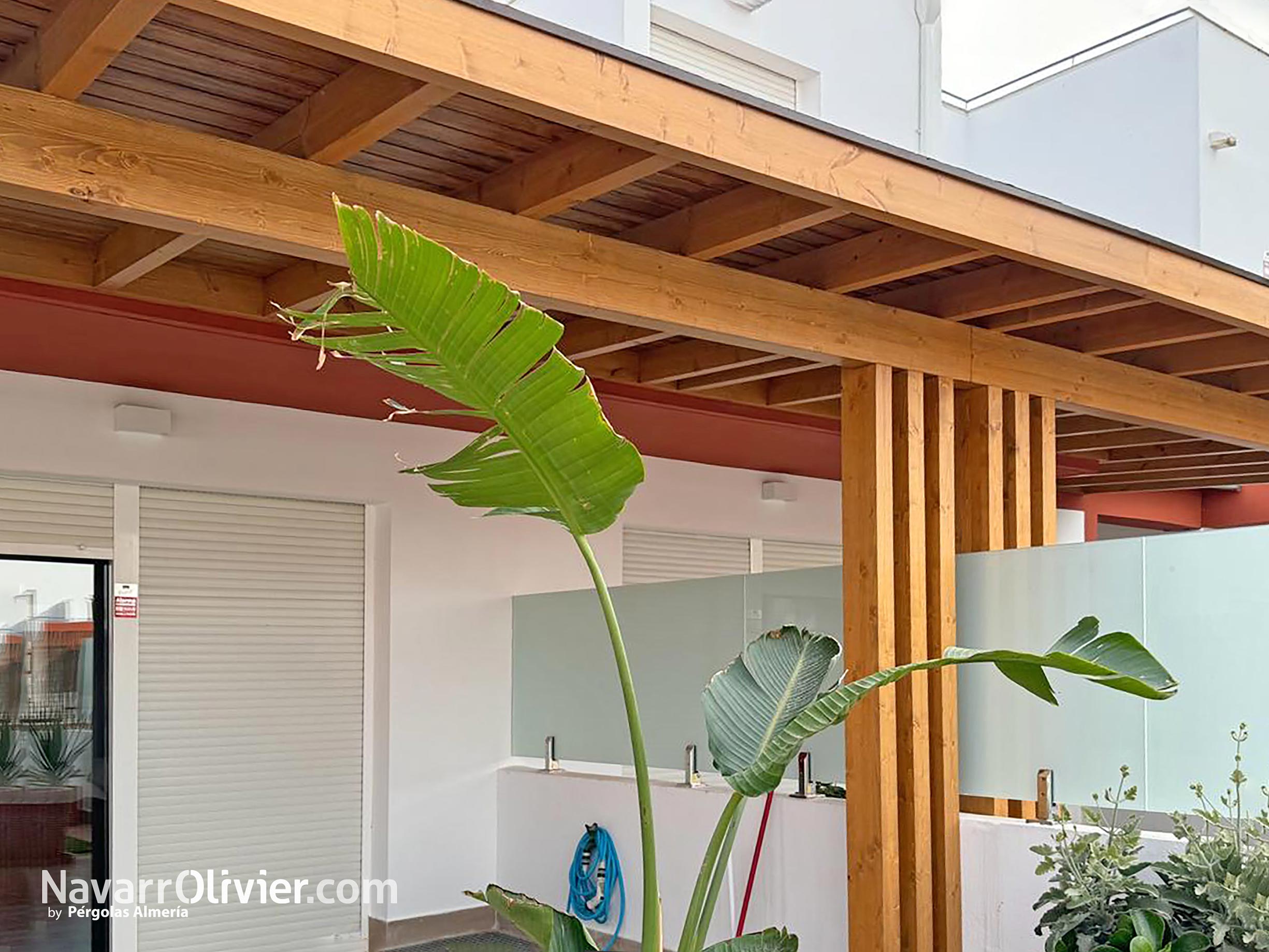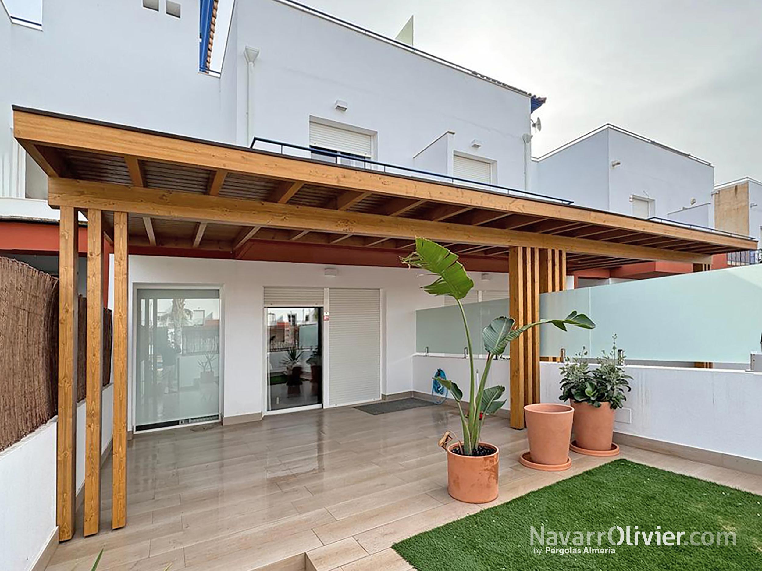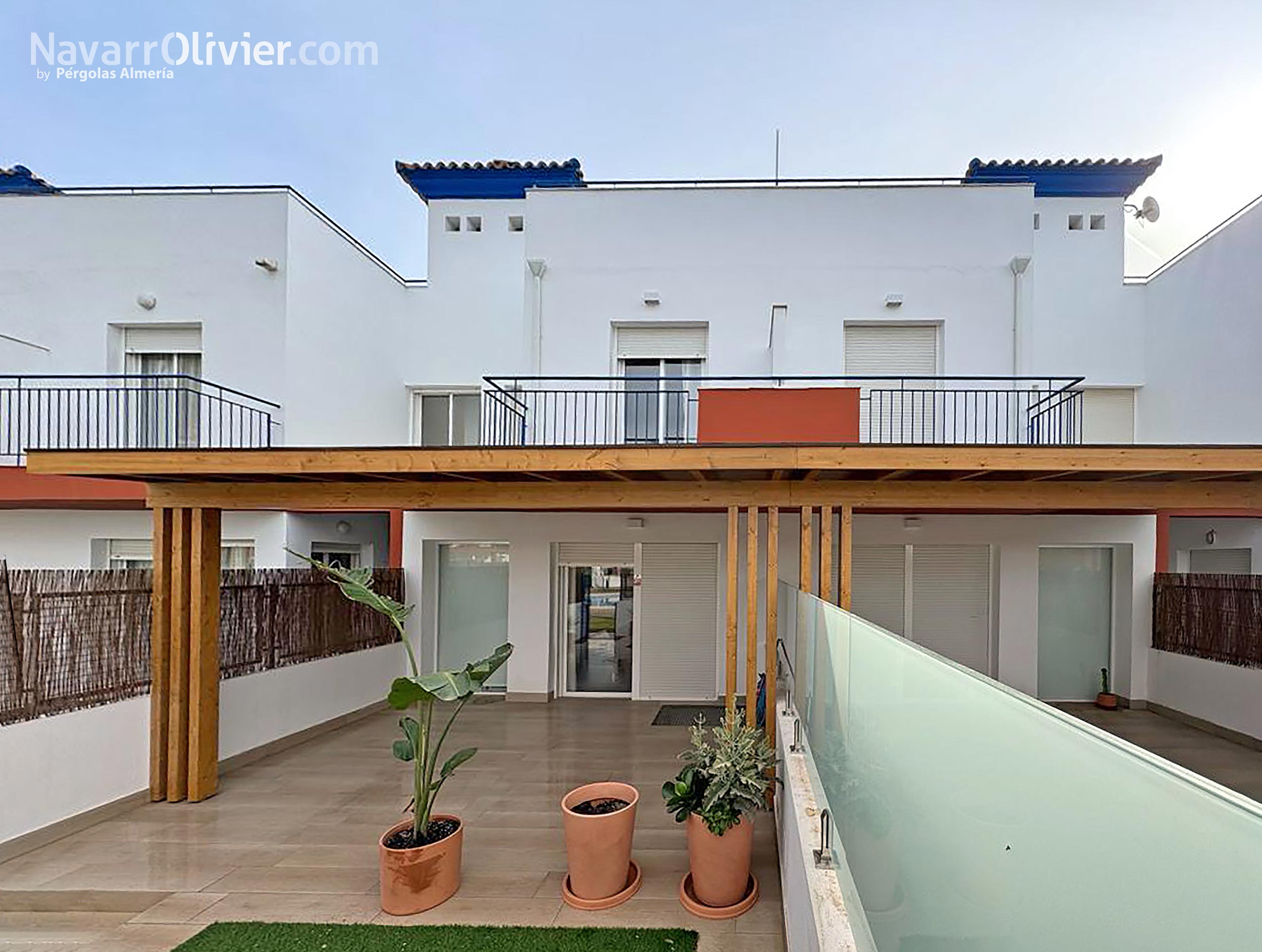 Pérgola minimalista de madera para adosados en Almerimar, Almería, Andalucía.