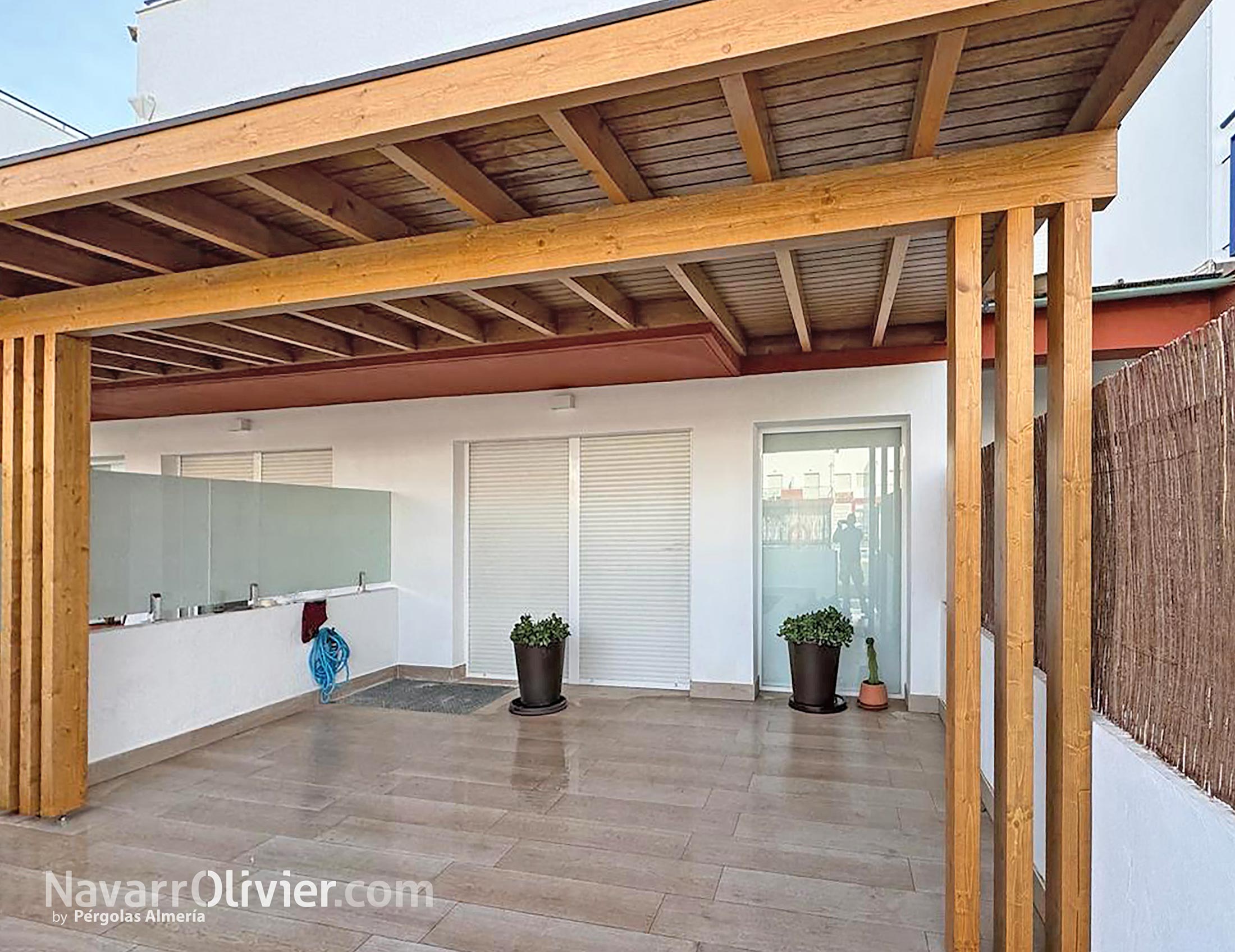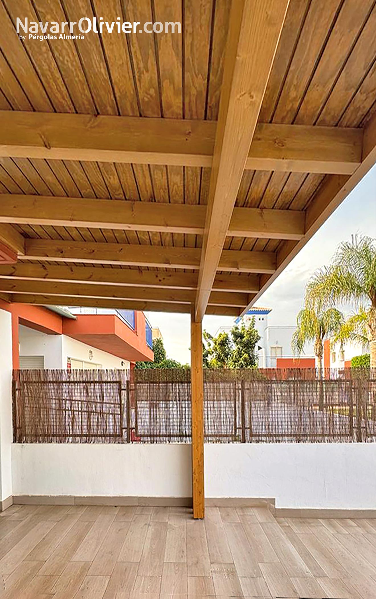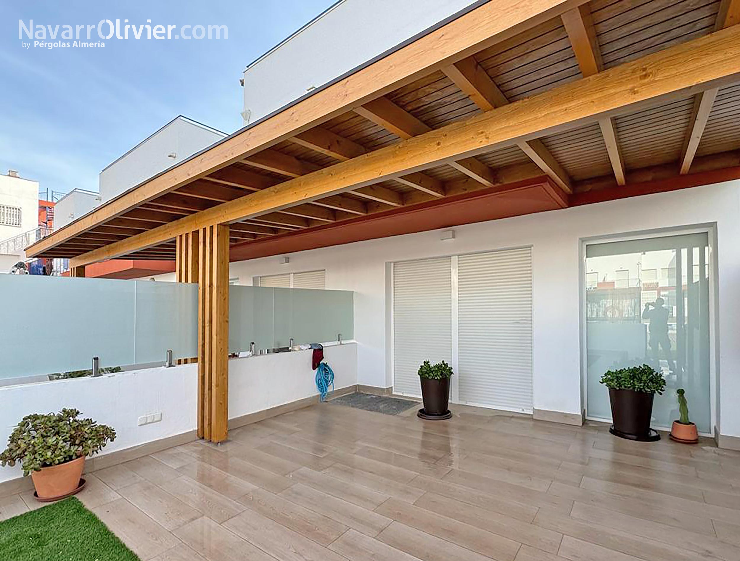Pérgola minimalista de madera para adosados en Almerimar, Almería, Andalucía.