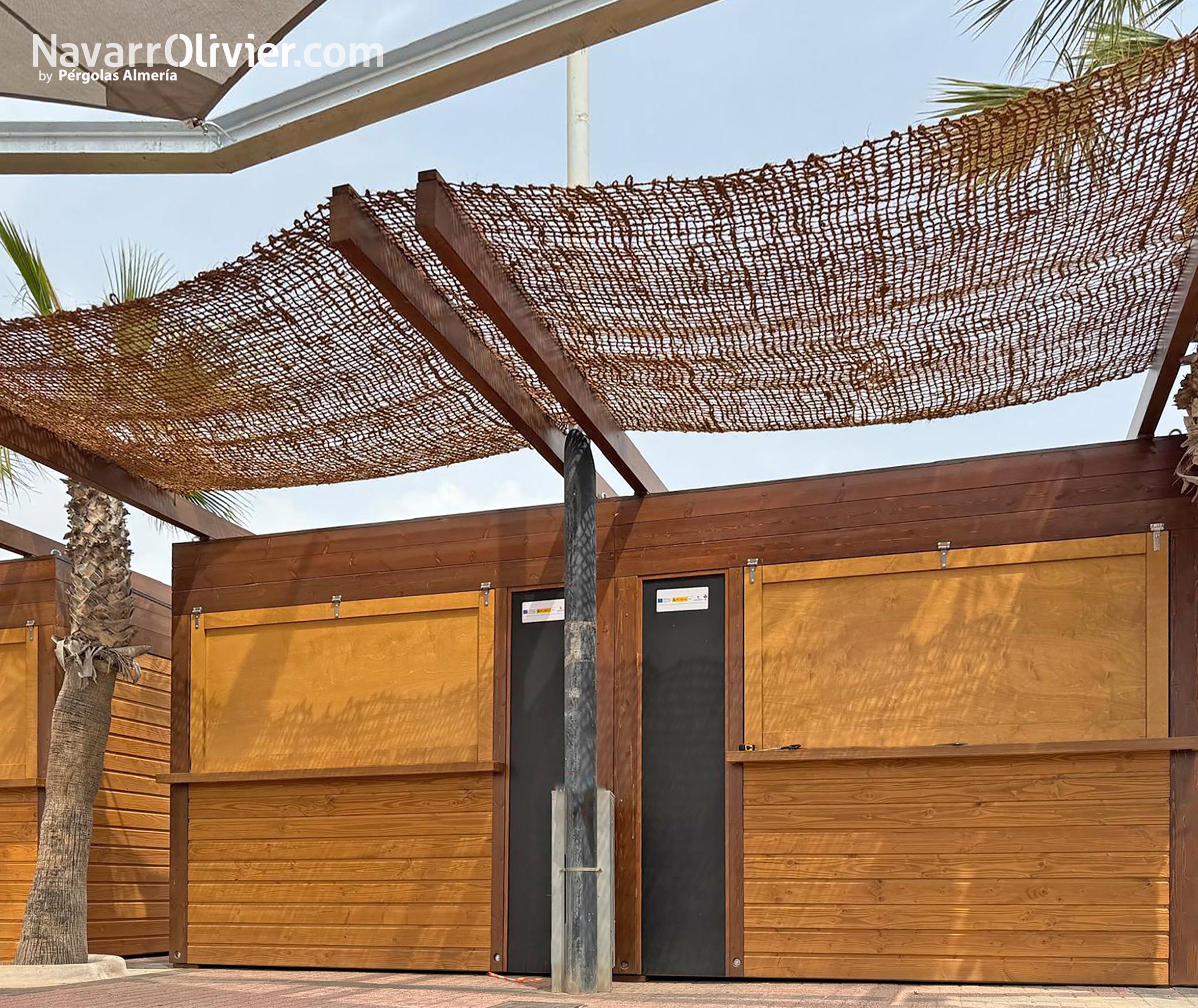 Construimos estos kioscos modulares con pérgola en voladizo con cubierta de red de fibra vegetal.