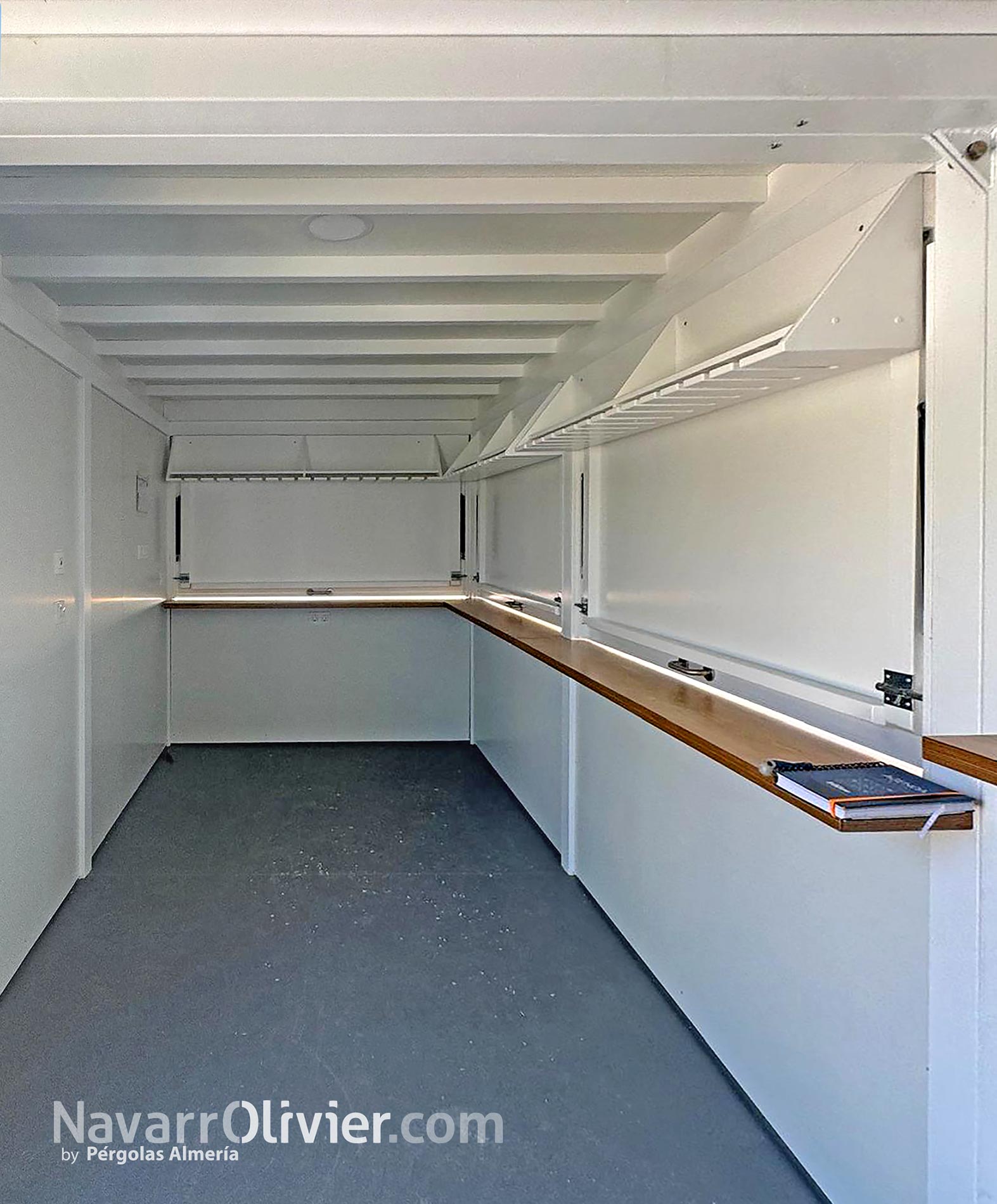 La construcción personalizada modular está configurada en forma de "L" en su interior se integran a la perfección zonas de cocina y barra, optimizando el flujo de trabajo. En el frente del módulo, está la terraza construida con un deck de tarima antideslizante de madera tratada en autoclave, que no solo amplía el espacio, sino que delimita un espacio acogedor y exclusivo.