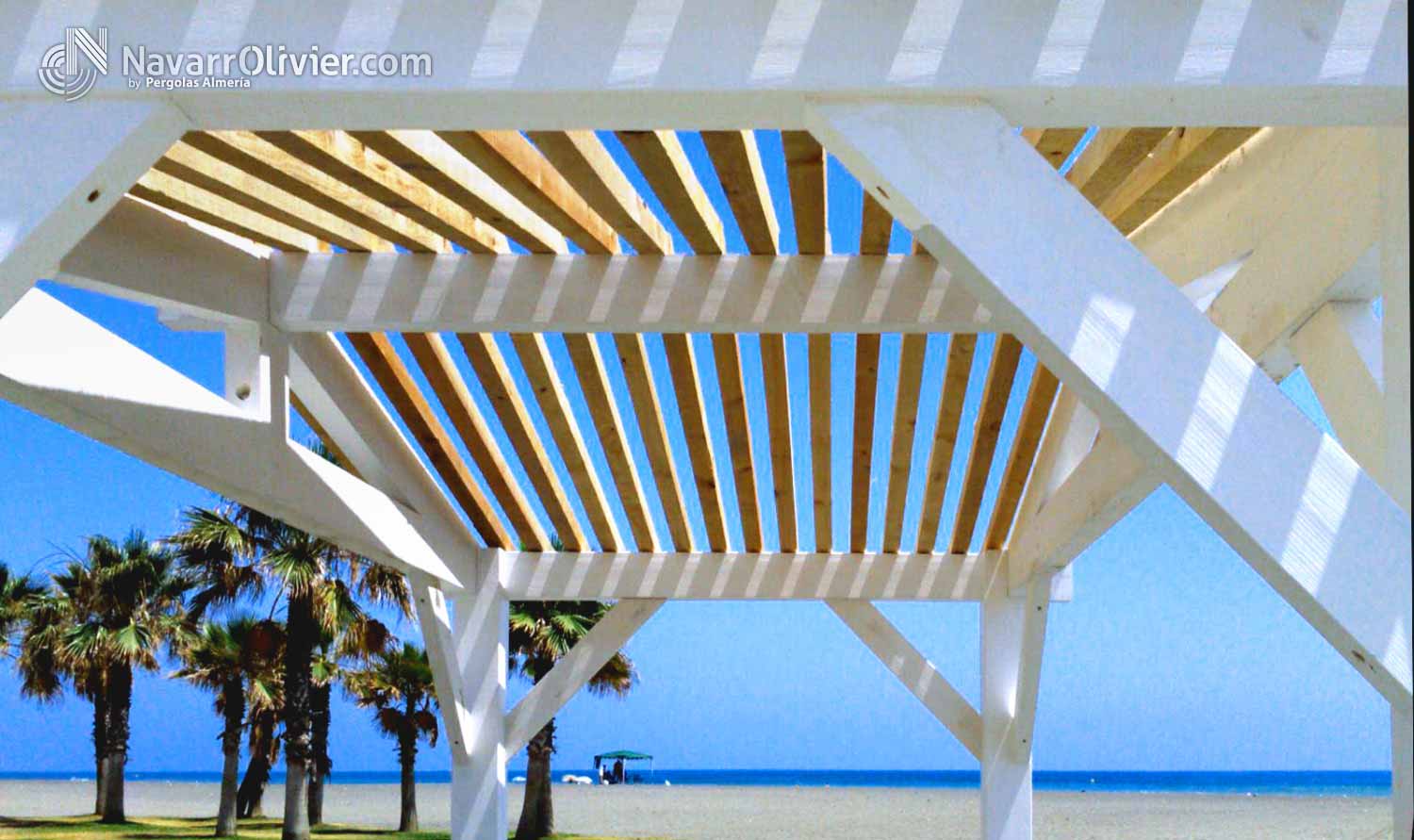 Terraza con pérgola desmontable para sombraje en madera para exterior acabado en blanco neutro, suelo en tarima autoclave clase IV con ranurado antideslizante acabado en marrón (tanatone), cubierta en pvc ignífugo y toldos corta viento enrollables con zona transparente sobre guías de aluminio.