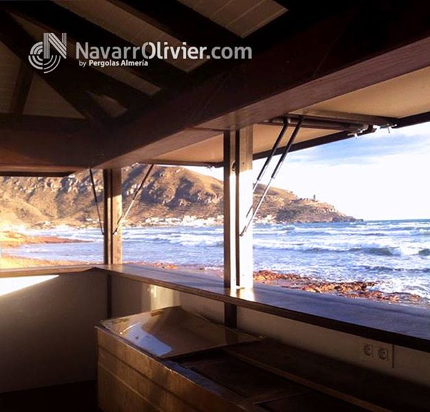 Dada la escasa superficie de la playa la configuración del establecimiento se completa con 2 pérgolas con pendiente a 2 aguas sobre la diagonal, con toldos enrollables corta viento con una gran superficie transparente que permite apreciar los fantásticos atardeceres junto al mar.