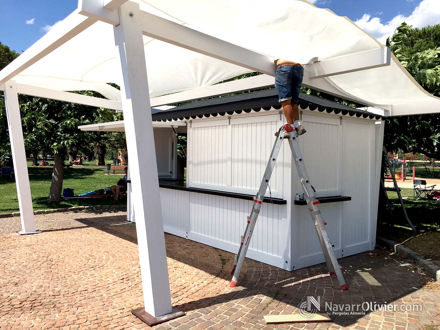 La construcción se transporta equipada con la instalación eléctrica sujeta a normativa lista para funcionar. El quiosco cuenta con una pérgola adosada construida en madera laminada con pilares extra plomados con cubierta en pvc micro perforado.