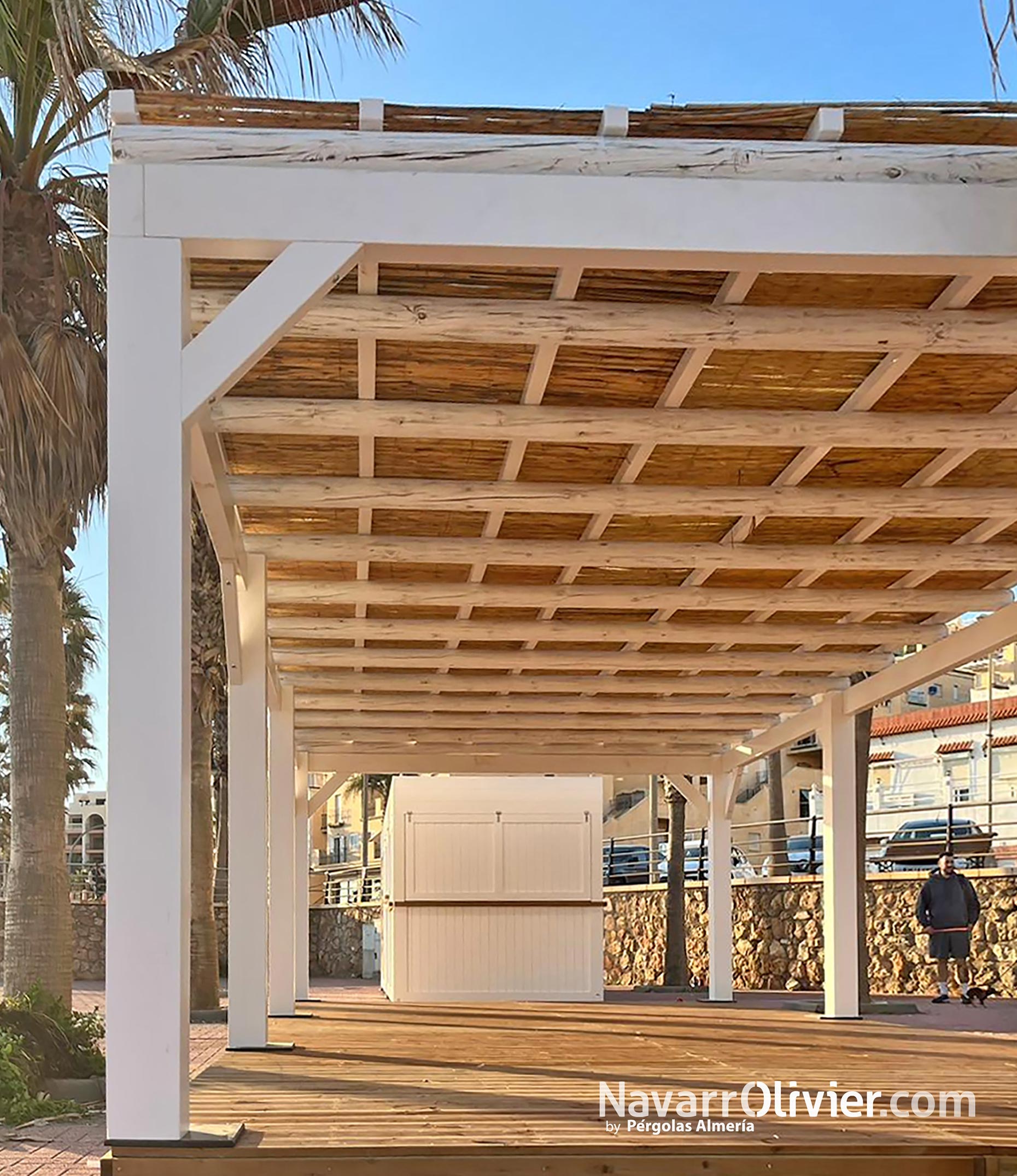 Instalamos el pavimento de tarima tratada en autoclave cubierta por una pérgola de sombra natural ventilada, construida de madera y tronco calibrado acabados en blanco con cubierta de cañizo de caña entera ecológica.