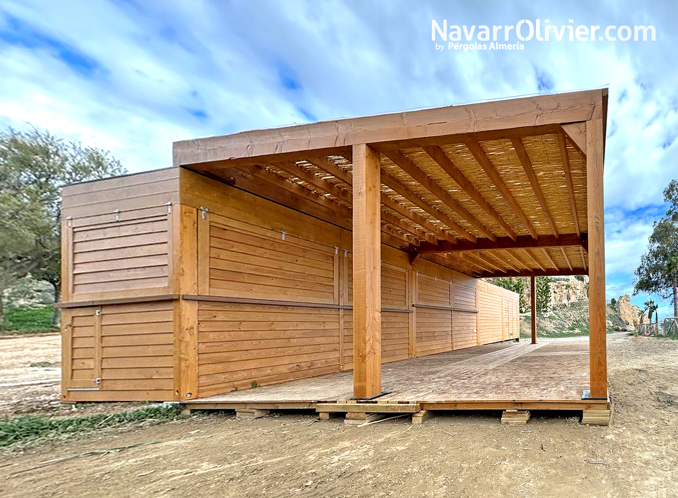 La terraza del chiringuito cuenta con tarima autoclave y pérgola de sombraje que protege a los clientes del sol y la lluvia.