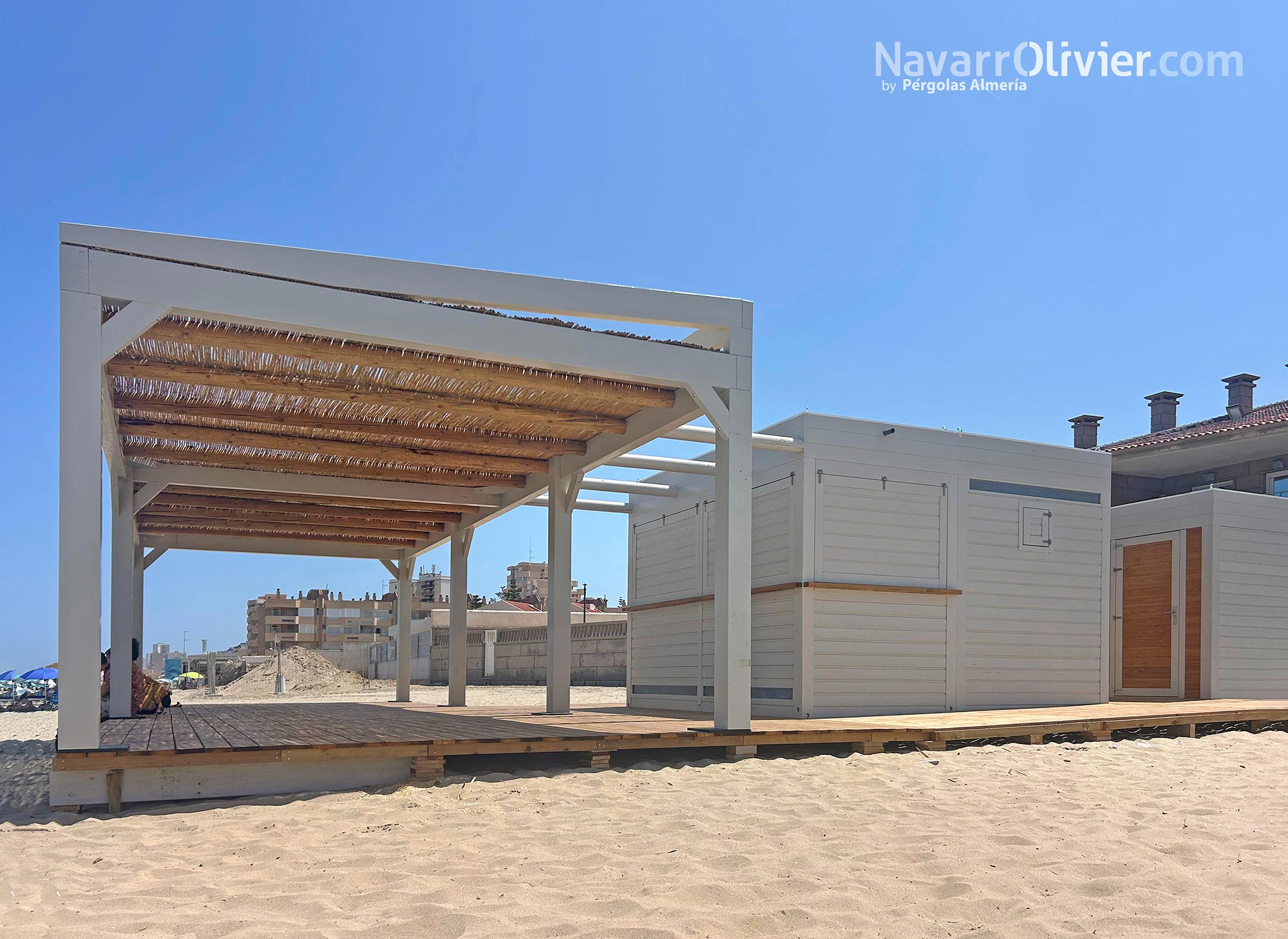 El perímetro del chiringuito al igual que la terraza cuentan con un pavimento desmontable construido en módulos de tarima autoclave anti deslizante, que facilita el montaje, desmontaje, transporte y almacenamiento. La terraza cuenta con una pérgola desmontable de aspecto natural construida en madera tratada, con cubierta de tronco calibrado y cañizo de caña entera ecológico.