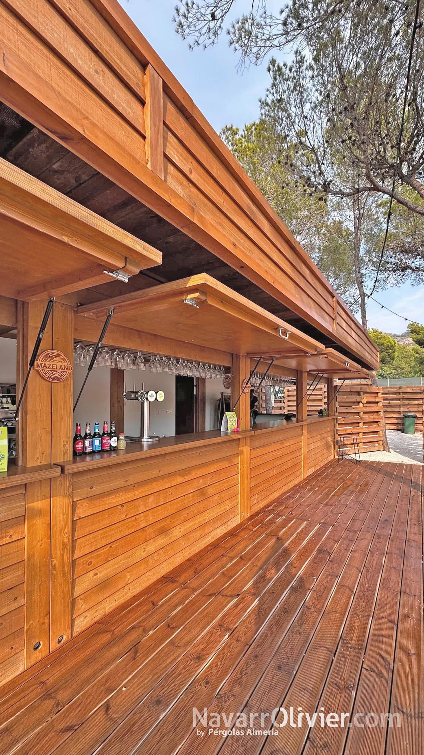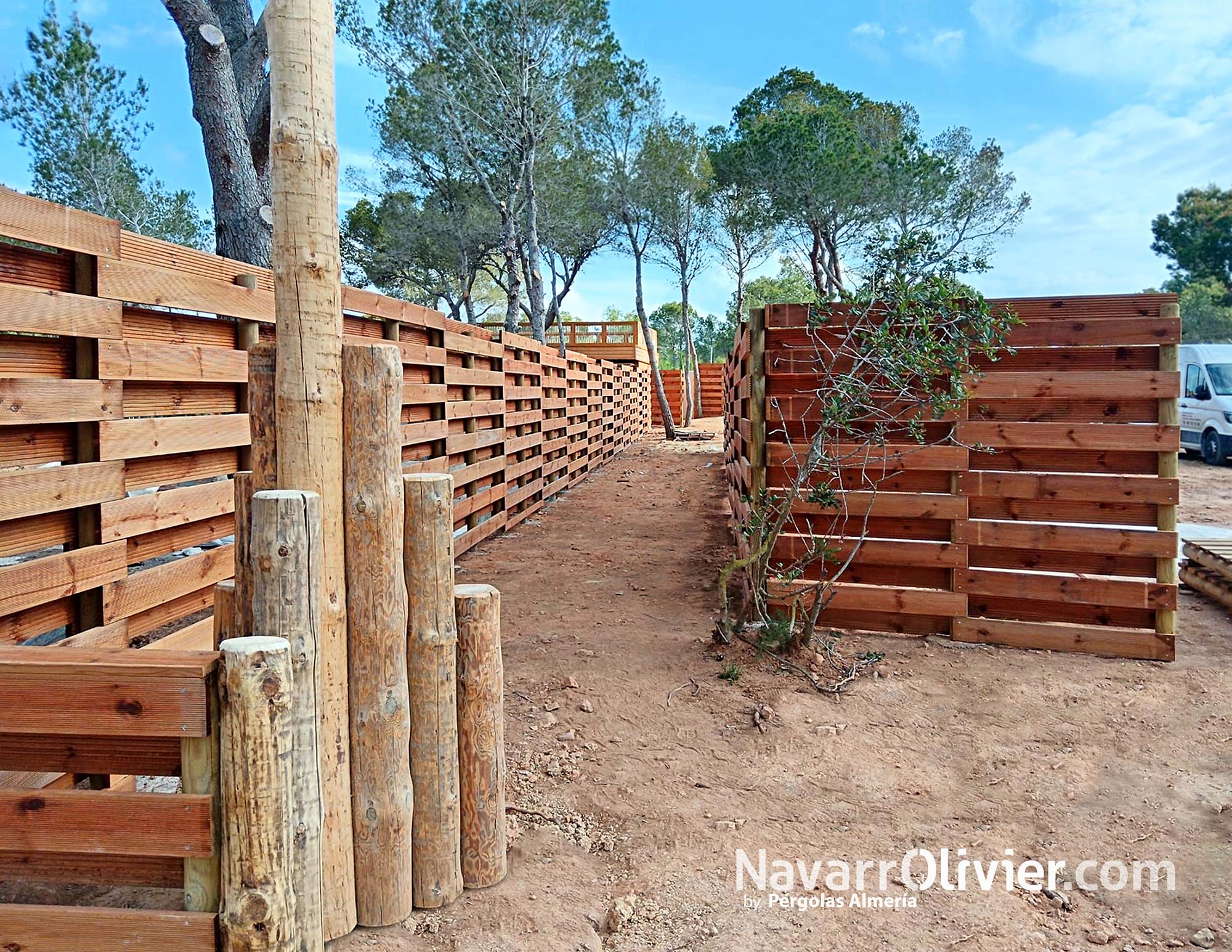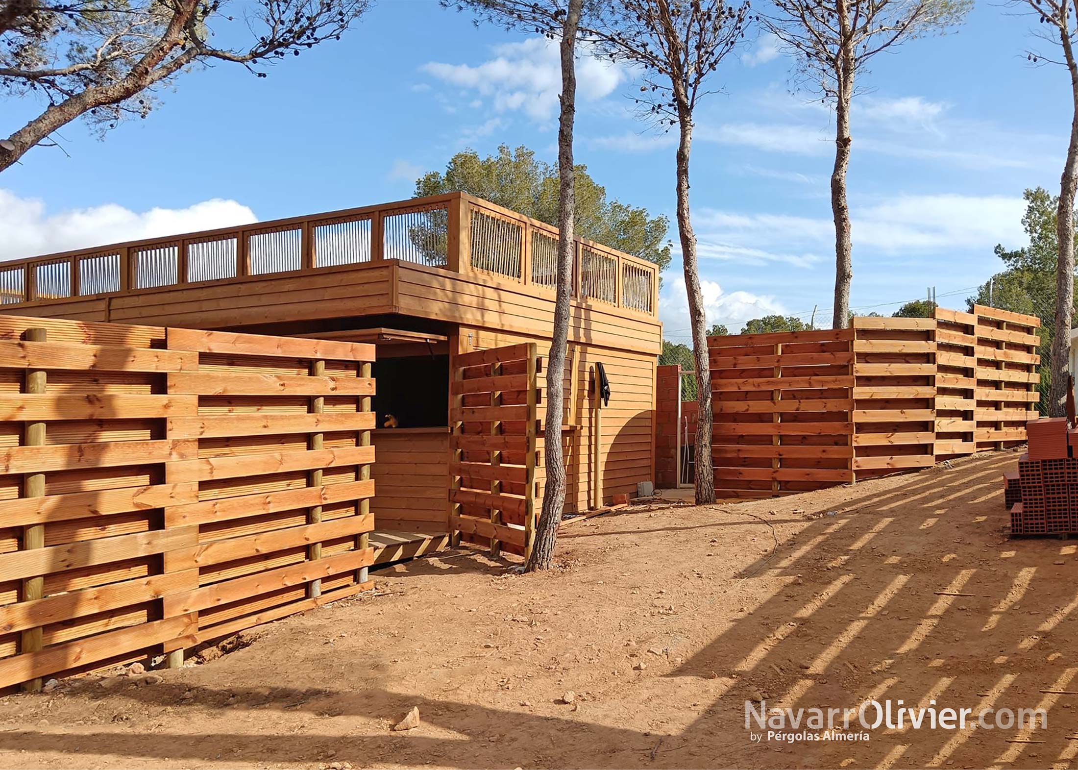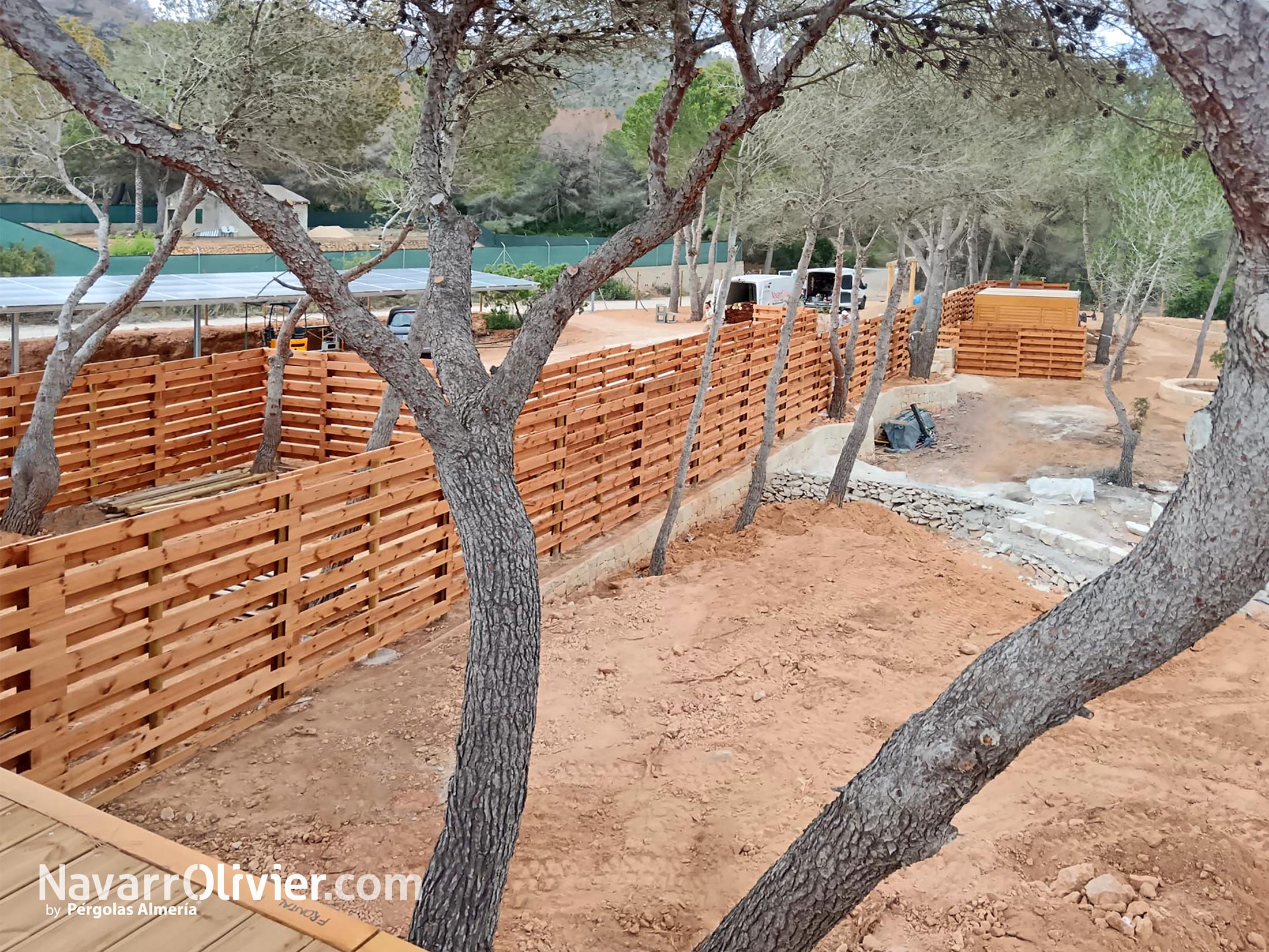 Otra de las construcciones realizadas son los muros en celosía de madera tratada en autoclave que delimitan los sectores del recinto de este lugar único de la Costa Blanca ubicado en Benidorm.