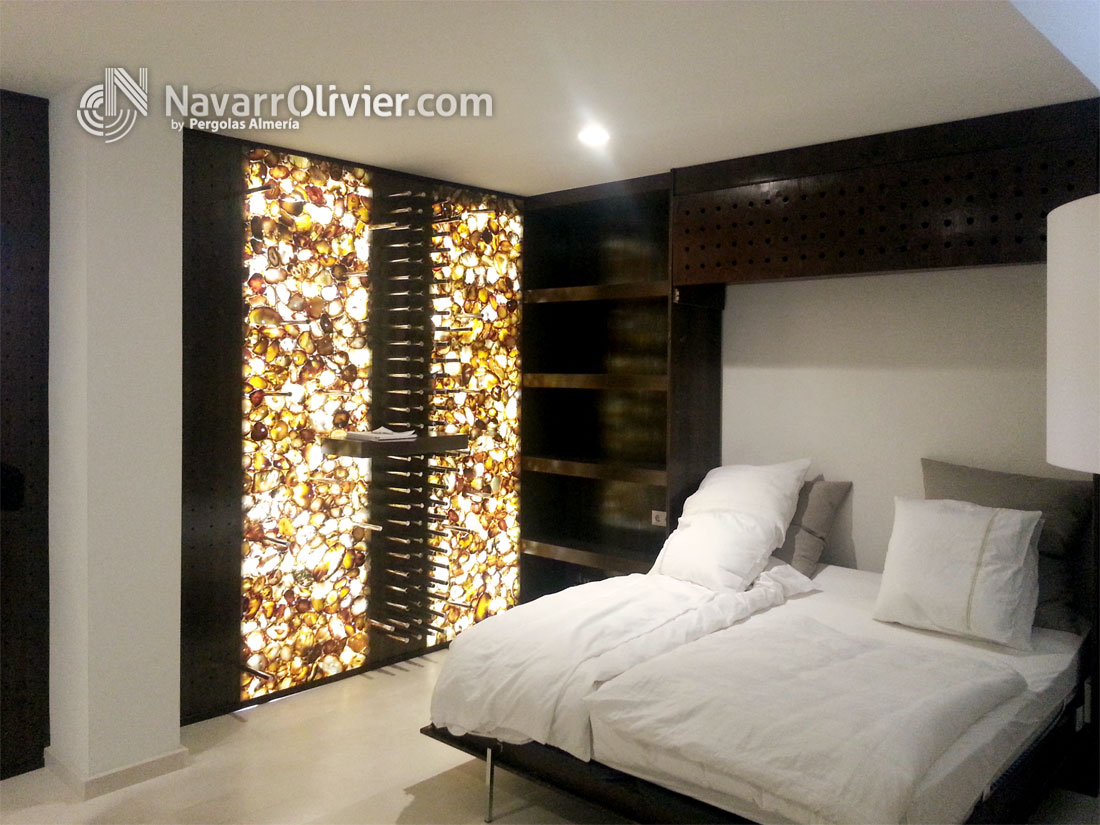 Intervención realizada para Muxacra Arquitectos en el proyecto Casa Beirholm ubicada en Macenas Beach & Golf Resort. La zona afectada es una dependencia pensada como habitación de invitados y bodega personal. Siguiendo con la estética y sistemas constructivos utilizados en otras zonas de la vivienda se construyo un pasamanos continuo en madera lacada en blanco, ademas se fabricaron las puertas mecanizadas en madera para el almacenamiento de vinos, un expositor decorativo madera acabada en color wengue combinada con silestone translucido iluminado por led con estanterías y bárrales de acero para exponer botellas. Para acondicionar la habitación de invitados la carpintería a medida incluye una cama abatible de 2 plazas, que se oculta siguiendo la estética del mobiliario.