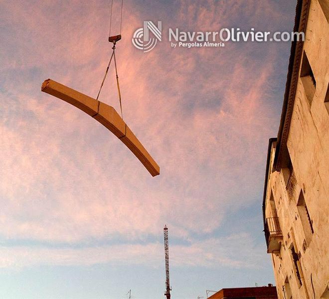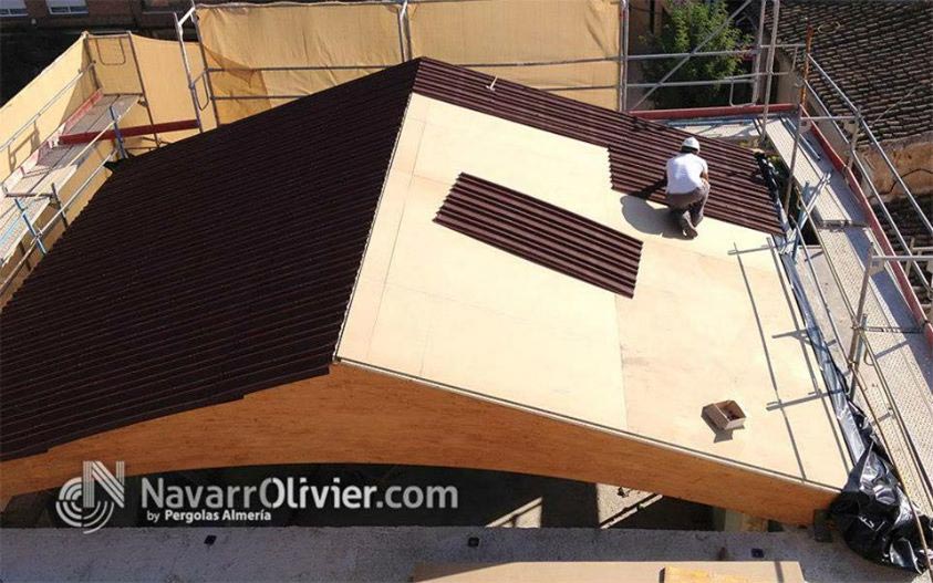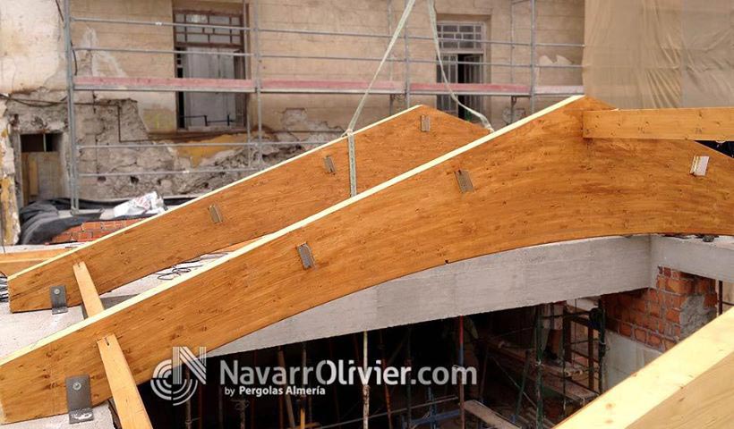Estructura principal en cerchas de madera laminada encolada en forma de flecha con correas unidas mediante estribos ocultos.