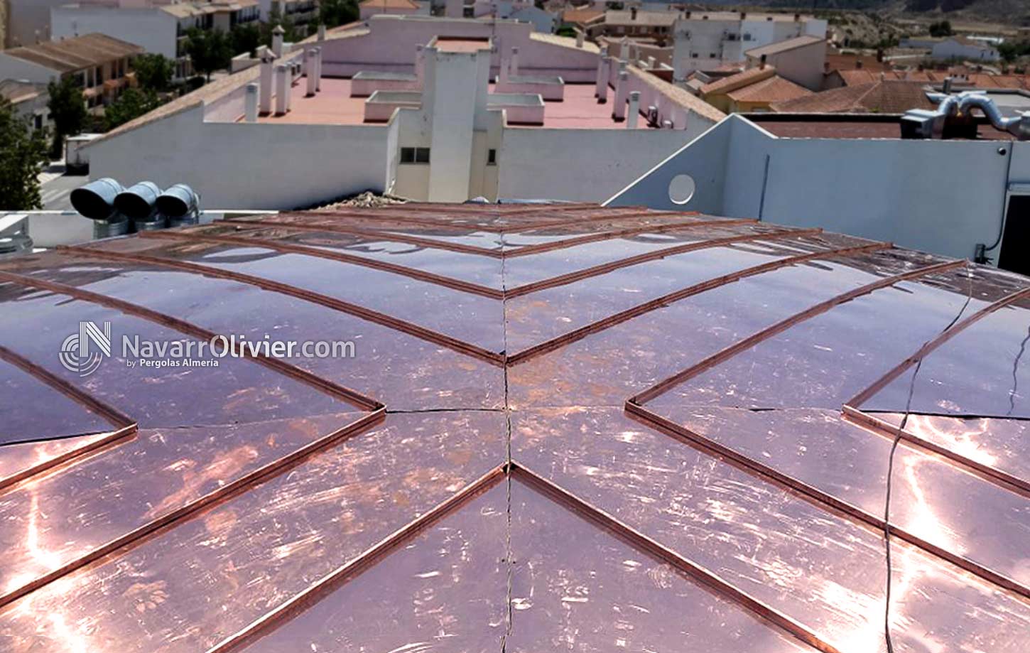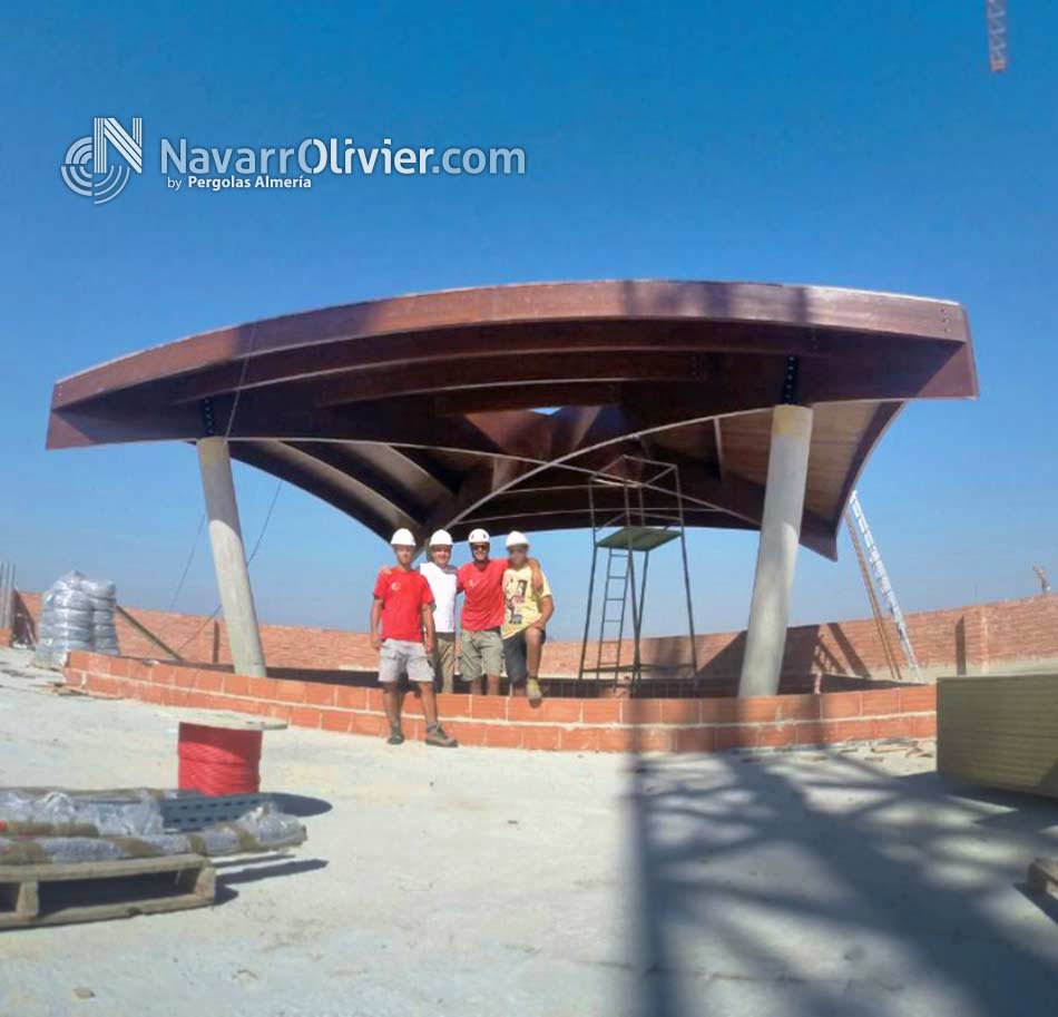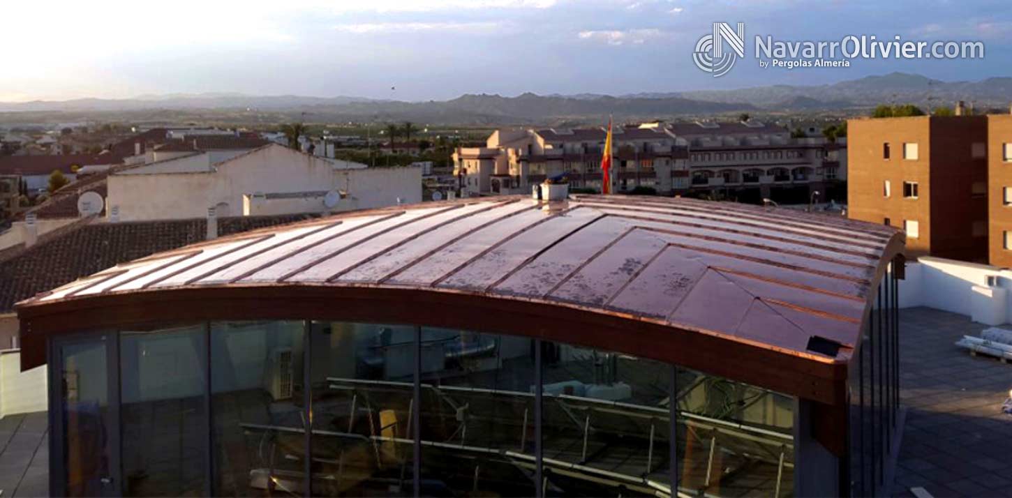 Cúpula semi esférica ó bóveda vaída de 10 m de radio sobre pilares extra plomados de obra con herrajes metálicos de sugesión, atado de las correas a las vigas principales mediante estribos ocultos de aluminio. Friso en madera machihembrada de pino rojo. Aislamiento exterior en cobre.