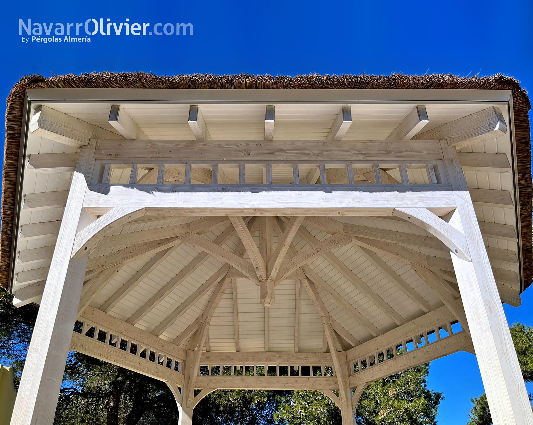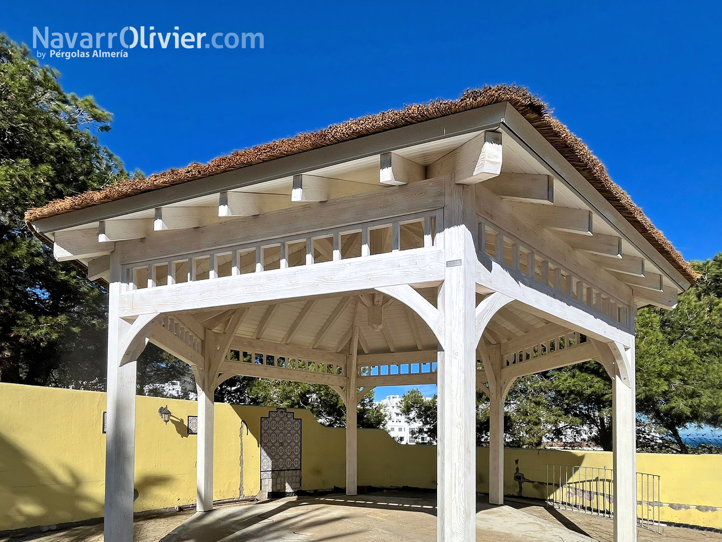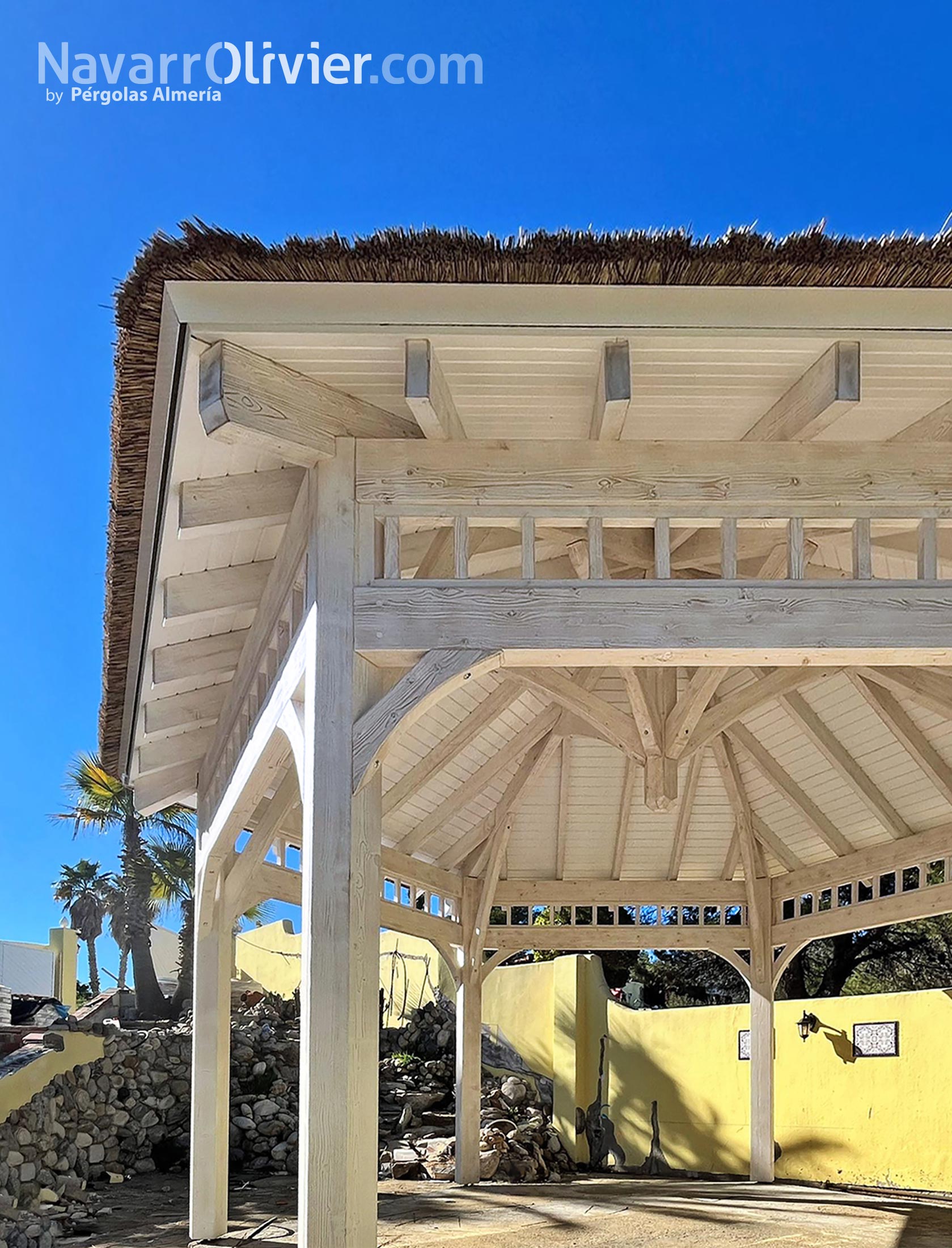 La estructura, de cuidada estética, está construida de madera estructural de pino rustificado con acabado en decapé blanco, su cubierta poligonal a con pendiente a 6 aguas, está rematada de con tejas de junco africano, este aporte natural acerca la construcción al estilo mediterráneo, una invitación a disfrutar de la vida al aire libre.