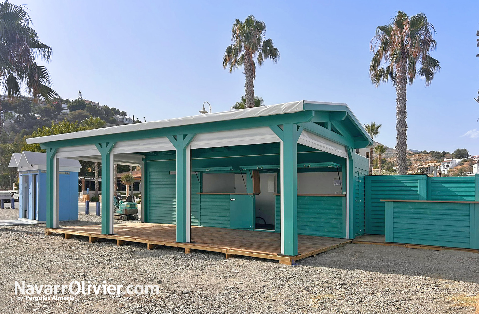 Chiringuito modular de 20 m², con pérgola sobre decck y barra exterior en La Herradura, Almuñecar, Costa Tropical, Granada, Andalucía.