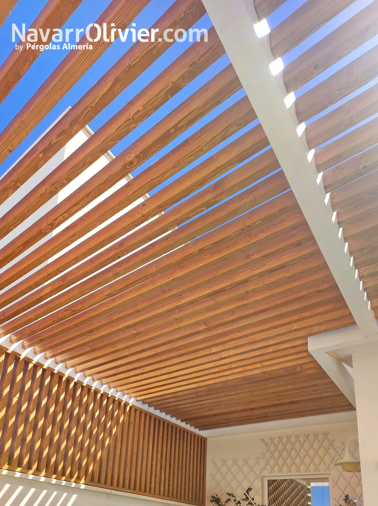 Pérgola de luz filtrada construida de madera tratada en Estepona, Málaga, Andalucía.