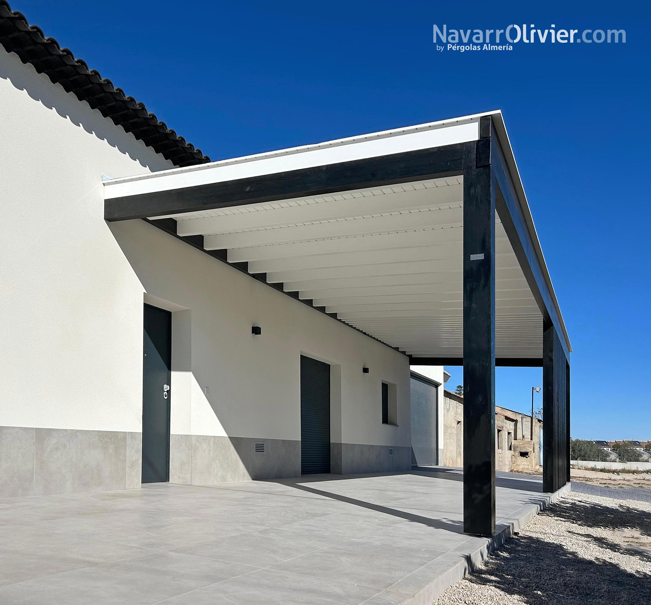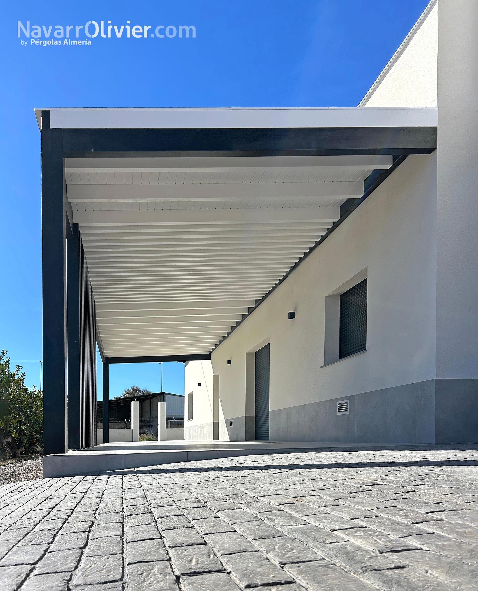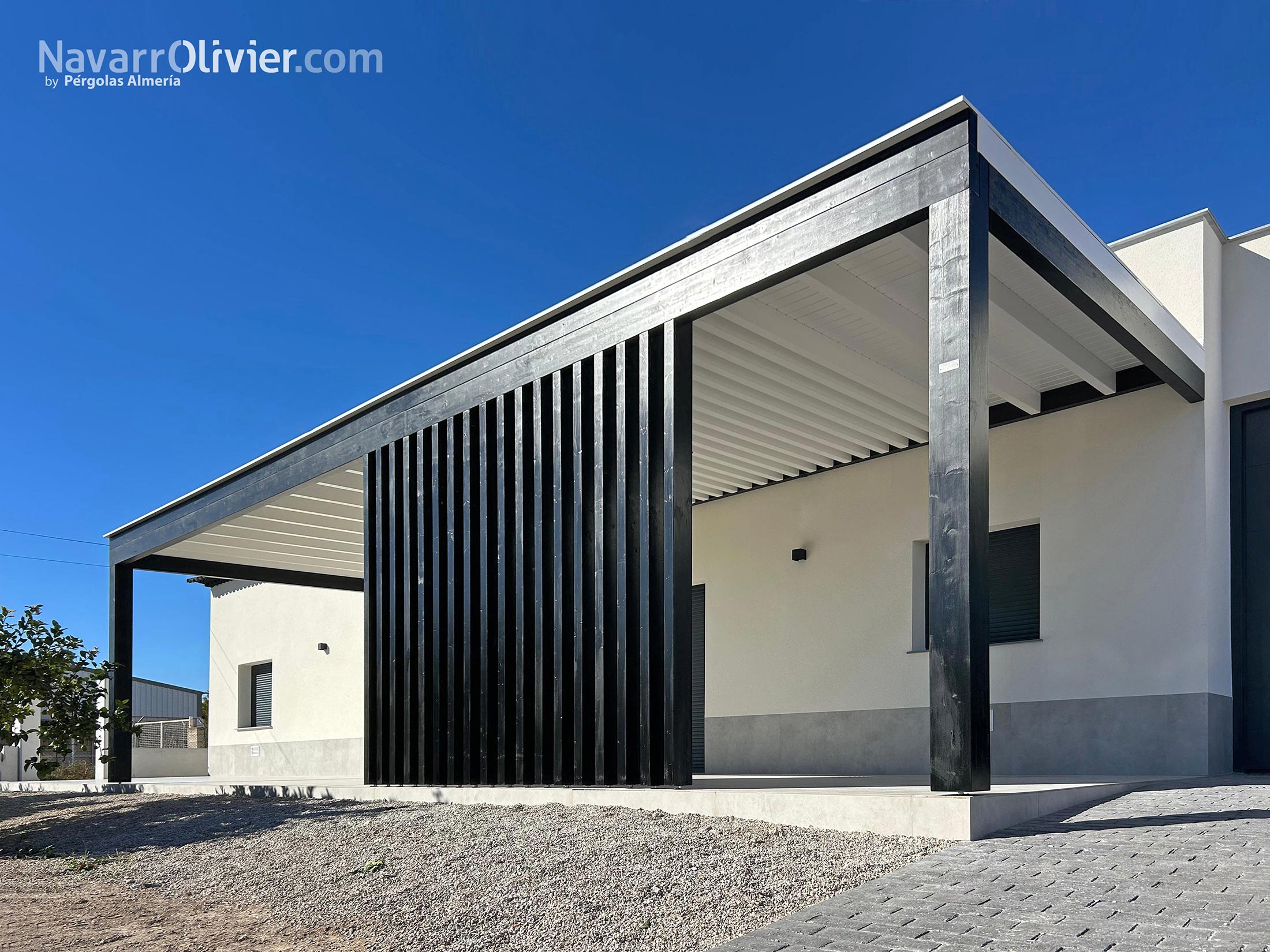 Pérgola de madera de diseño minimalista para vivienda rural en Lorca, Región de Murcia.