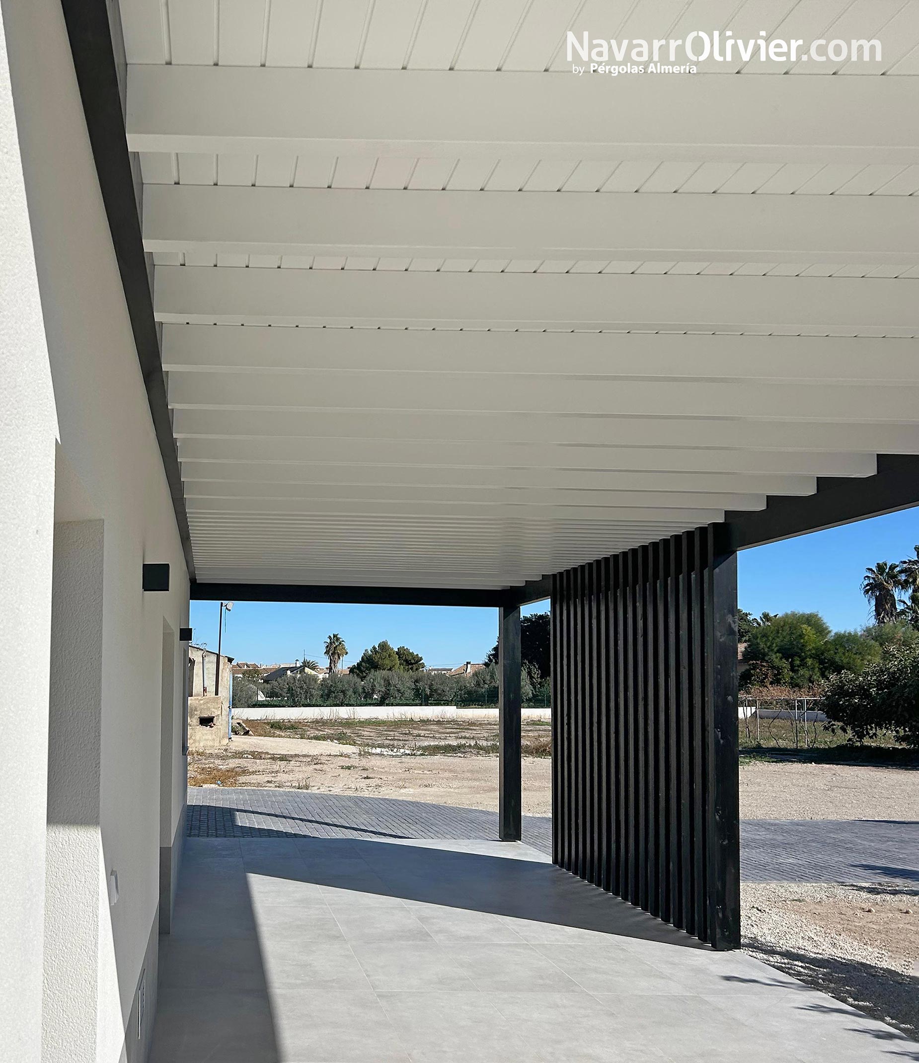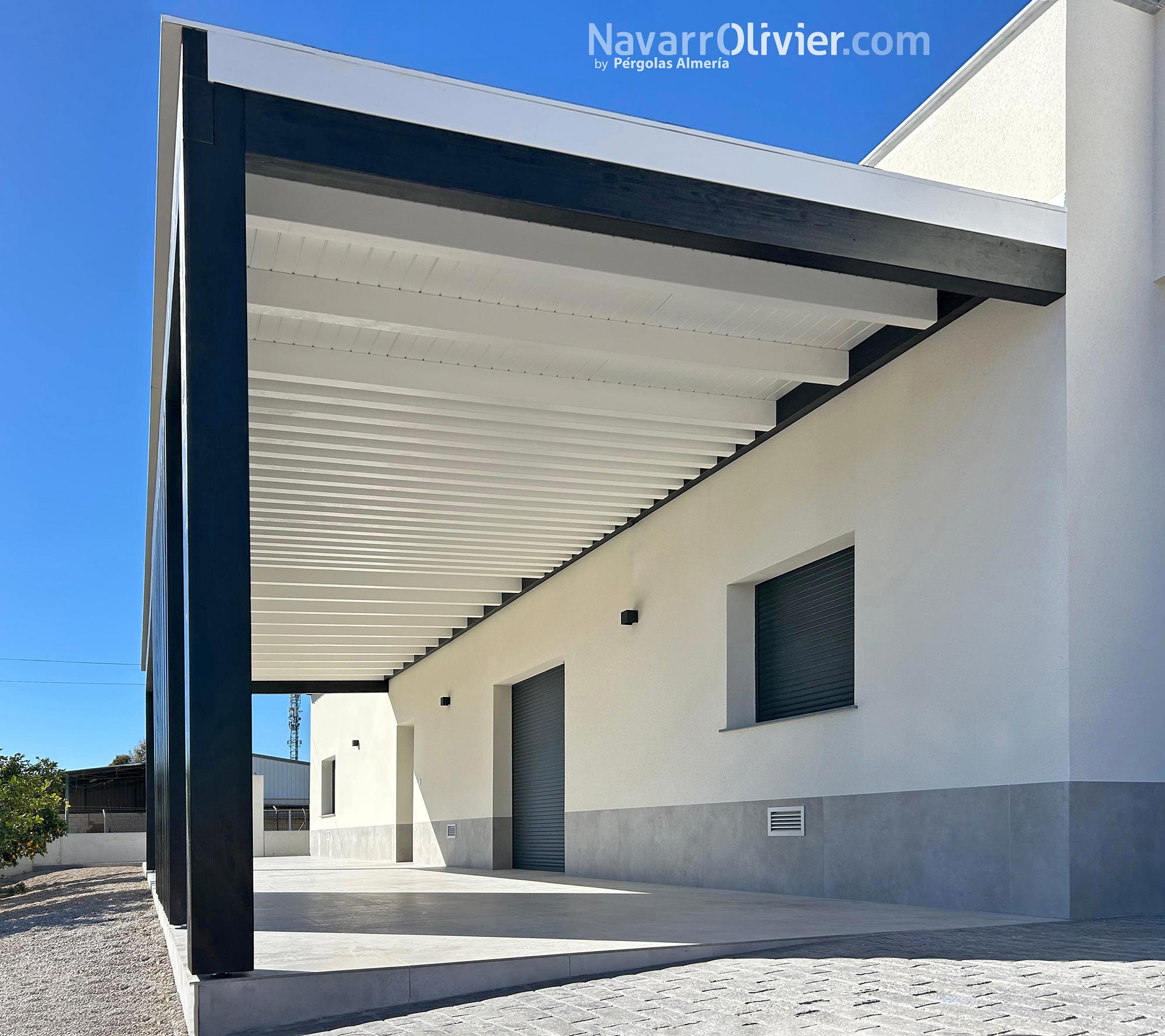 Esta pérgola invita a disfrutar del exterior dando sombra y protección sin renunciar a la luminosidad. El negro de la estructura aporta carácter y fortaleza, el blanco refleja la claridad para crear un respacio agradable.
