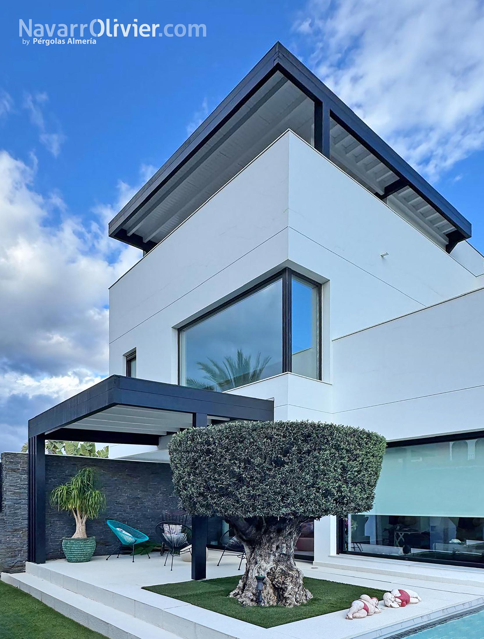 La construcción de esta pérgolas se adapta al estilo contemporáneo de la vivienda, y gracias al color interior de la cubierta, acabado en blanco, no reduce la luminosidad del interior, creando un espacio funcional tanto en invierno como en verano.