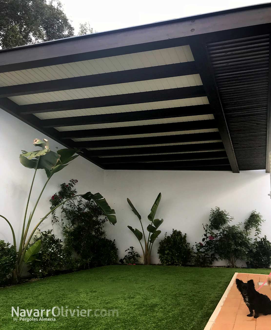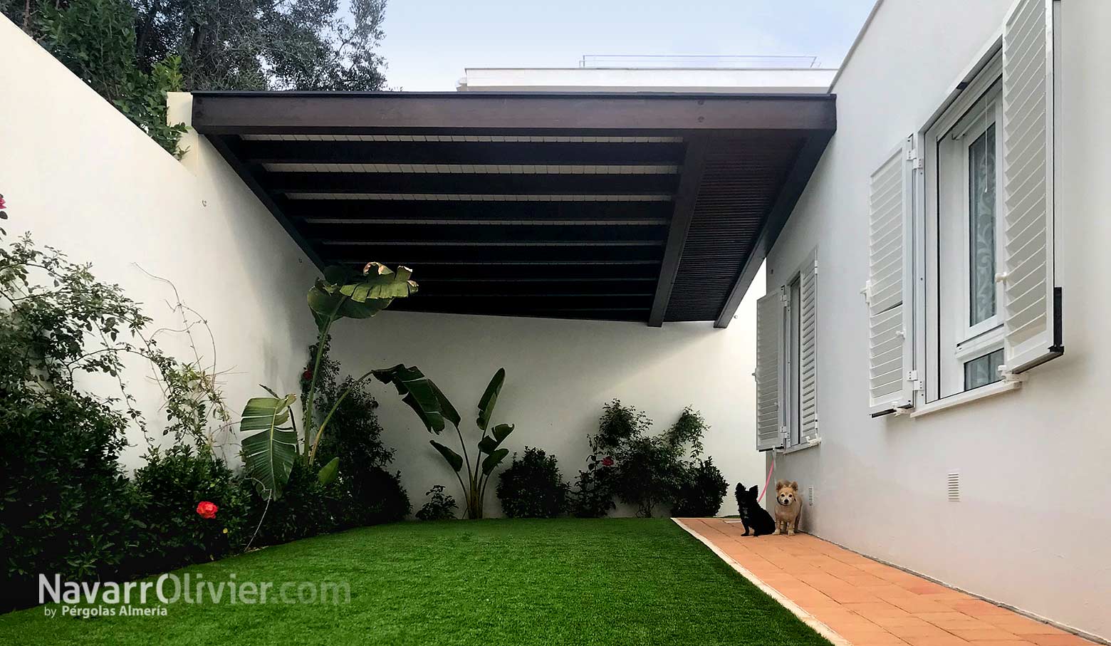 La cubierta aprovecha el muro perimetral y la propia vivienda para crear un espacio de sombraje mixto con la mayor superficie impermeable y un espacio de luz filtrada mediante listones paralelos.
