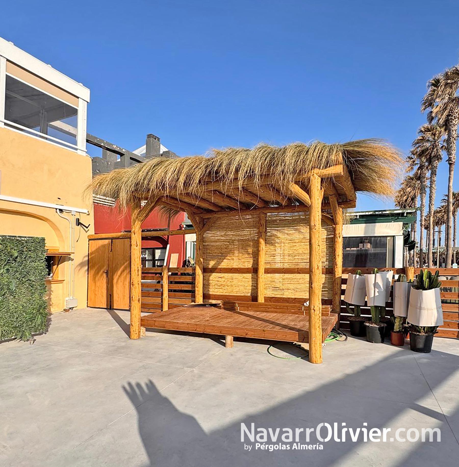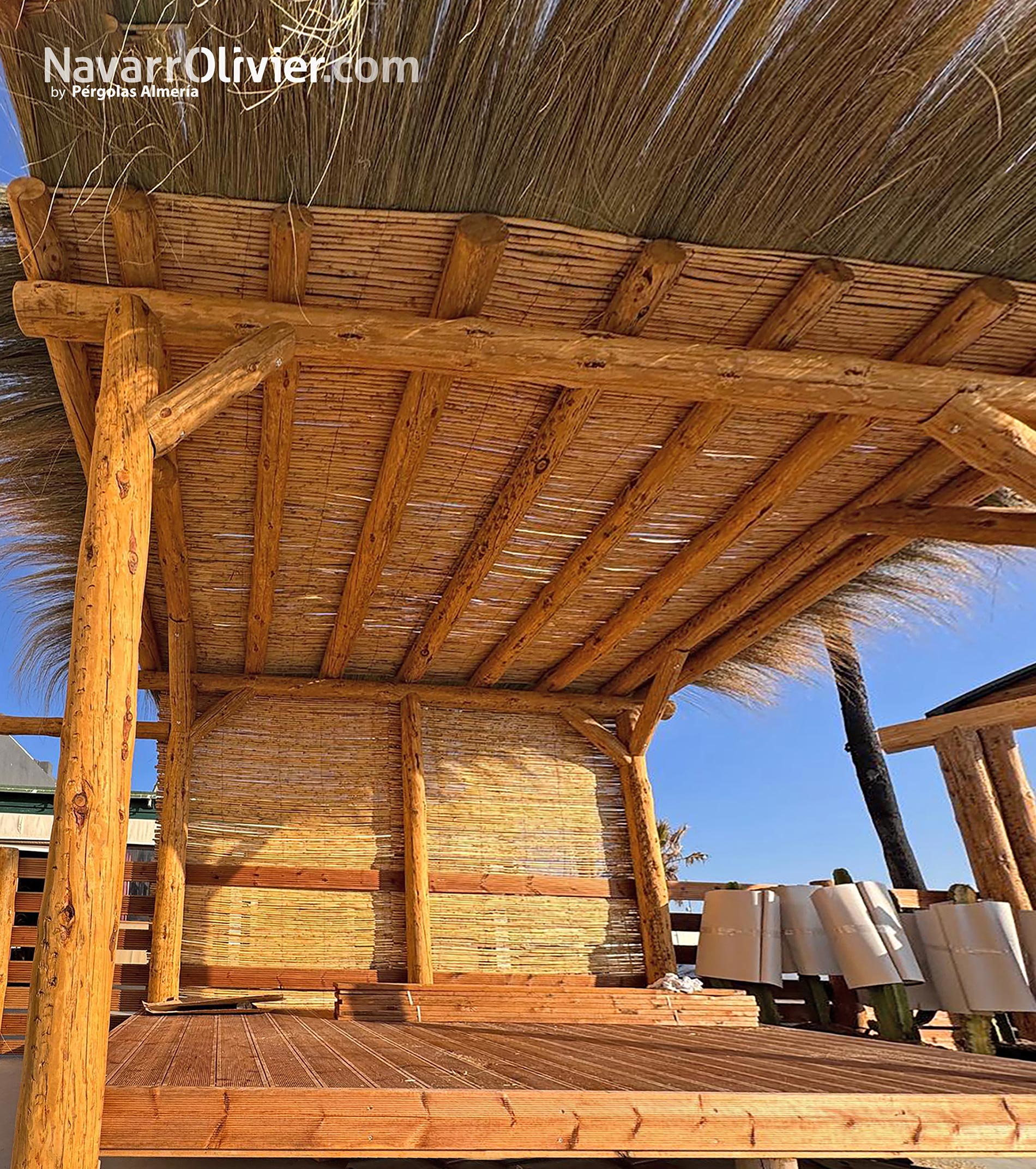 Siguiendo el estilo rústico construimos la tarima con cubierta de tronco, cañizo y carritx para la cabina del dj, además de un chiringuito modular modelo Campello de 10 m² equipado con instalación eléctrica preparado para dar servicio a la terraza de Playa Jaleo este local de ocio ideal para tardeos junto al mar ubicado en la playa de Almerimar, Costa de Almería.