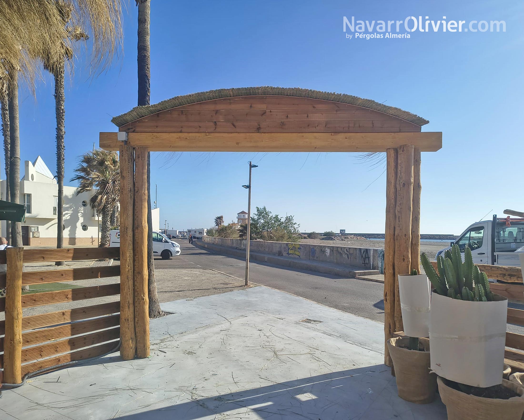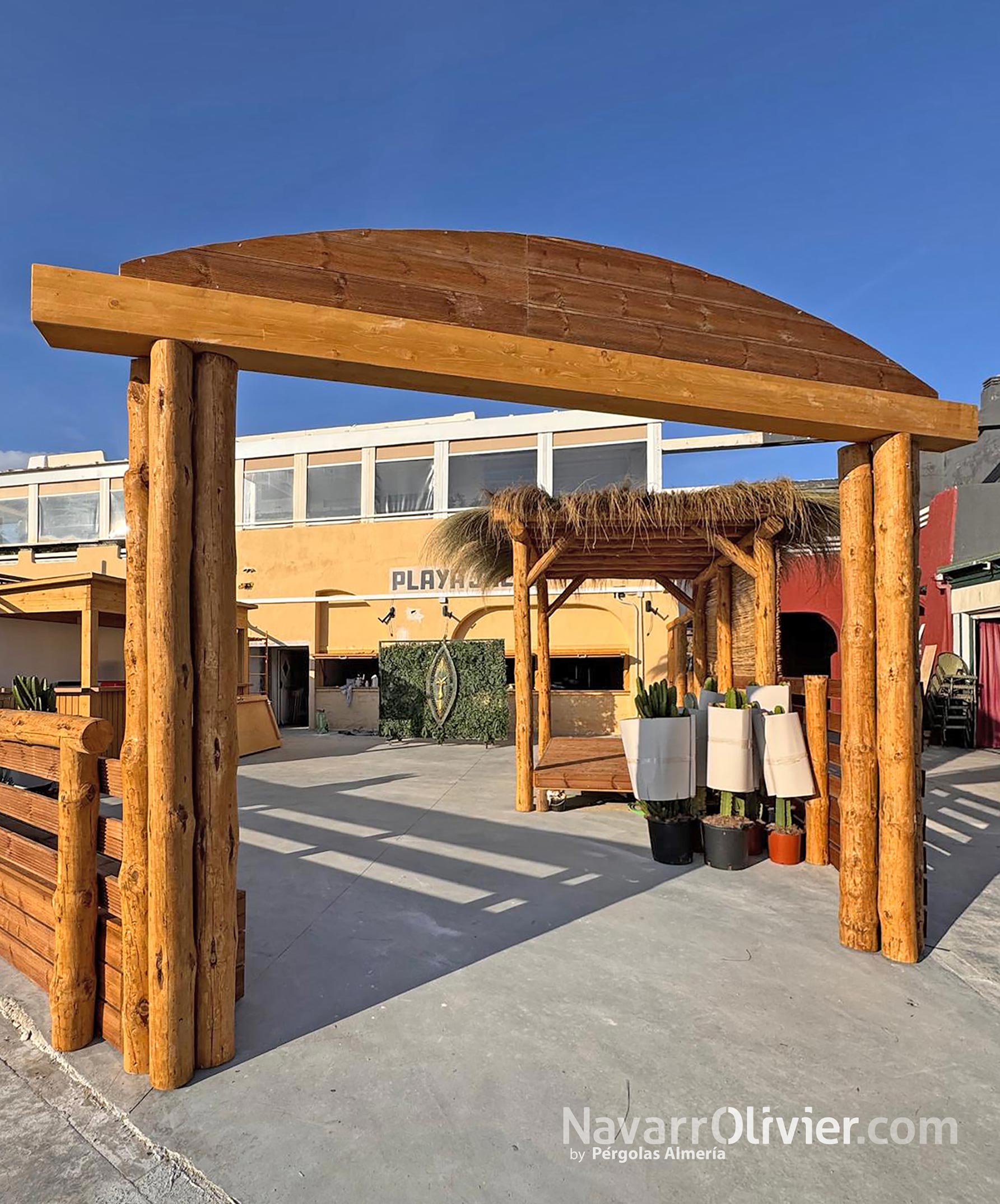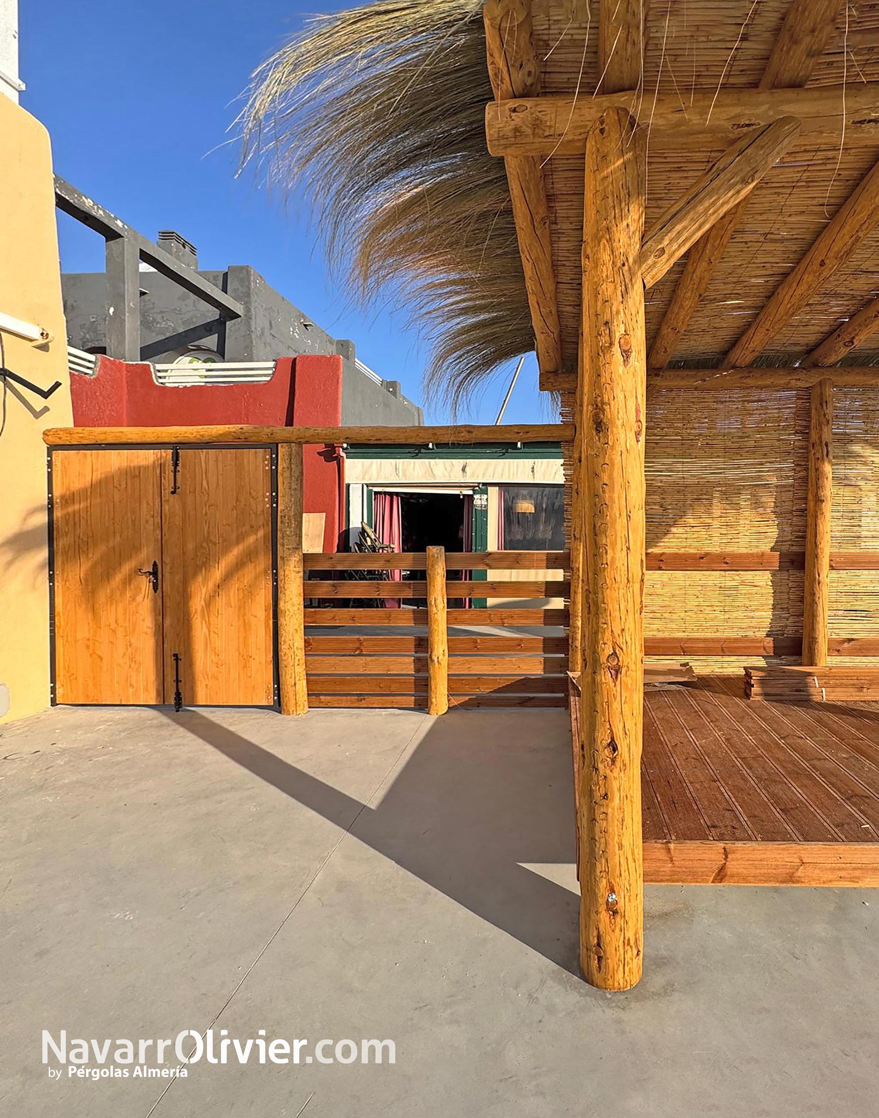 Construimos esta terraza rústica de estilo mediterráneo delimitada por una valla de tronco descortezado tratado para exterior y lamas de tarima autoclave.En la esquina de la terraza fabricamos un pórtico de entrada de tronco y madera que sirve como soporte para el rótulo de Playa Jaleo, coronado con carritx natural.