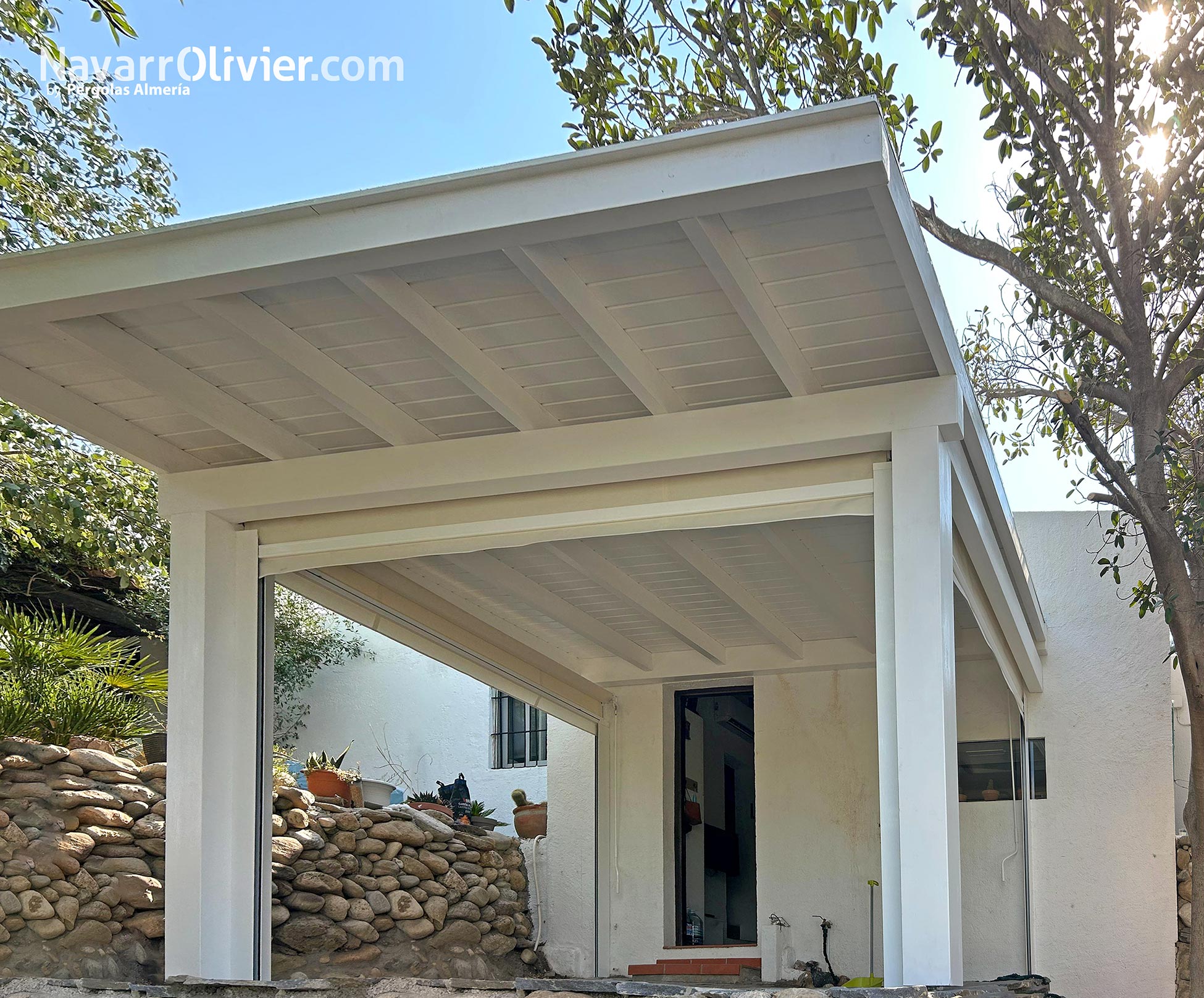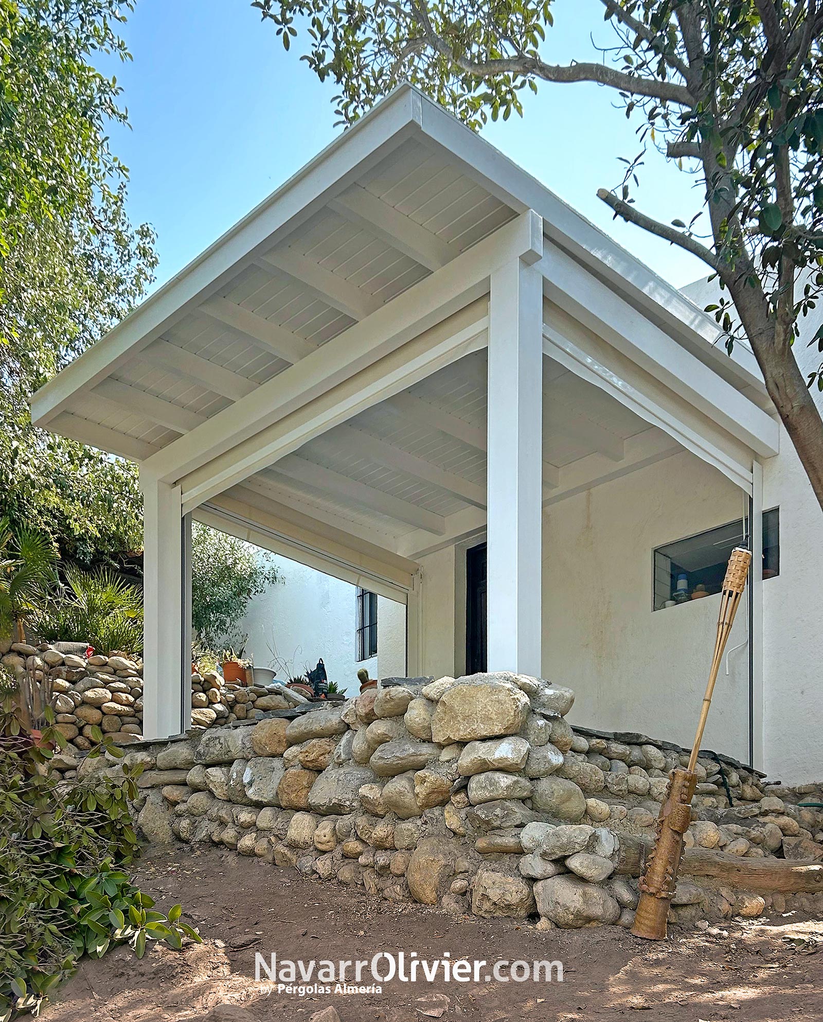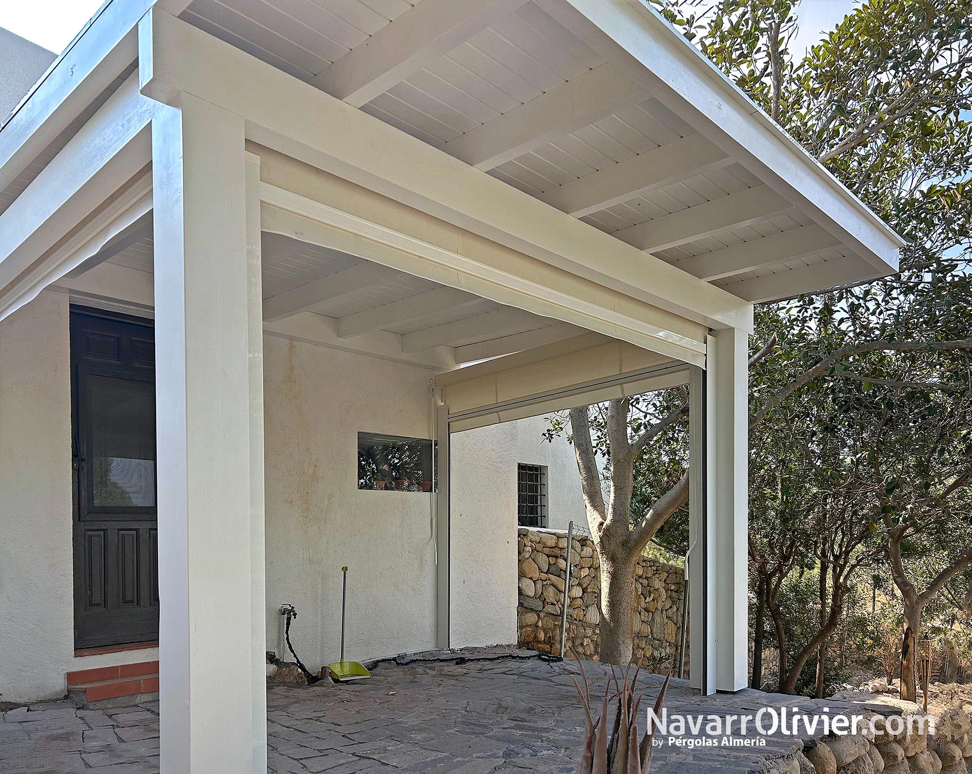 Construímos esta estructura adosada para crear un refugio de protección que permite conectar con la naturaleza haga el tiempo que haga.La estructura adosada a la vivienda está fabricada a medida con los pilares y estructura principal de vigas de madera laminada GL24, viguetas de madera de pino maciza y la cubierta de tablero marino ranurado. Gracias al tratamiento que recibe la madera garantiza que te permitirá disfrutar de este espacio sin preocuparte por el mantenimiento por años.Para que este espacio sea realmente versátil y se pueda utilizar todo el año, incluimos un cerramiento con toldos cortaviento enrollables, construidos con pvc y plástico transparente con perfiles de aluminio lacado.