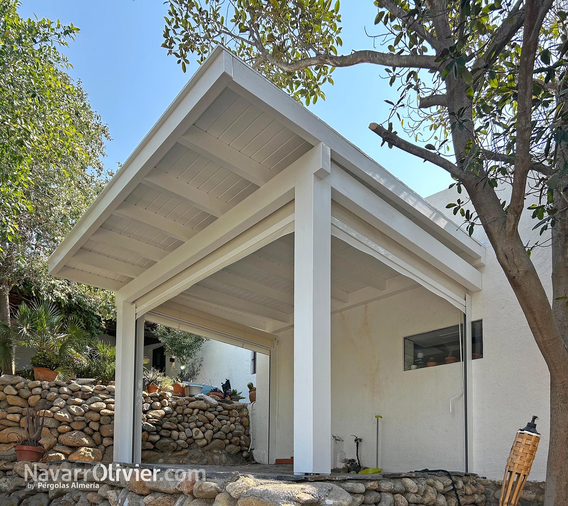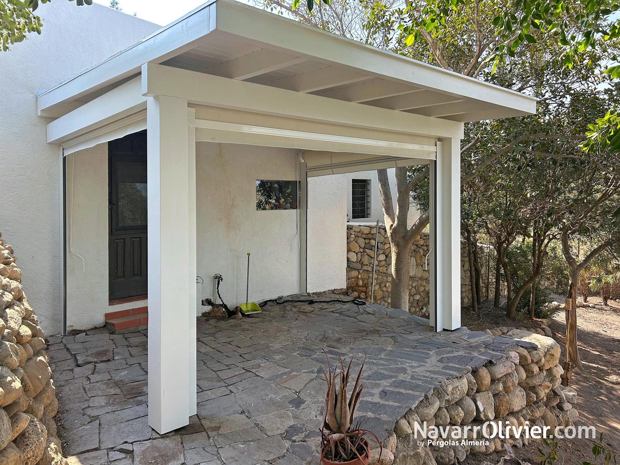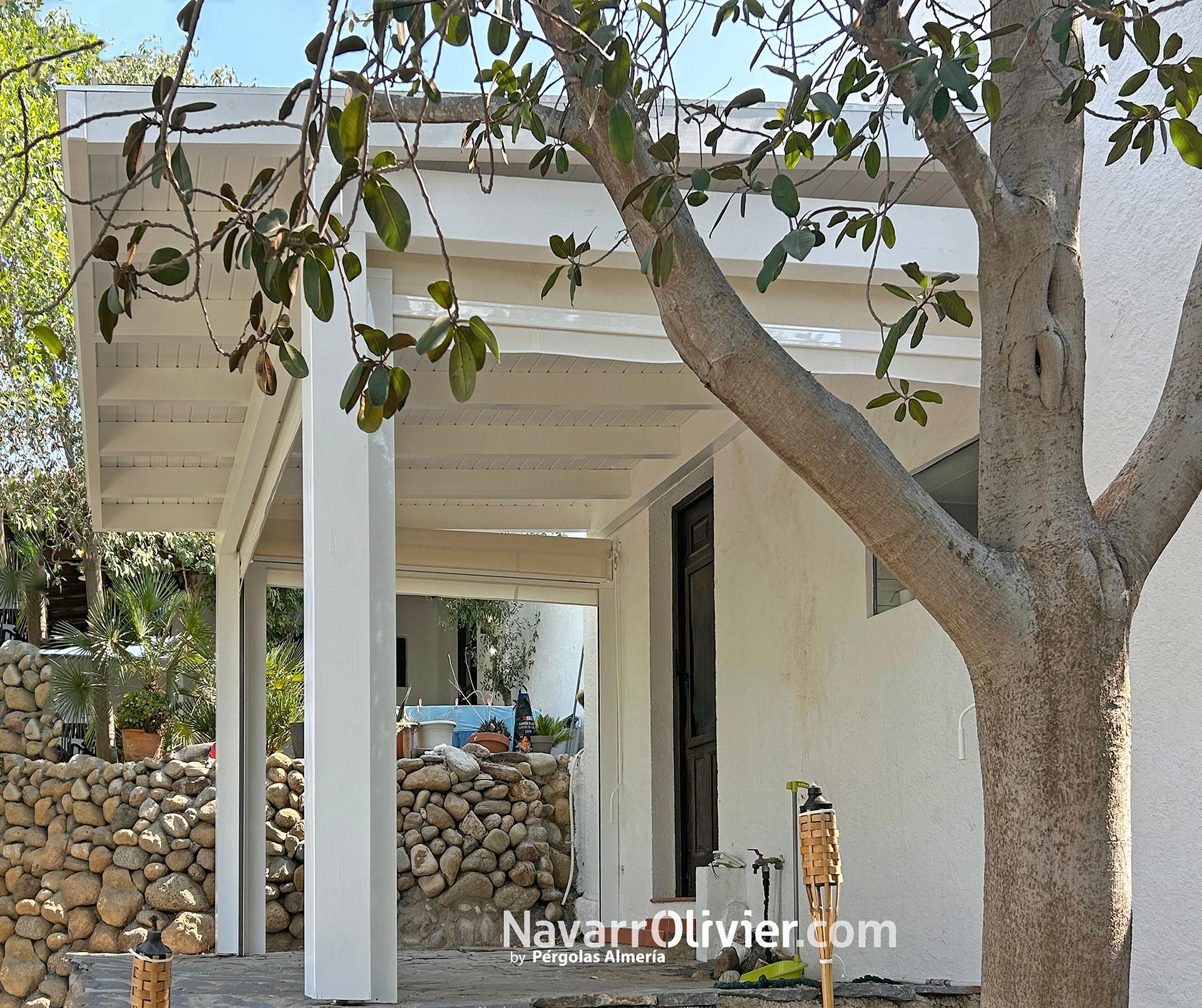 Construímos esta estructura adosada para crear un refugio de protección que permite conectar con la naturaleza haga el tiempo que haga.La estructura adosada a la vivienda está fabricada a medida con los pilares y estructura principal de vigas de madera laminada GL24, viguetas de madera de pino maciza y la cubierta de tablero marino ranurado. Gracias al tratamiento que recibe la madera garantiza que te permitirá disfrutar de este espacio sin preocuparte por el mantenimiento por años.Para que este espacio sea realmente versátil y se pueda utilizar todo el año, incluimos un cerramiento con toldos cortaviento enrollables, construidos con pvc y plástico transparente con perfiles de aluminio lacado.