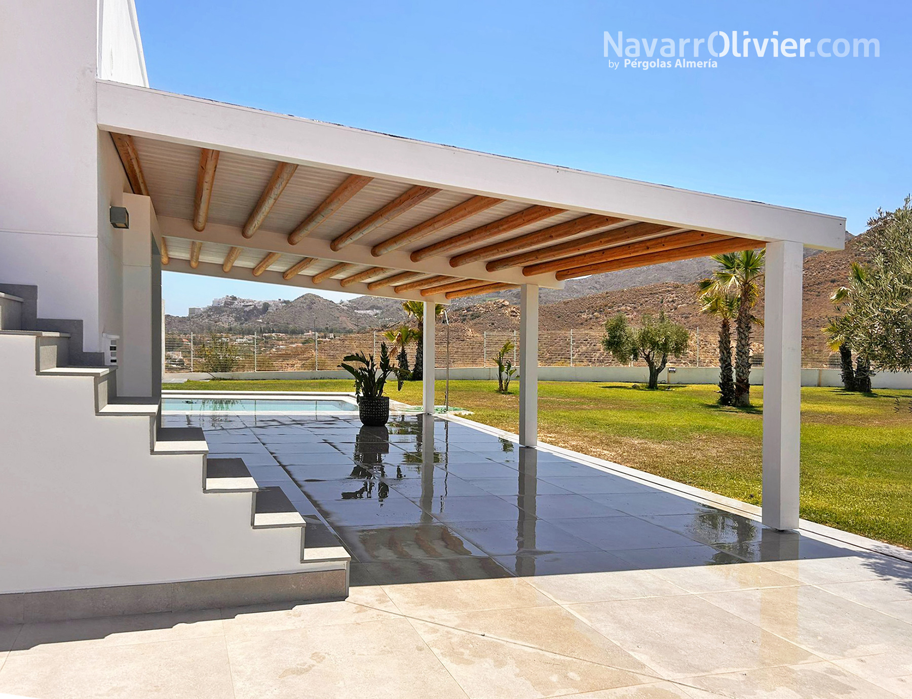 Pérgola de madera estructural y tronco calibrado para vivienda unifamiliar con piscina en Vera, Almería.