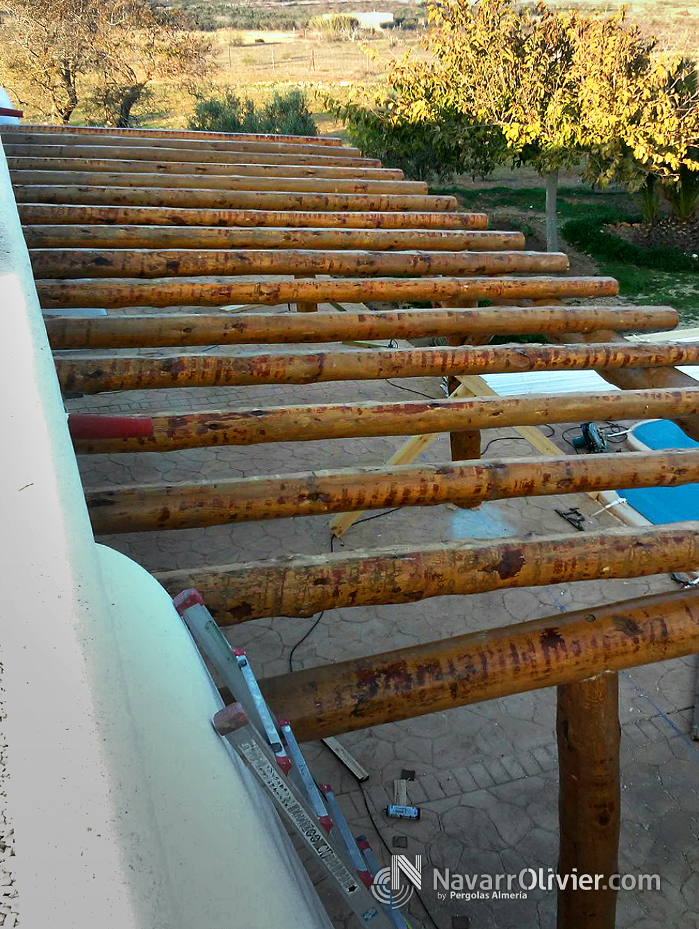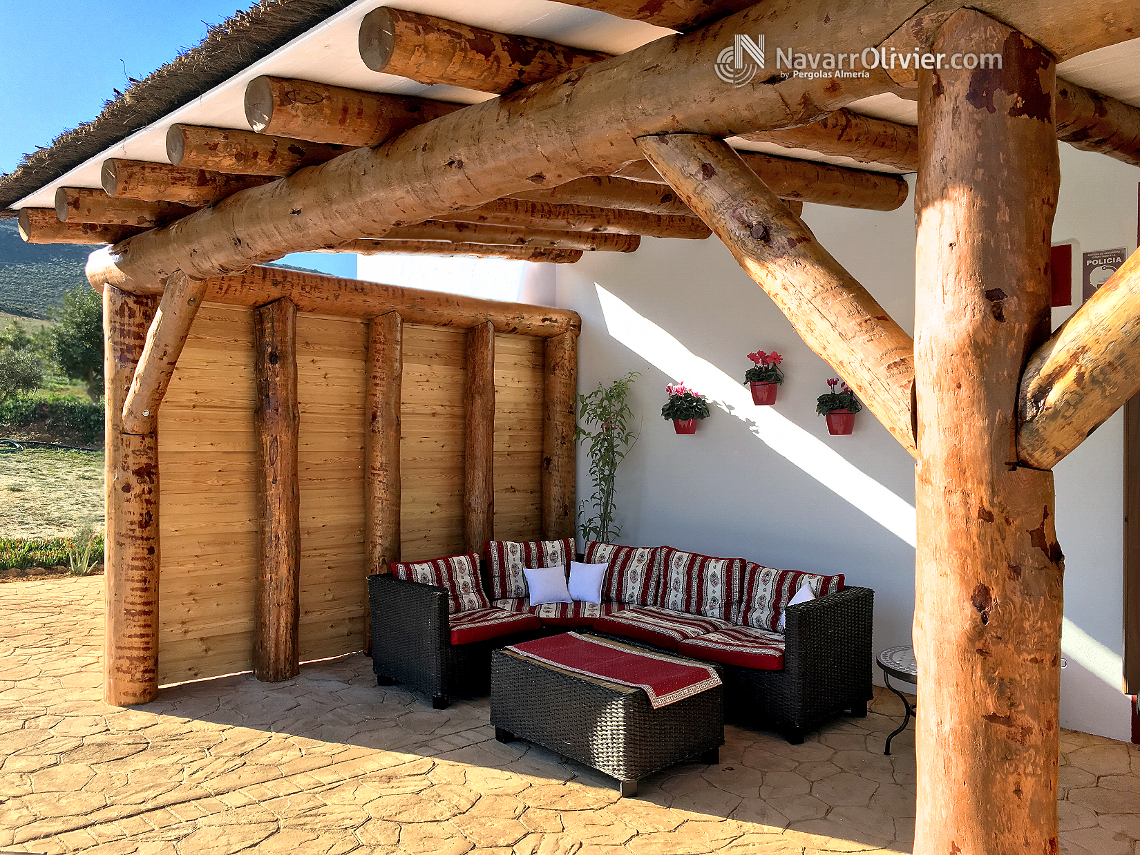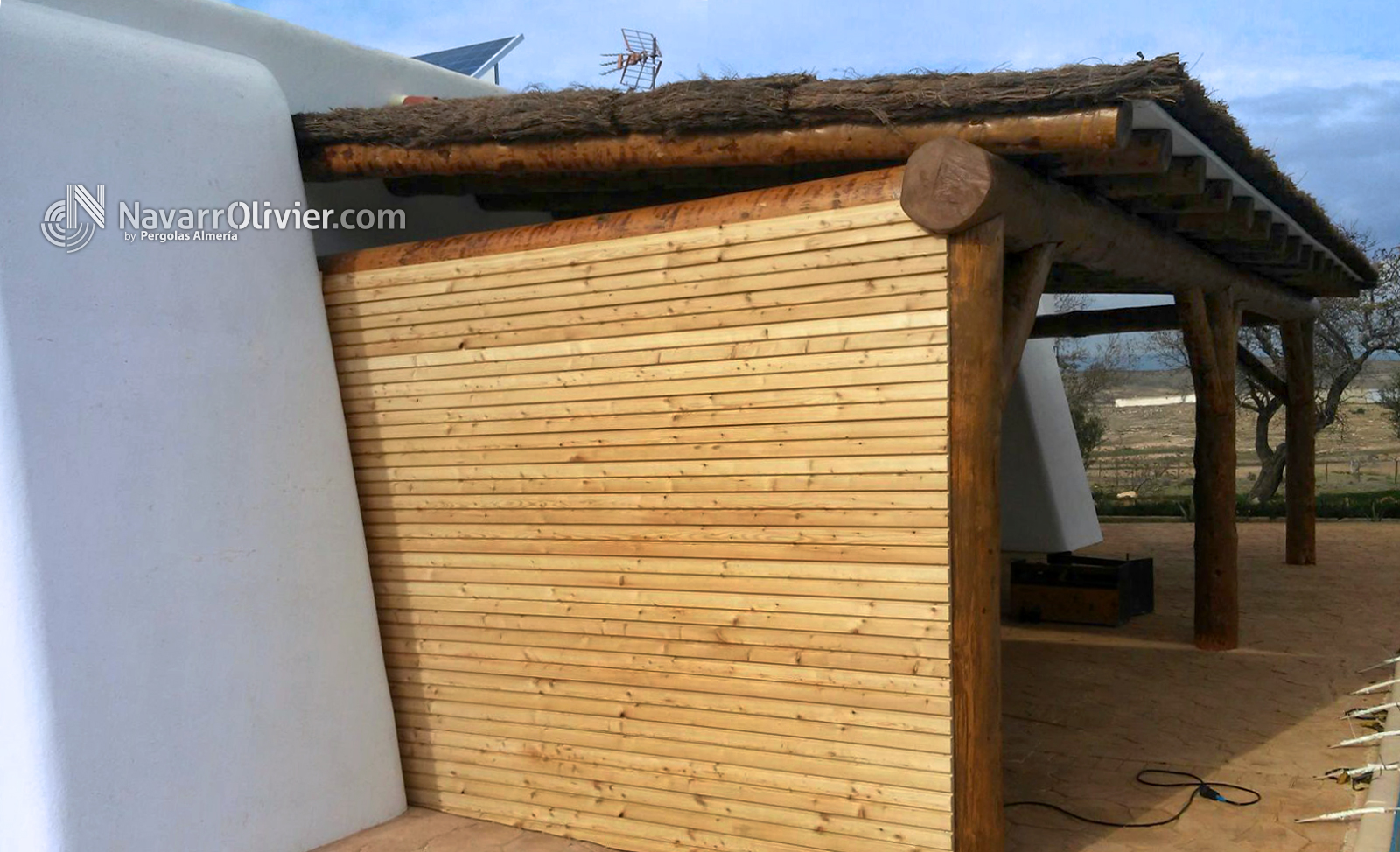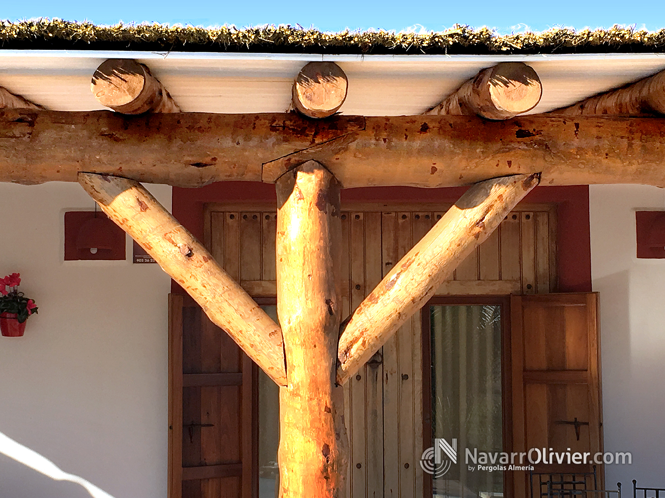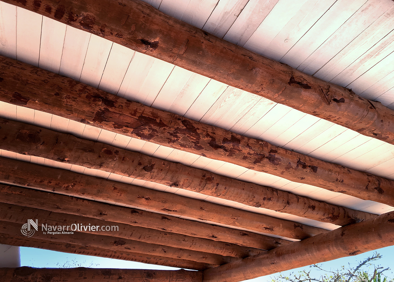Pérgola adosada en tronco natural con cubierta en madera aserrada machihembrada impermeabilizada con exterior en brezo natural.