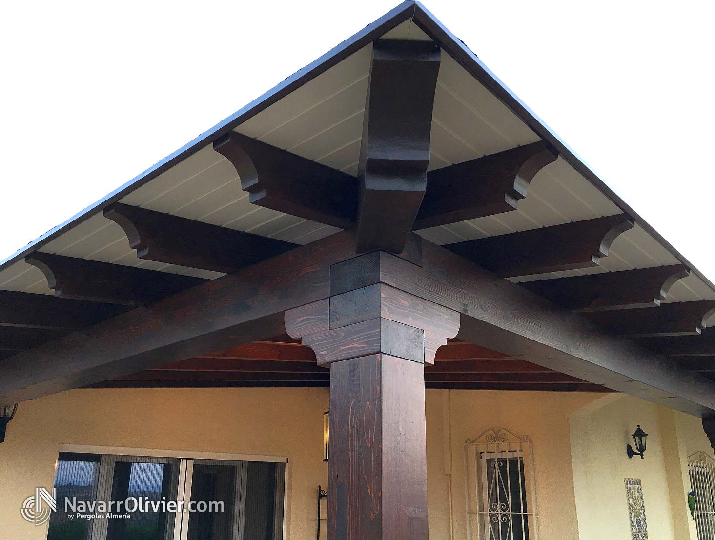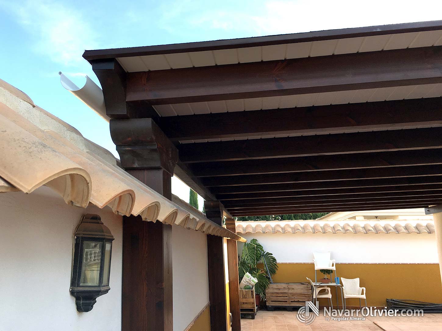 Pérgola para casa familiar en Los Gallardos, Almería. Por su ubicación geográfica este enclave andaluz goza de la cálida luz del sol mas de 300 días al año lo que permite disfrutar todo el año de estas estancias exteriores. La pérgola construida en vigas de madera laminada cuentan con capiteles de remate, la estructura principal acabada en negro contrasta con el friso construido en tablero blanco.
