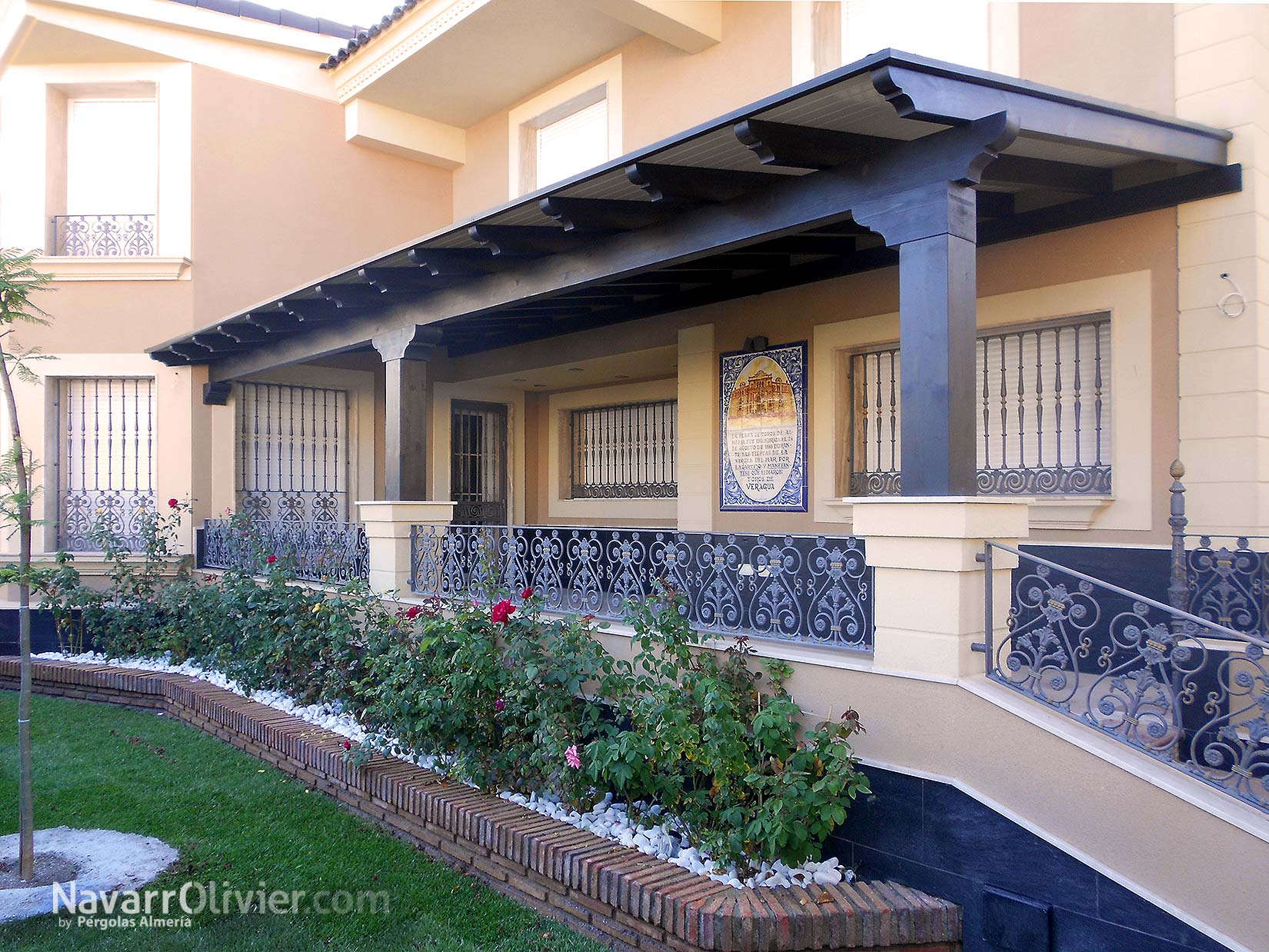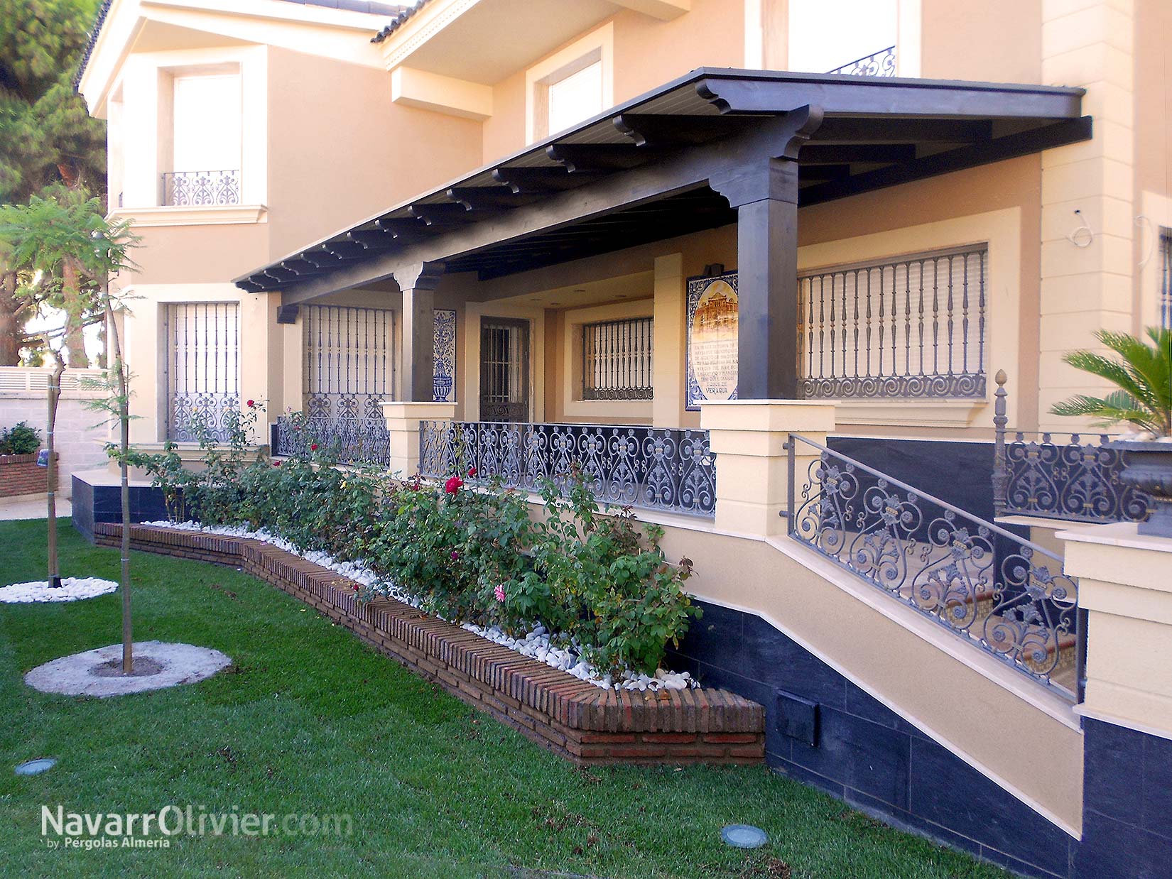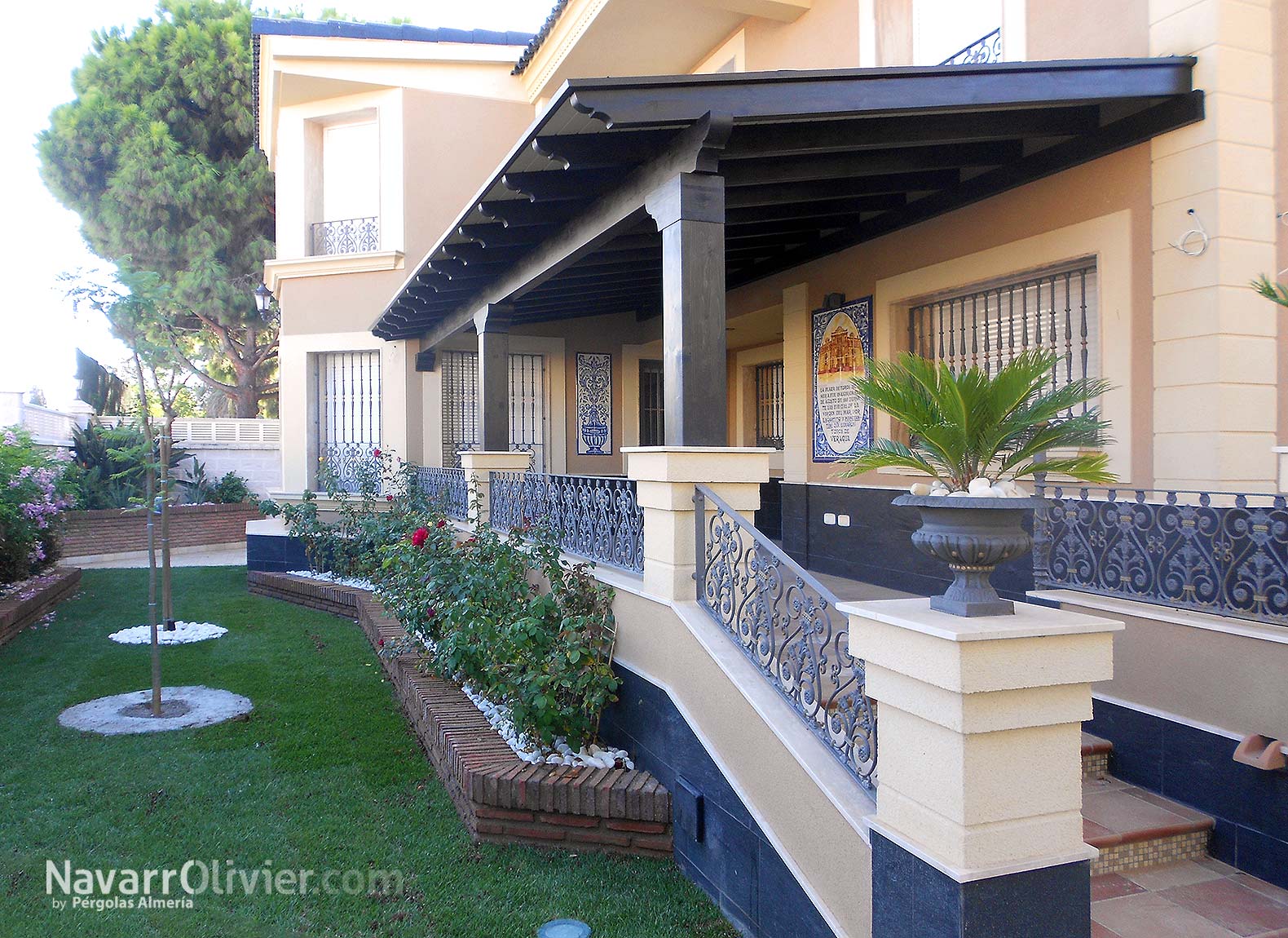 Porche de madera integrado en la fachada de chalet unifamiliar en Almería.