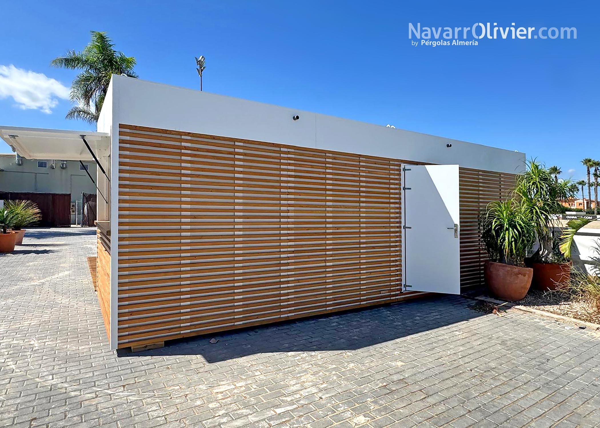 La estética exterior del chiringuito está marcada por la calidez natural del emparrillado, construido con listones de madera en contraste con el blanco del muro, la estructura y portalones.