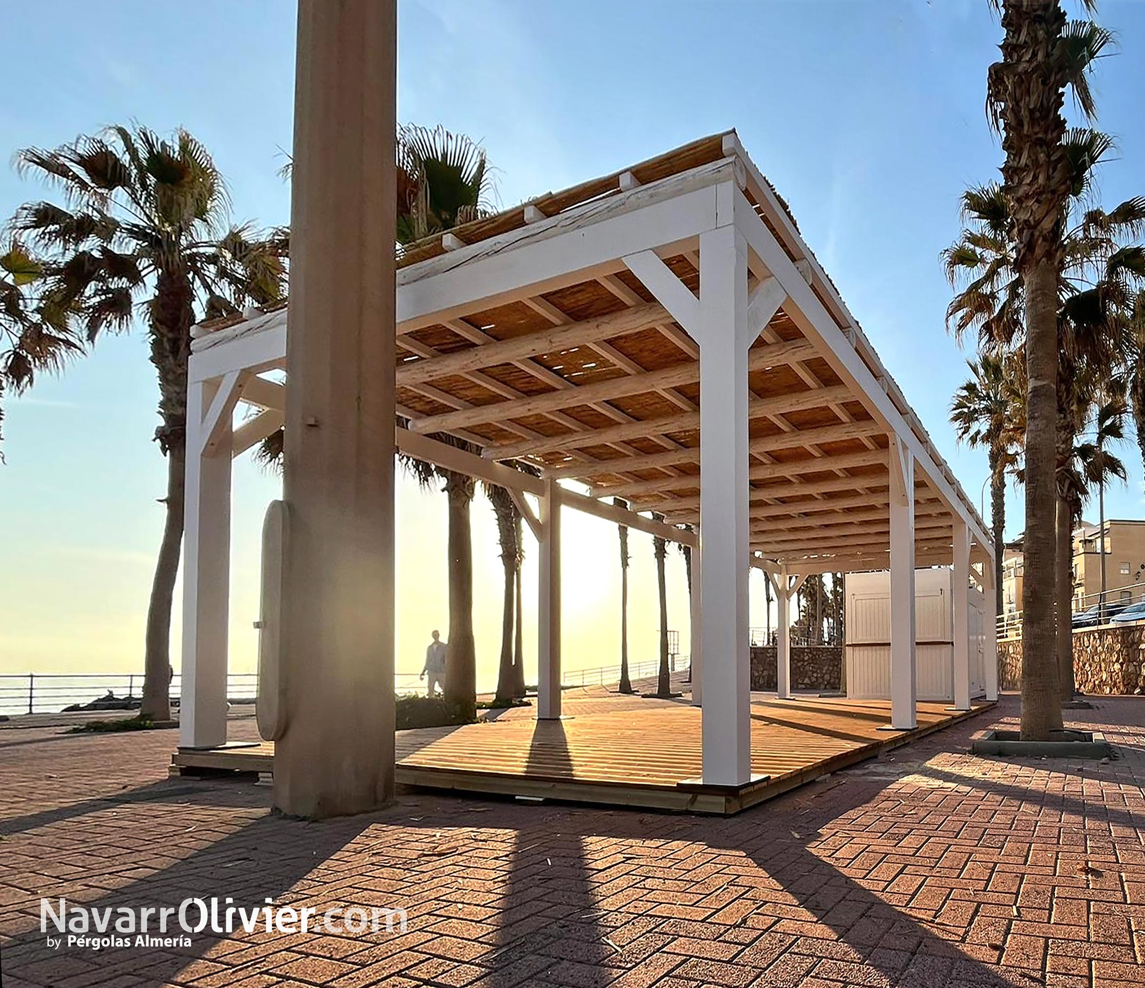 Instalamos el pavimento de tarima tratada en autoclave cubierta por una pérgola de sombra natural ventilada, construida de madera y tronco calibrado acabados en blanco con cubierta de cañizo de caña entera ecológica.