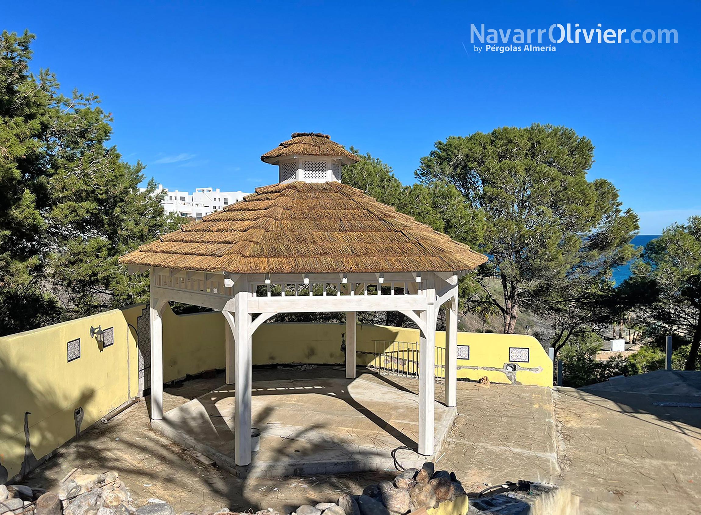 Gazebo hexagonal de madera para jardín en Macenas, Mojácar, Almería, Andalucía.