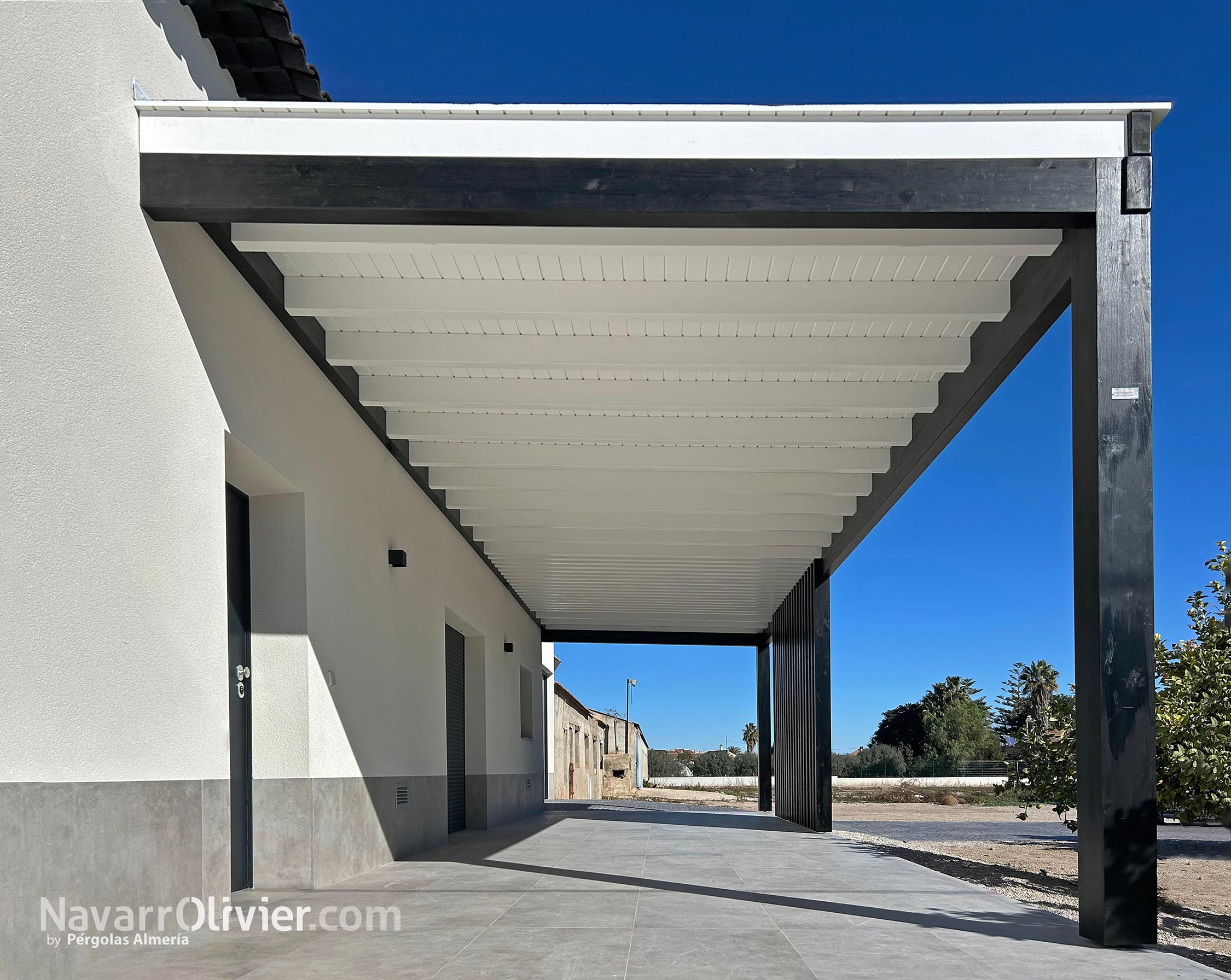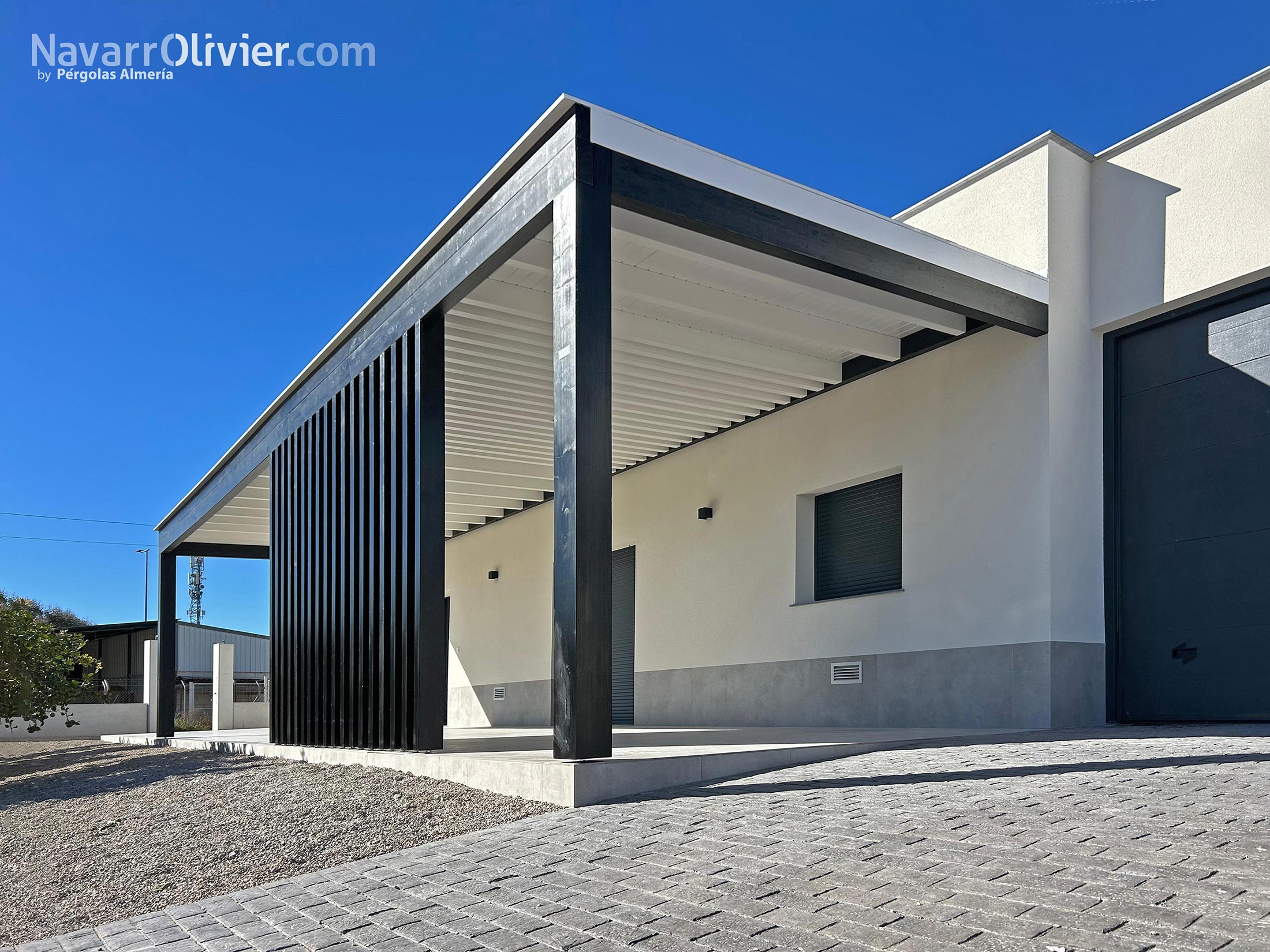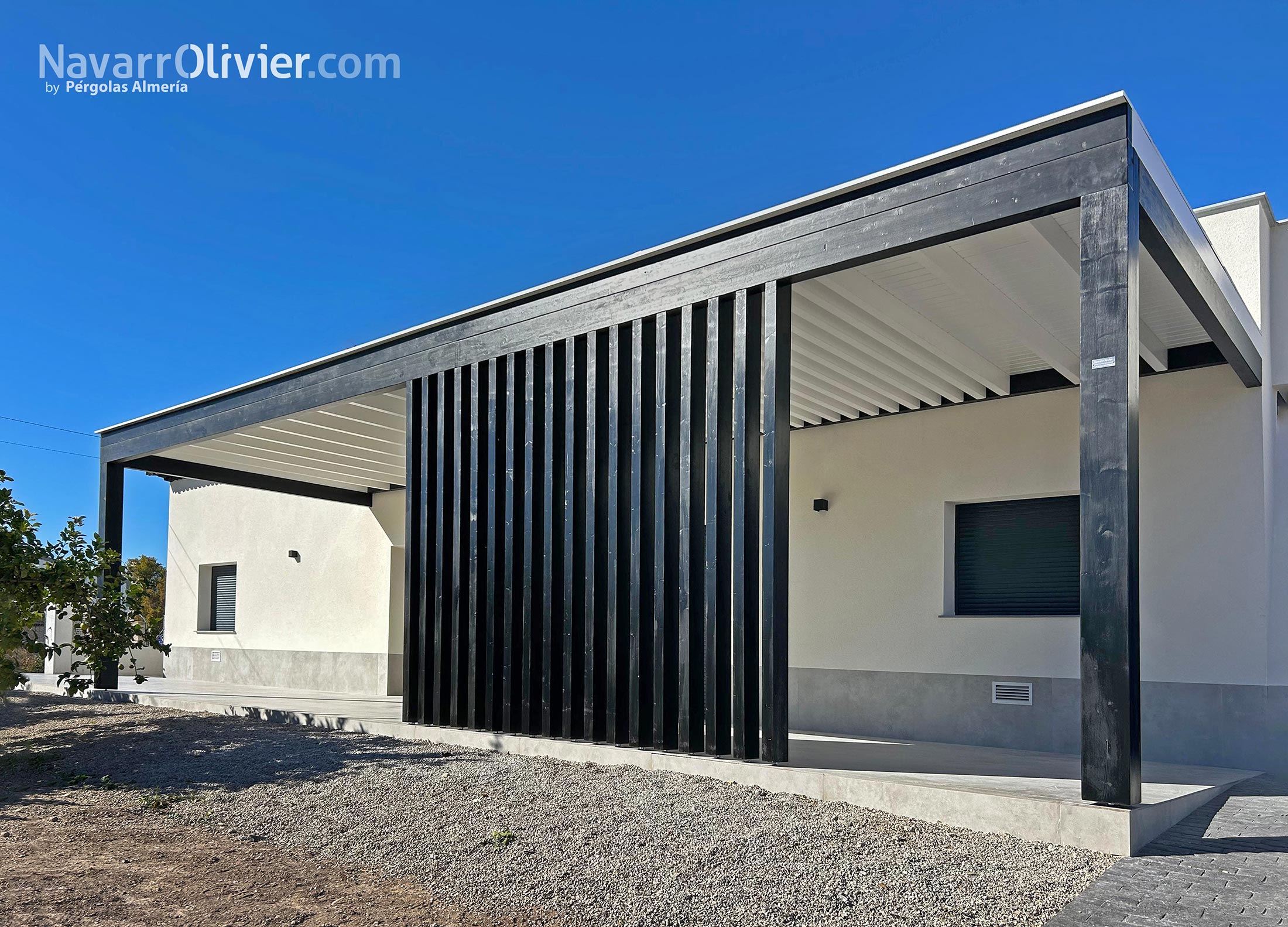 Pérgola de madera de diseño minimalista para vivienda rural en Lorca, Región de Murcia.