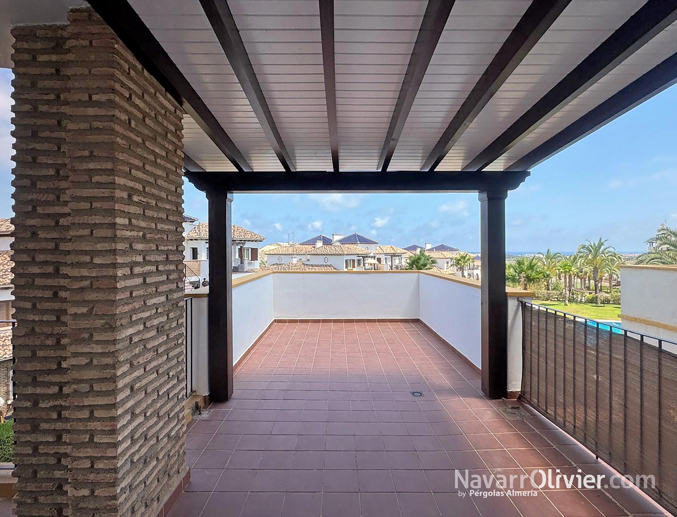 Esta pérgola de madera aporta esa sensación de calidez, acogida y un toque rústico-elegante que se integra con el estilo de la urbanización ubicada en Vera Playa, Costa de Almería.
