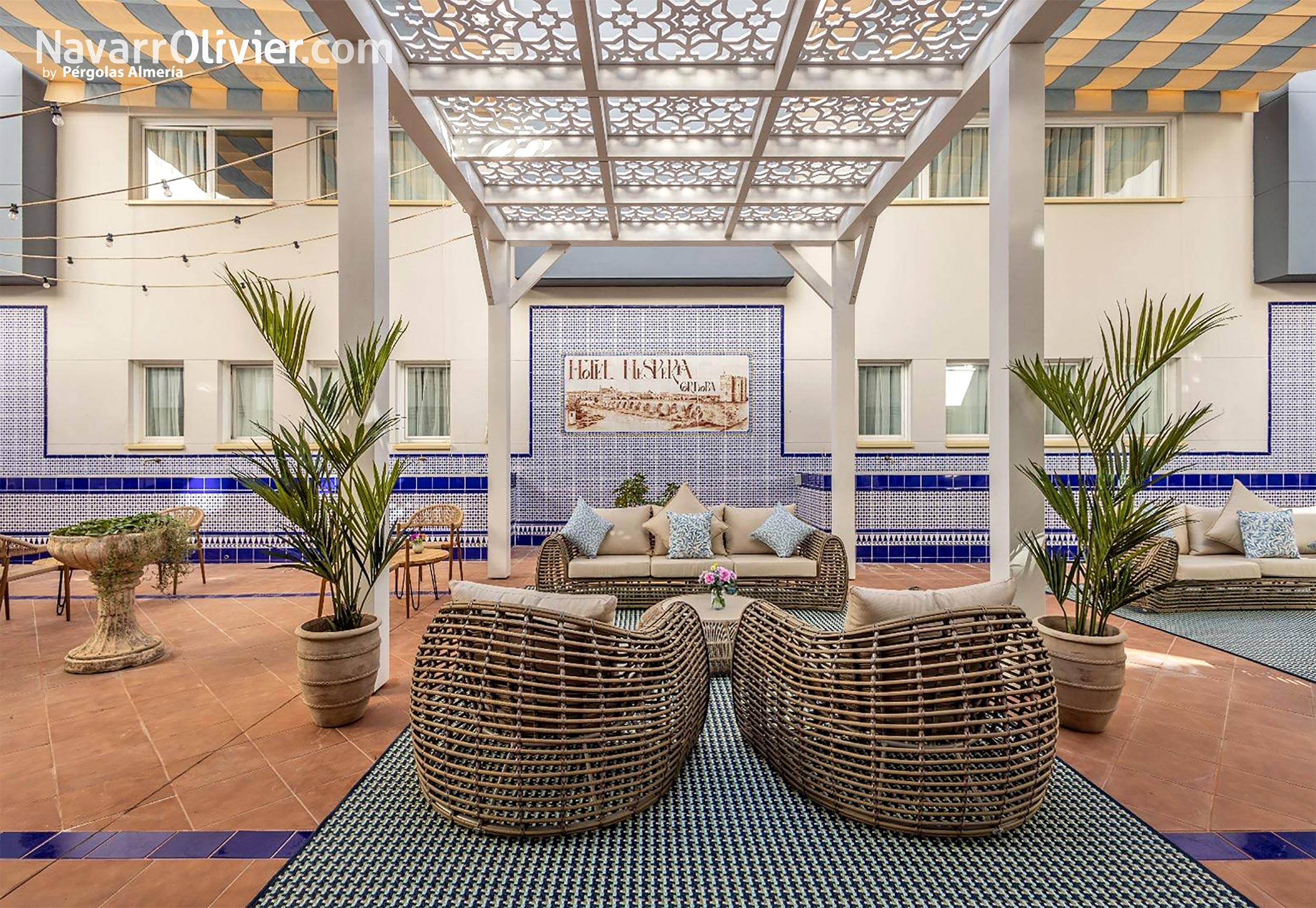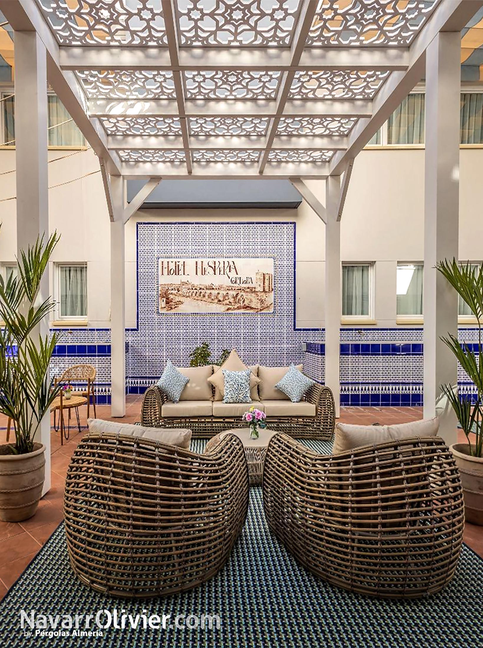 Instalamos estas pérgolas decorativas en el patio interior del Hotel Hesperia Córdoba para crear una sombra modelada, fresca y acogedora.