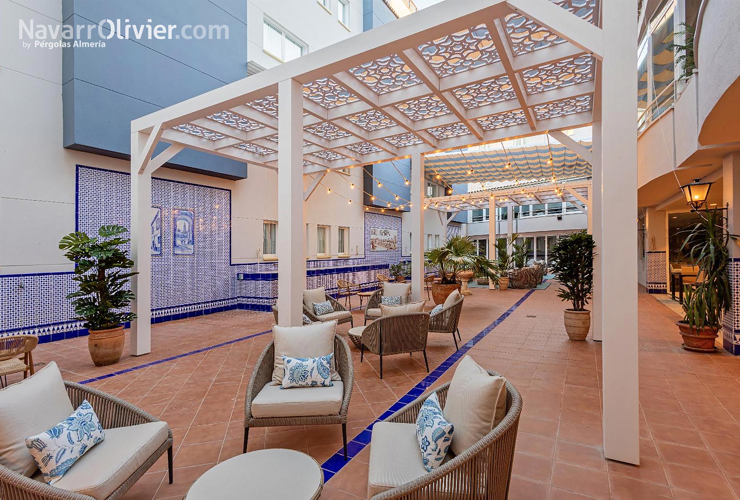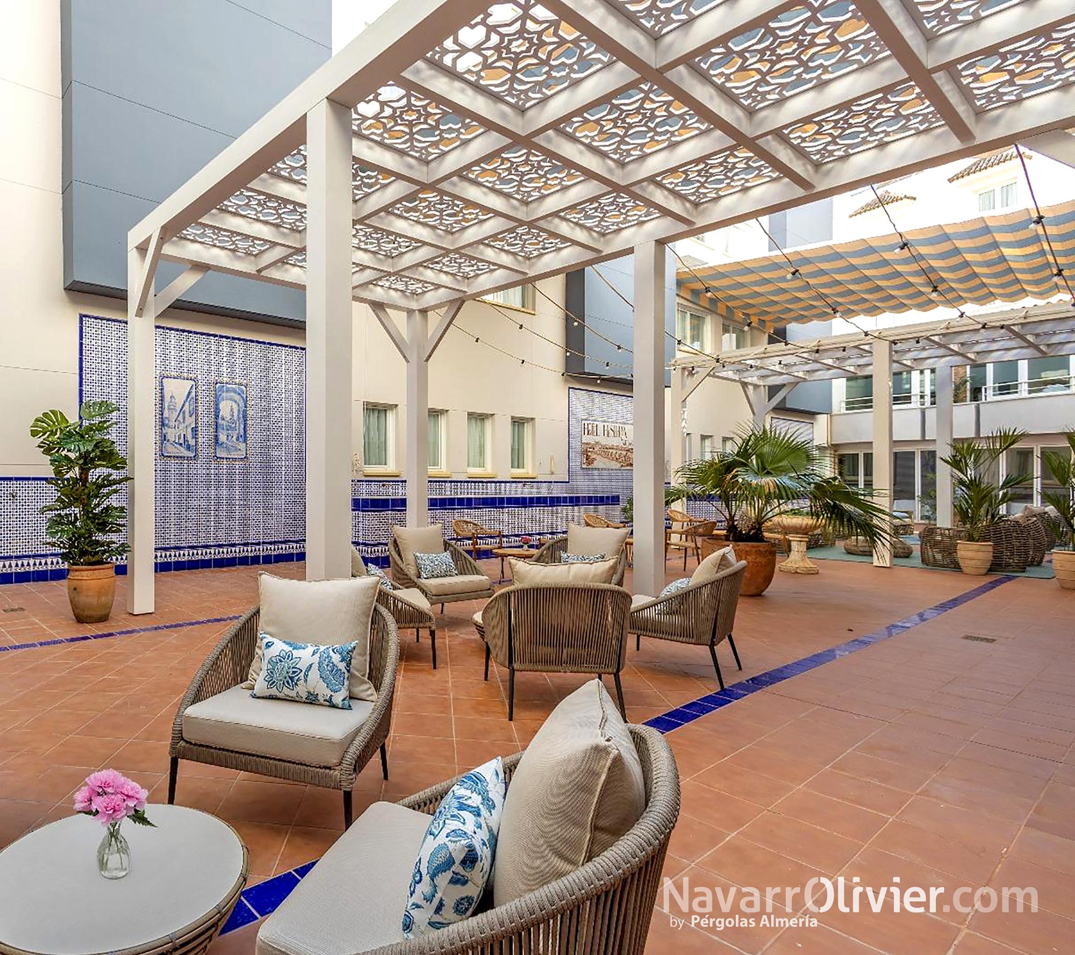 Las pérgolas se instalaron en el patio interior del hotel para crear un jardín acogedor con un diseño único marcado sin duda por estas estructuras que destacan por su cubierta formada por el entramado de la estructura y los paneles decorativos mecanizados con control numerico que refuerzan el carácter de el nuevo espacio.